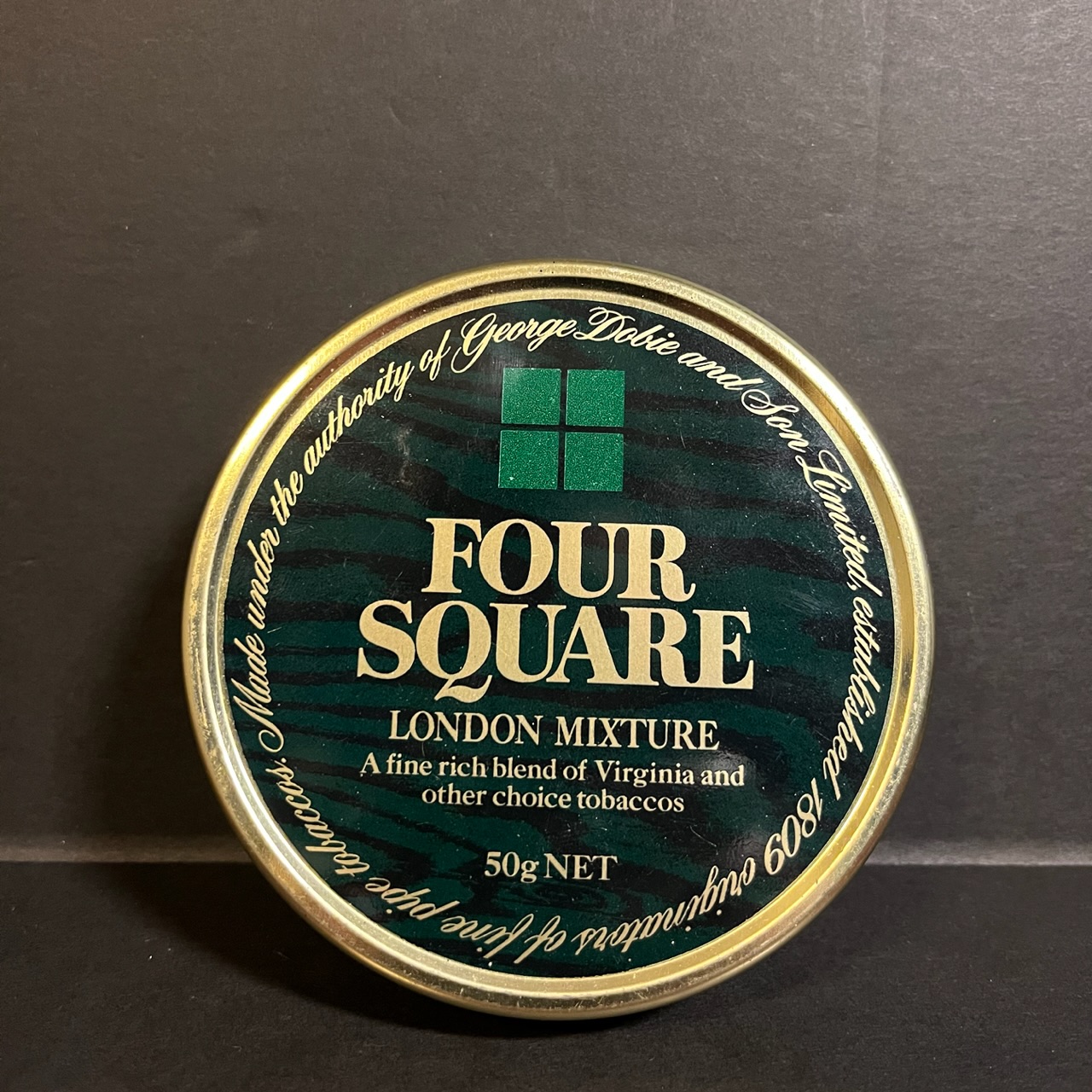 A 50g tin of Dobie’s Four Square London Mixture. Tin has very light shake, seal appears intact.