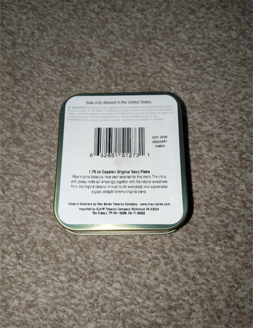 Auction is for a sealed tin of Capstan Blue Flake with just about 5 years age on it. (Nov. 2022)