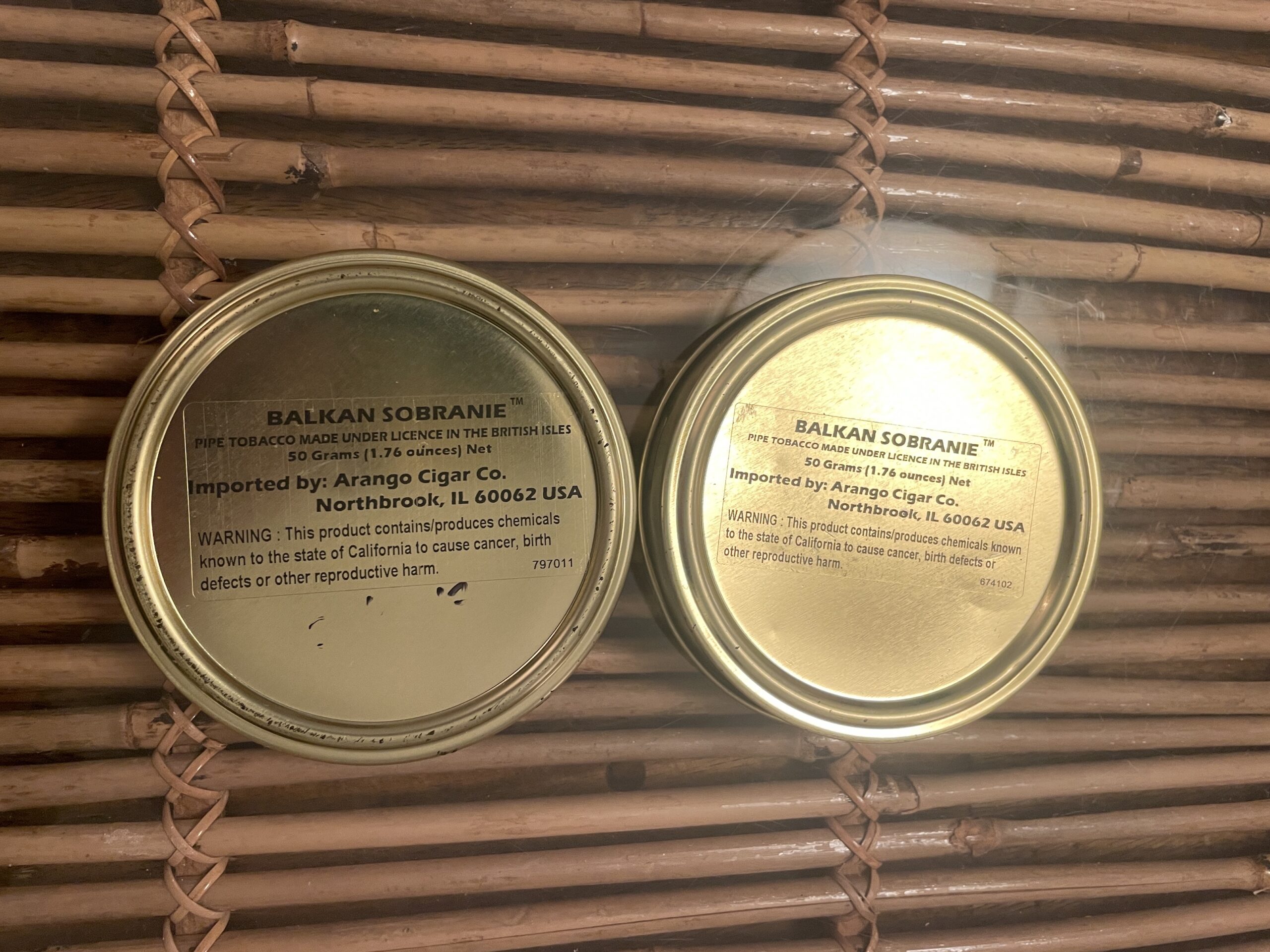 two balkan sobranie old-style (dimpled bottom) tins from 2016 and 2017.