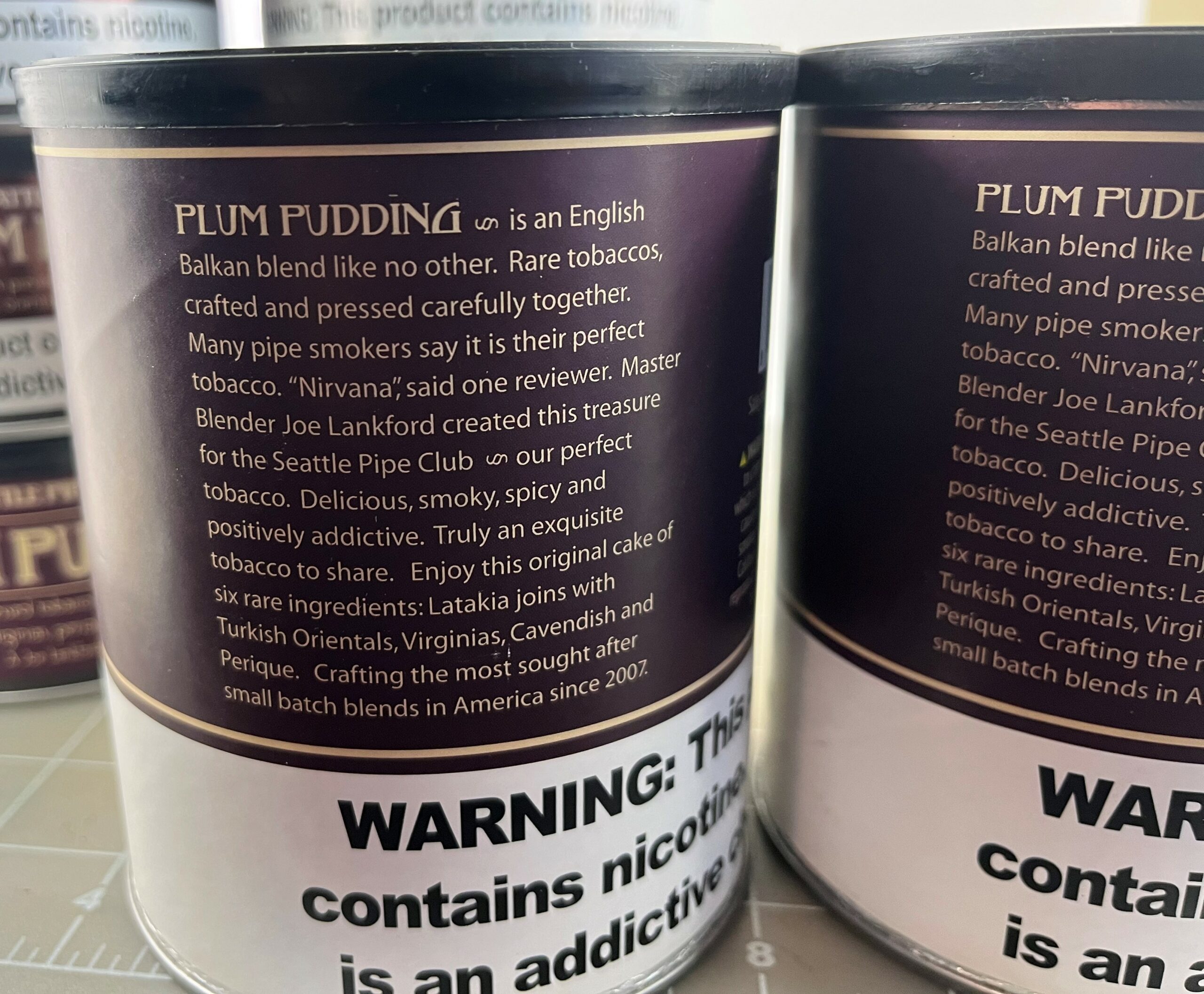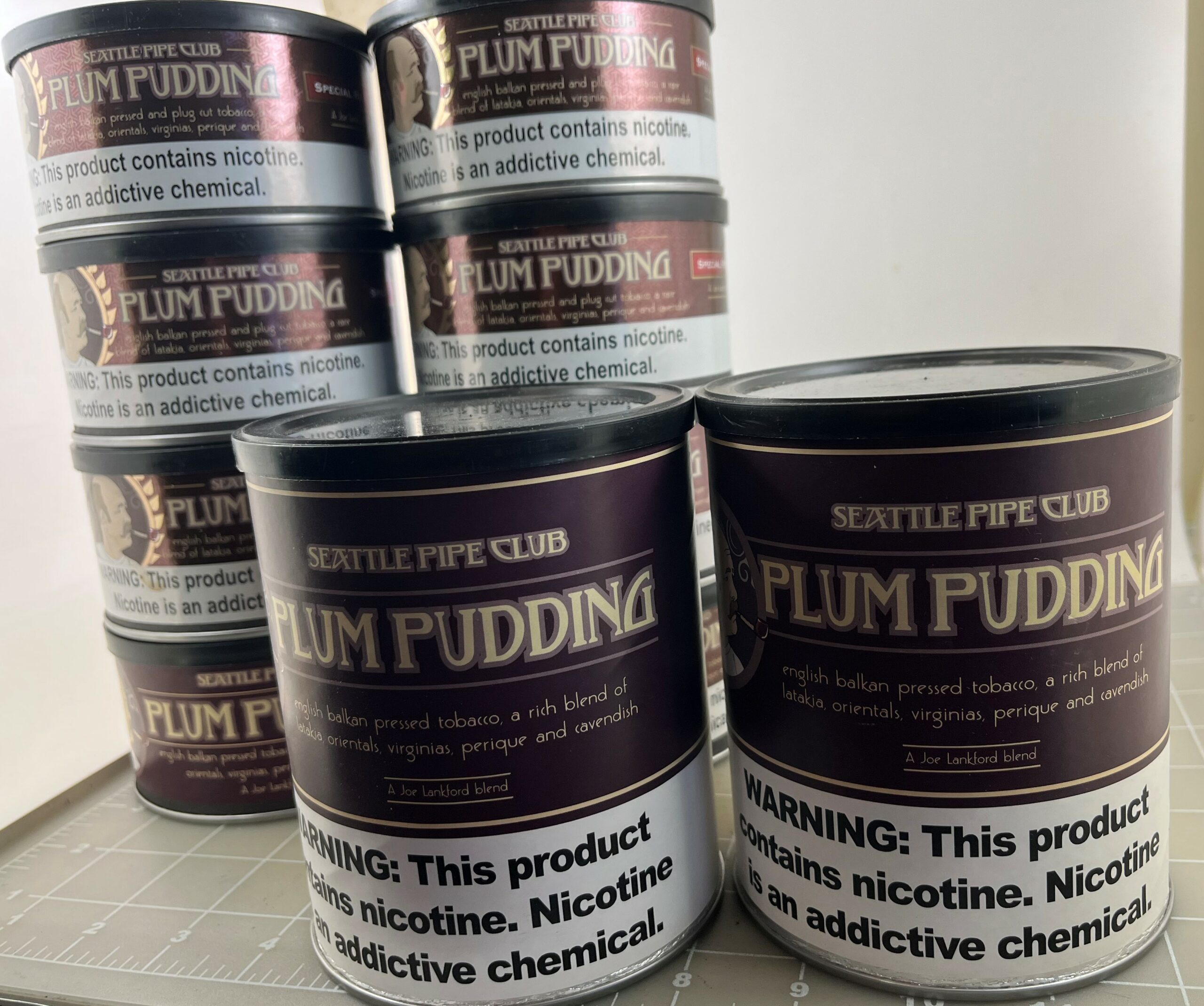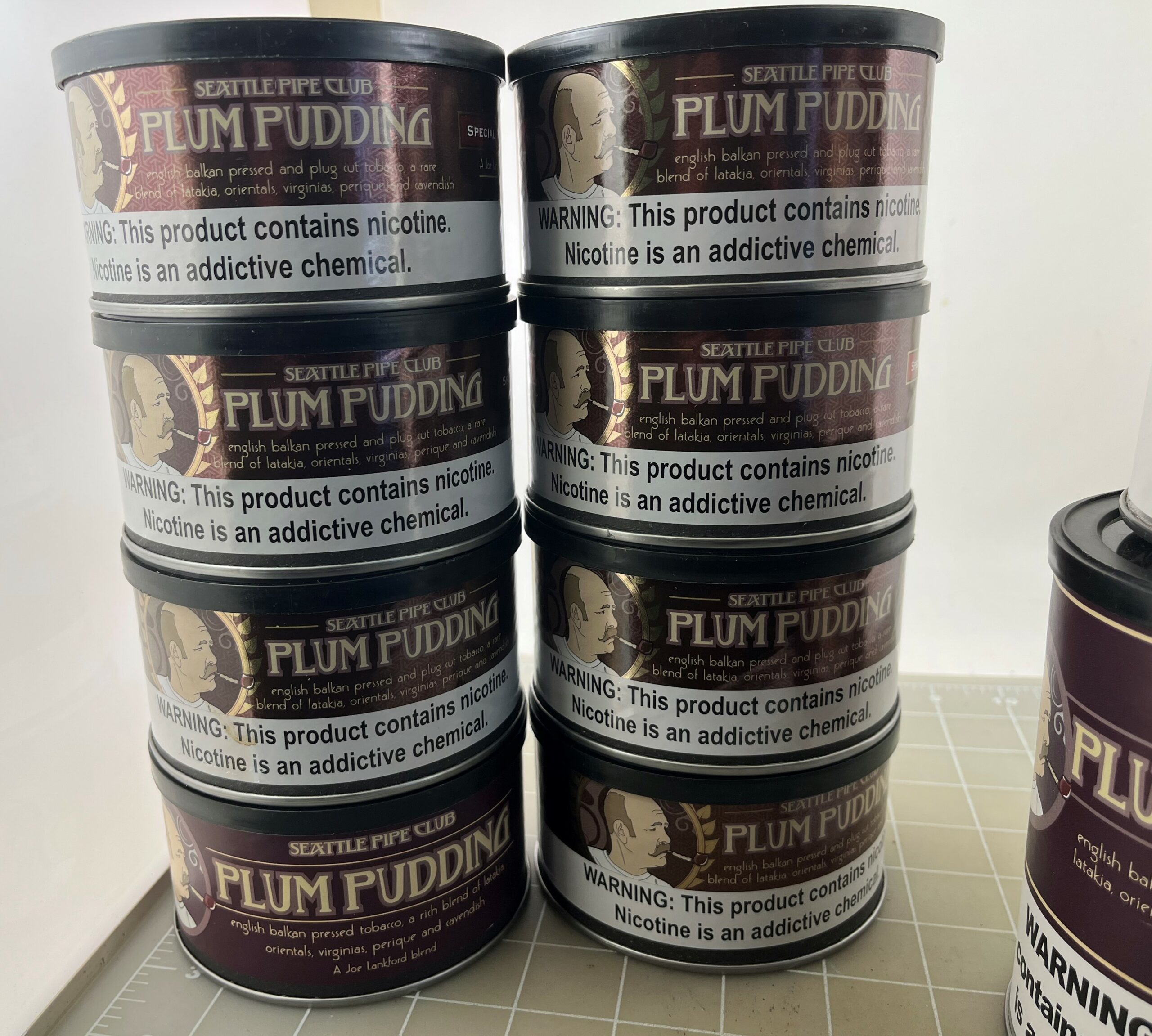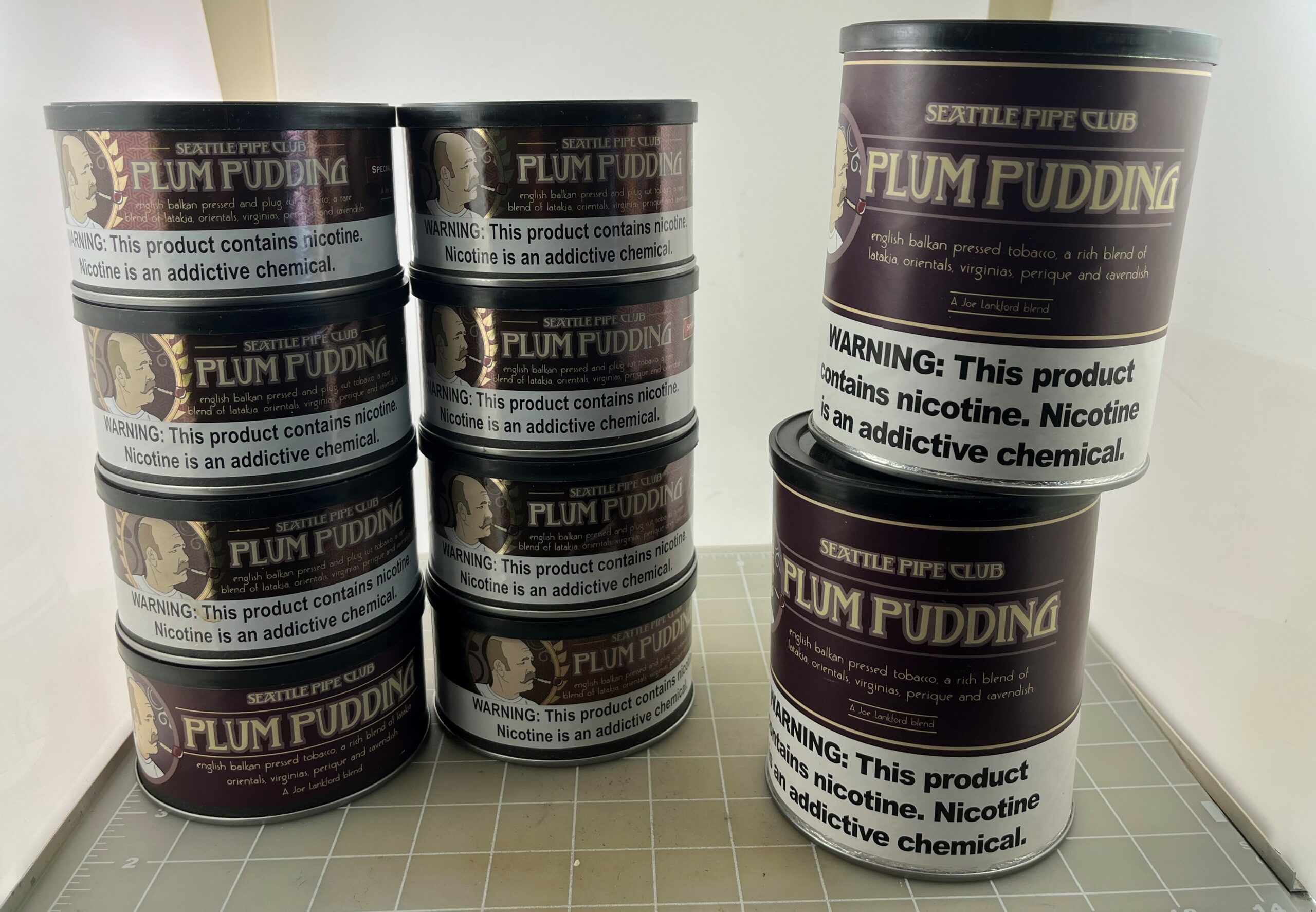 Lot of 10 Sealed Seattle Pipe Club Plum Pudding Tobacco Tins - 2 - 8 oz. Tins & 8 - 4 oz. Tins. Excellent Sealed Tins!