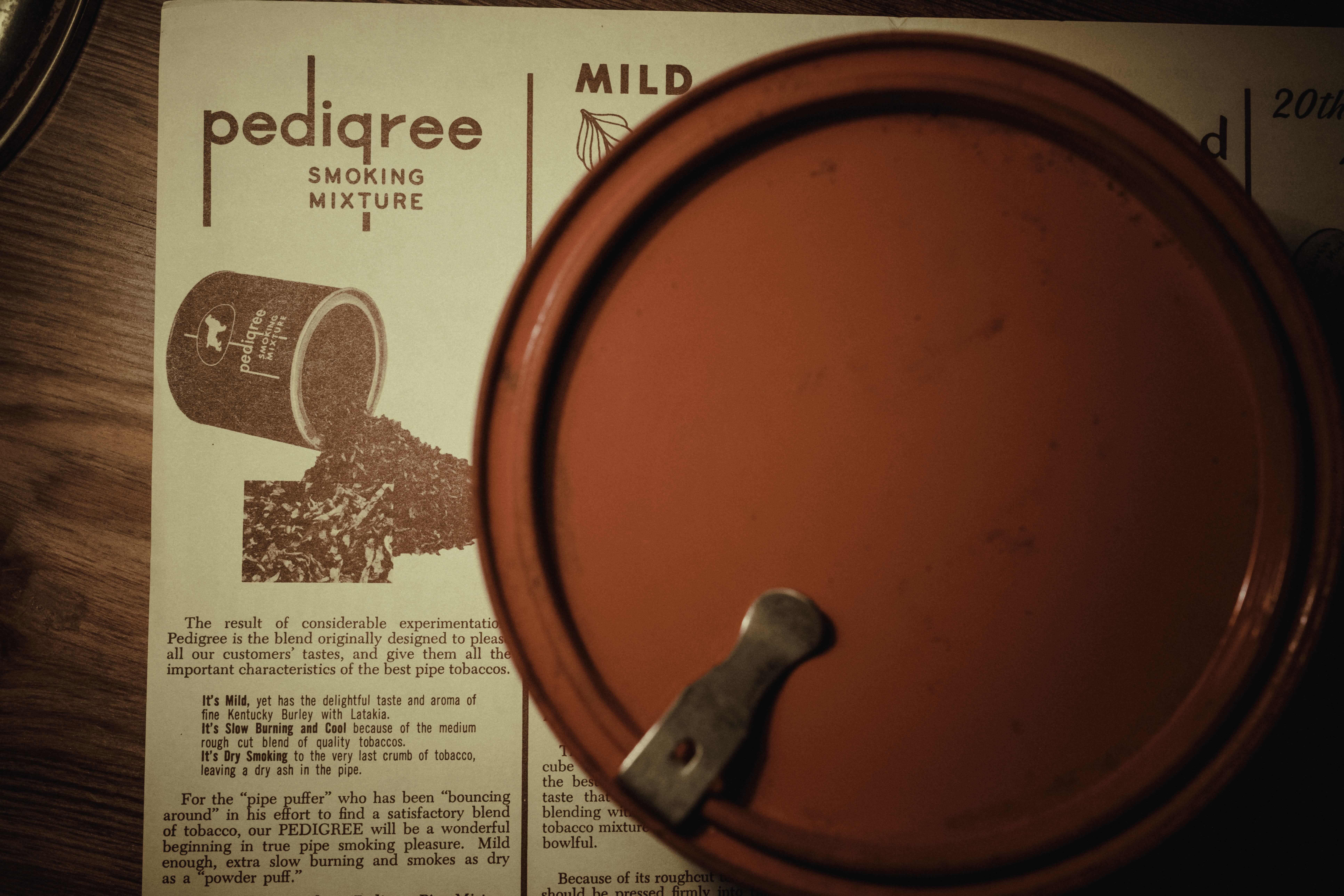 Pedigree is an American-English mixture, built on mellow Kentucky Burley enriched by the rich savor of Syrian Latakia, rounded with select Virginia and other fine tobaccos. Smokersā Haven described it as ācool and mild⦠slow burning and dry smokingā ā a comfortable mixture that āfits like that old pair of slippers or your favorite chair.ā Its appeal was universal: for the novice, a friendly beginning; for the seasoned smoker, a dependable companion bowl after bowl.
