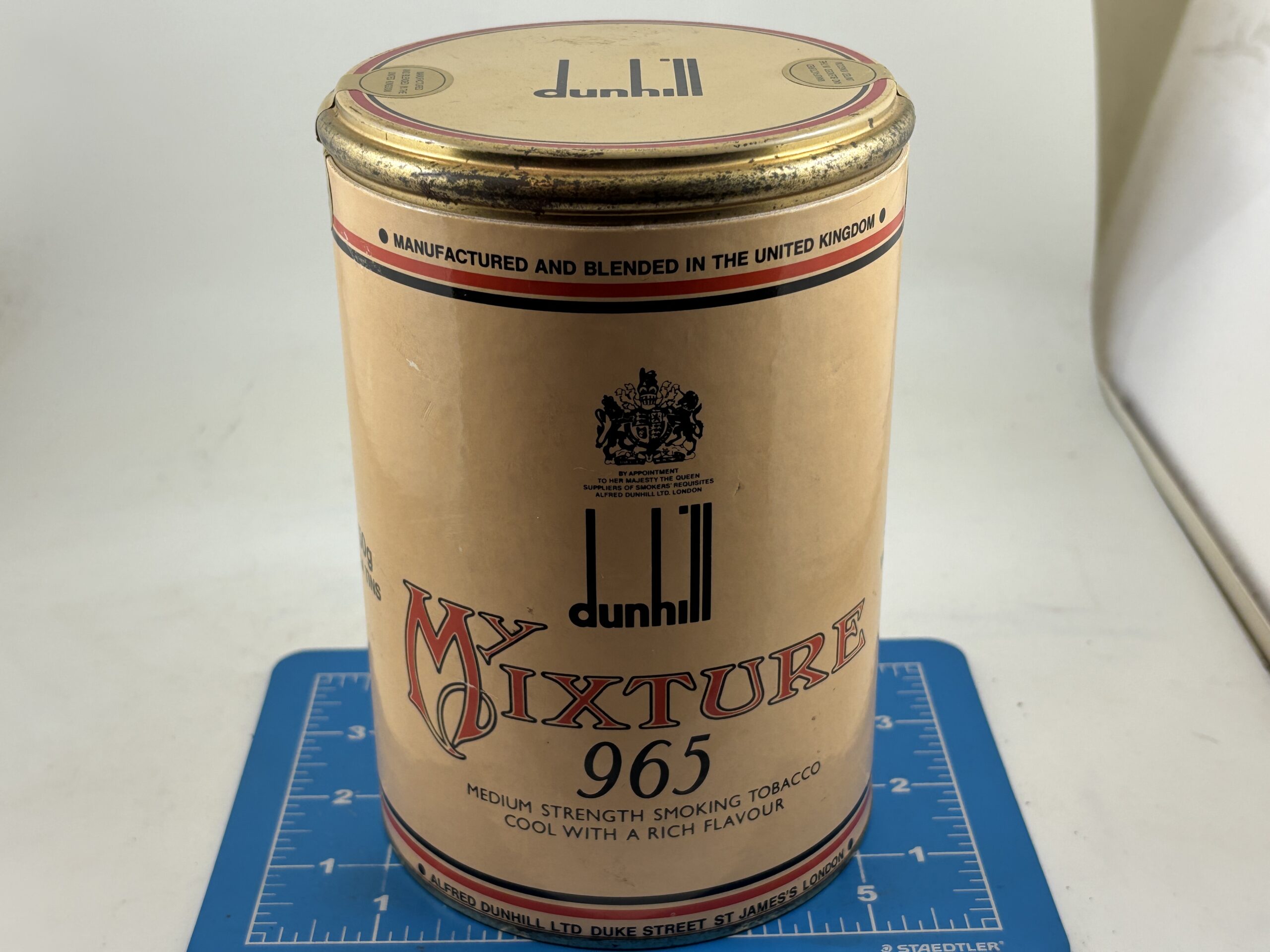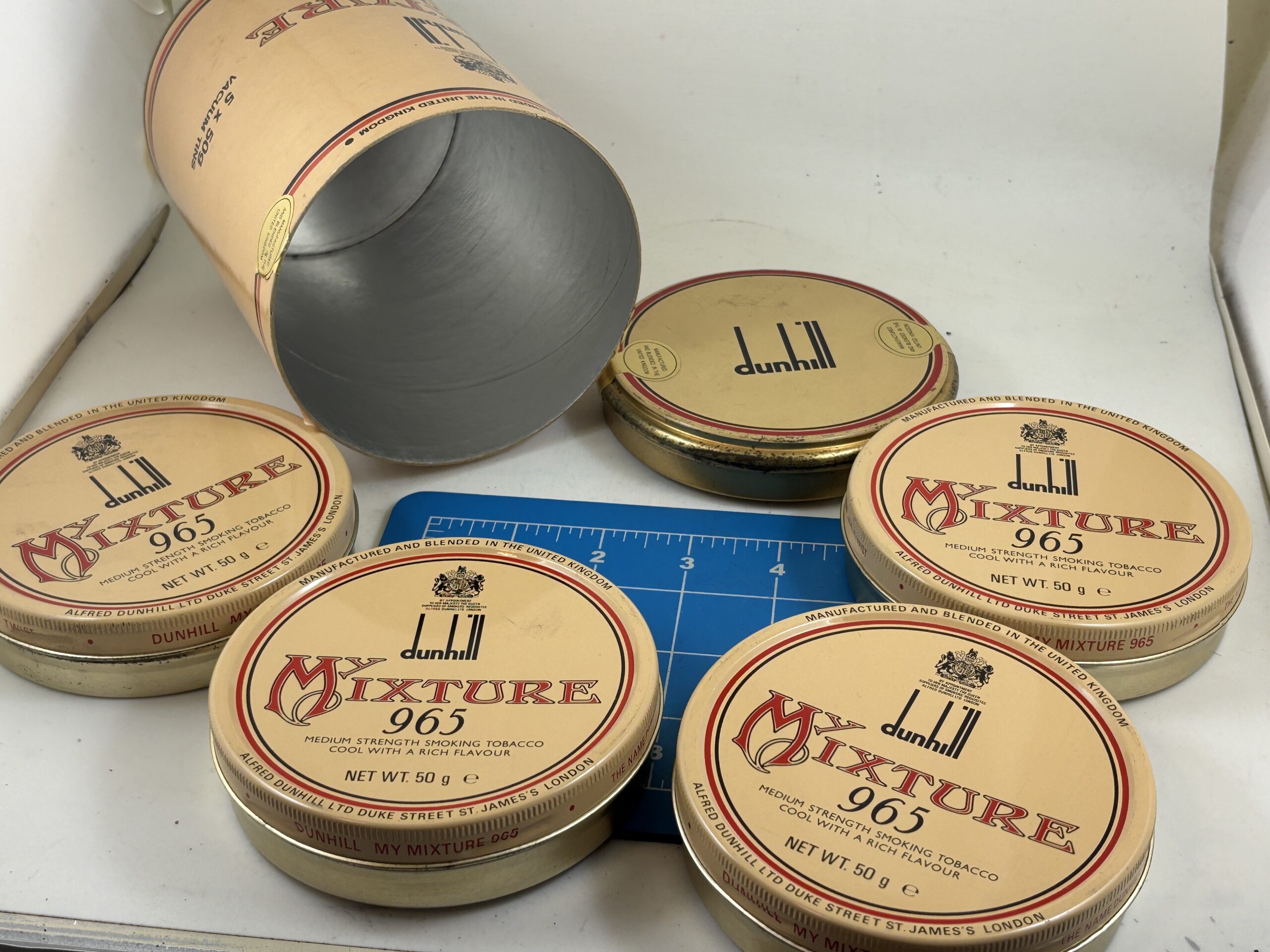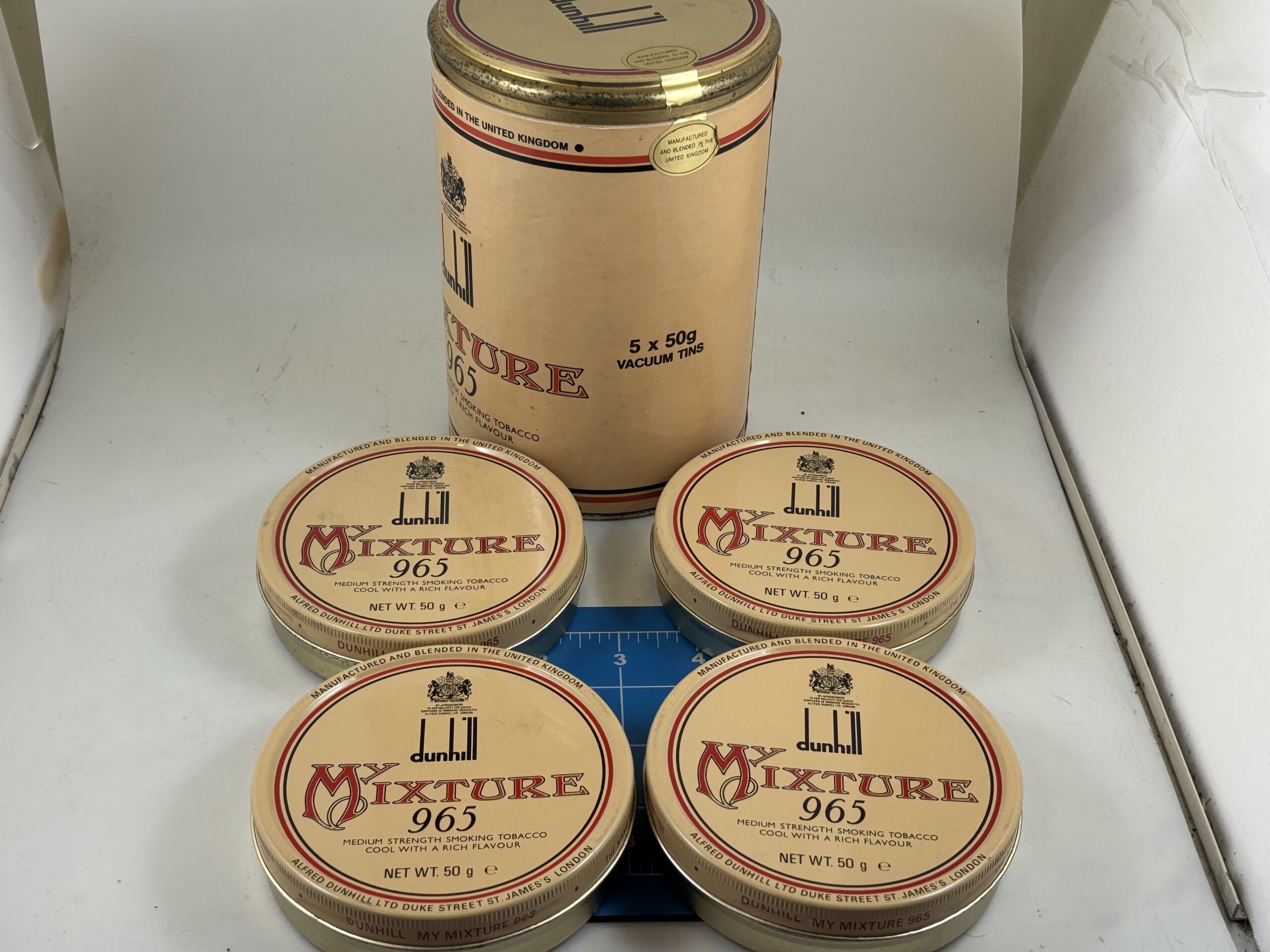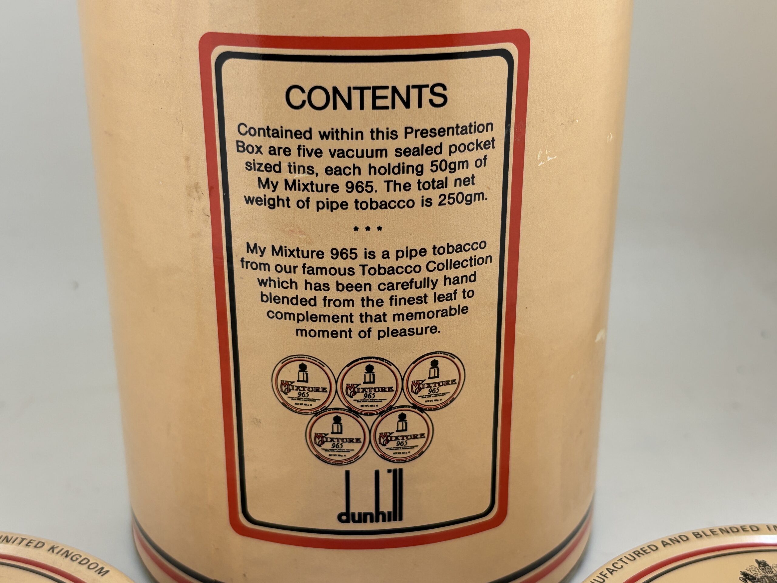 Very Nice Condition. No tobacco. 4 empty tins. This came with 5 sealed 50g. tins when purchased back in the day.