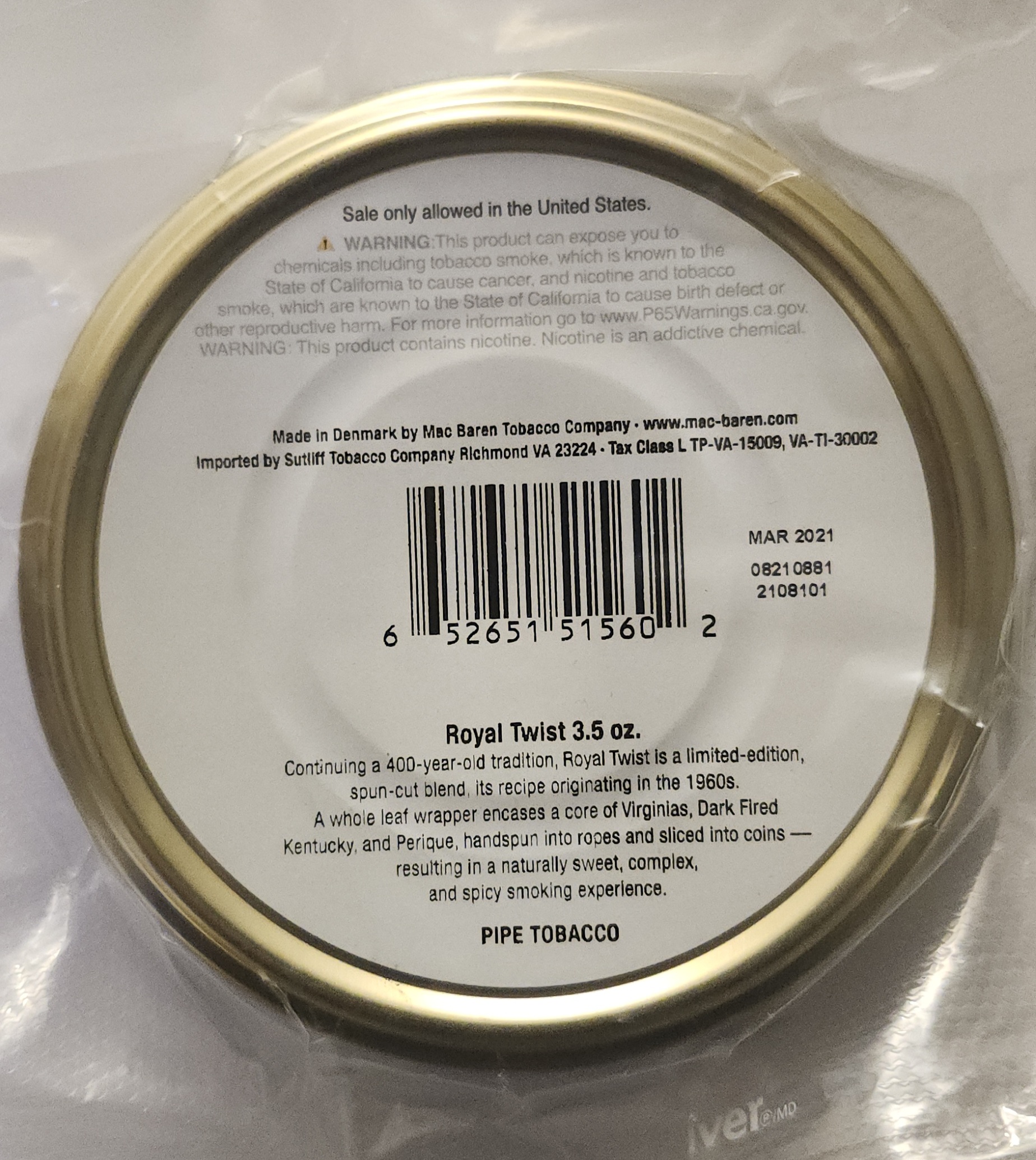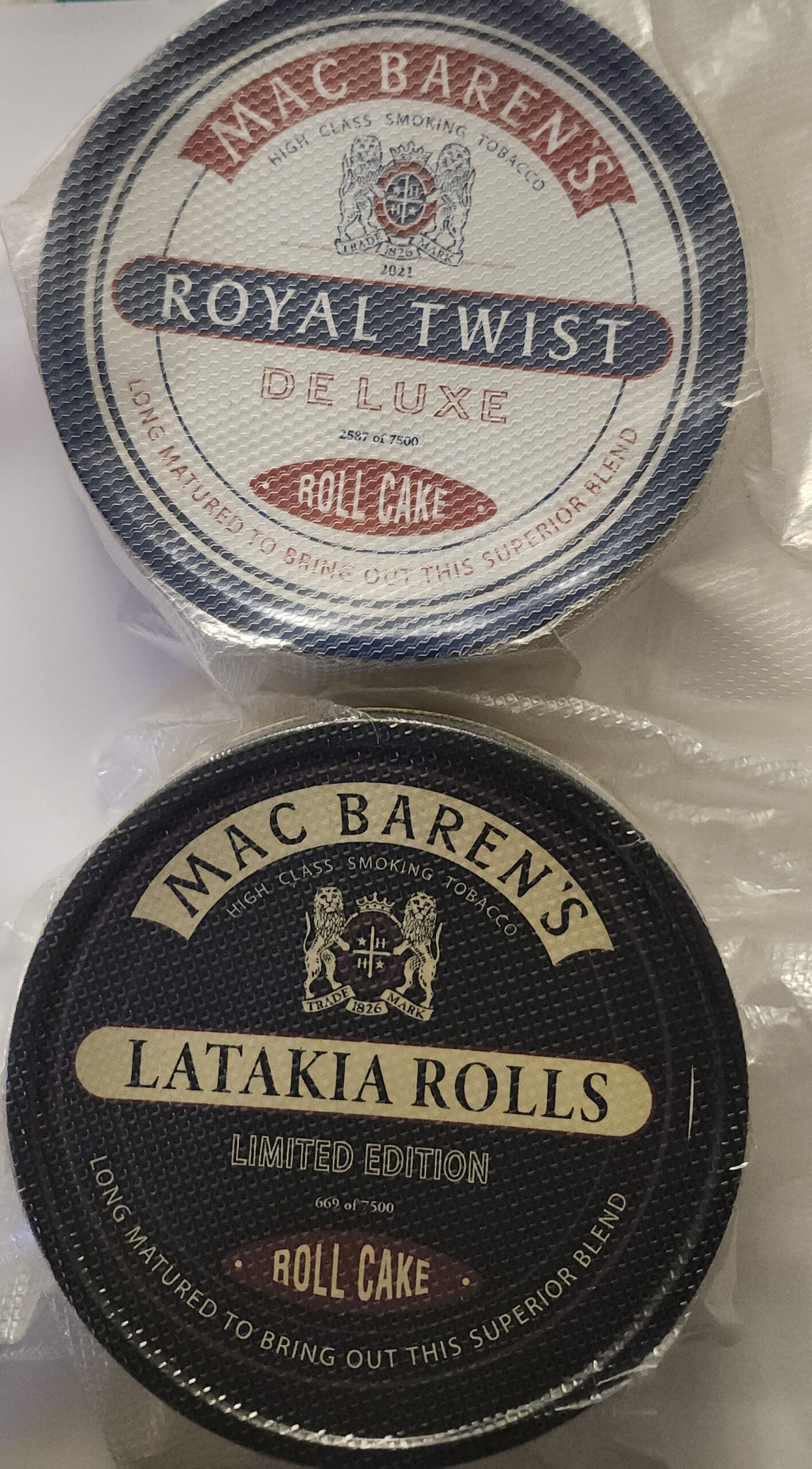 Mac Barens Latakia Rolls and Royal Twist De Luxe in sealed bag, and kept in climate controlled cellar. 3.5oz each.