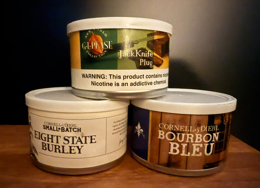 Three unopened tins from 2021 of Cornell & Diehl Bourbon Bleu, Eight State Burley, JackKnife Plug