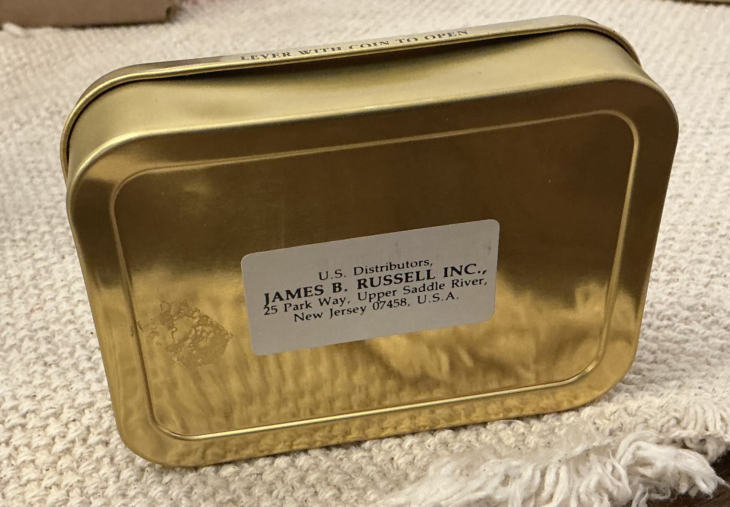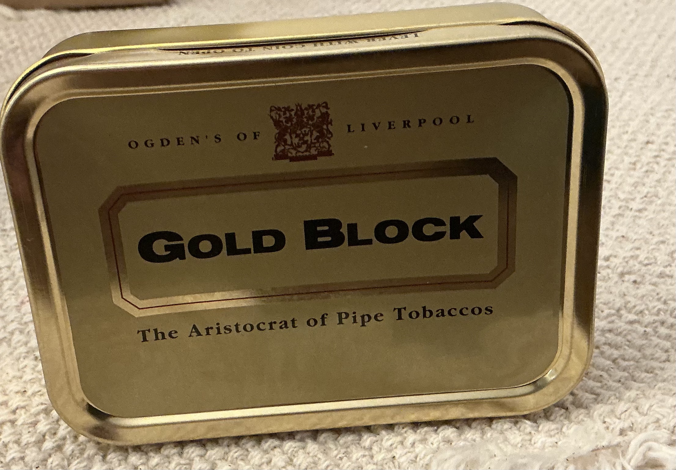 Sealed tin of Gold Block from Ogdens of Liverpool. Made in England. 50g At least 20 years old, when it was distributed by James B Russell