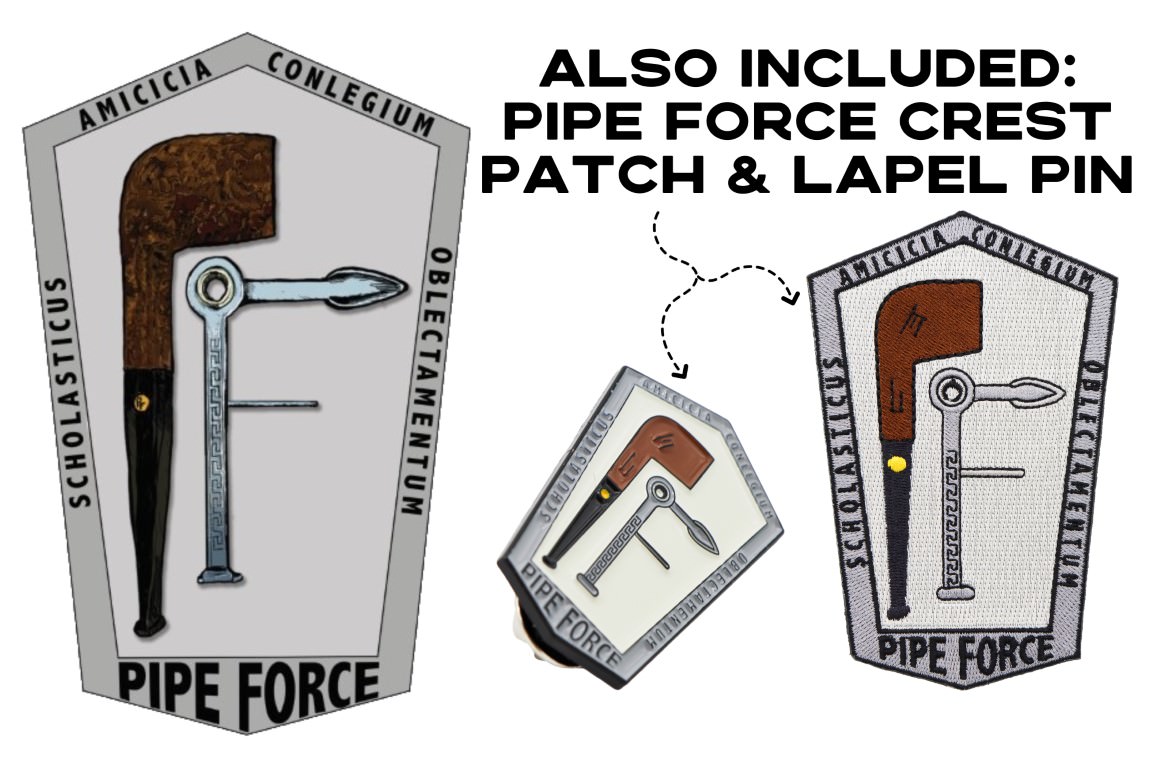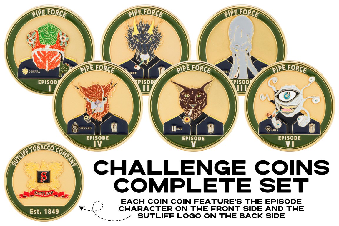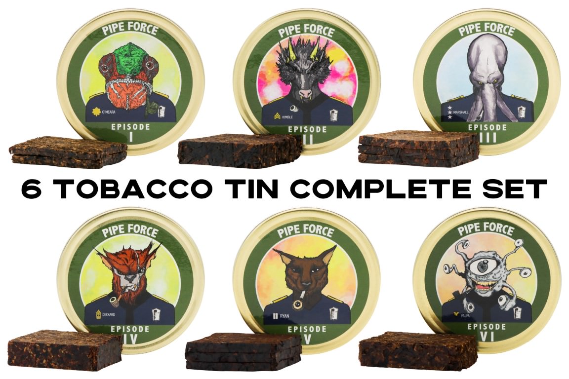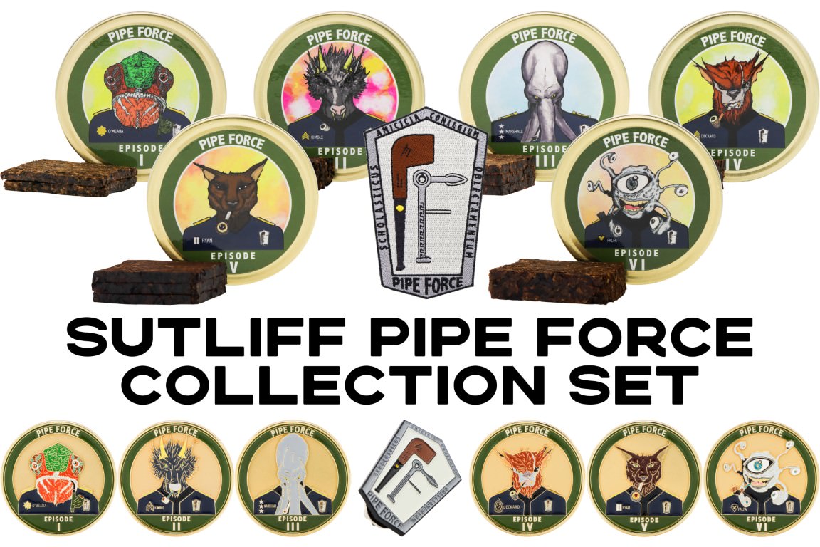 This was a very limited set of Sutliff Pipe Force blends that was offered. Along with Pipe Force Episodes 1 through 6 (each with a coin inside), the set also includes a Pipe Force crest patch and lapel pin. Each tin in this set is guaranteed to contain a challenge coin, which outside of this set were only placed in 1 in every 10 tins.