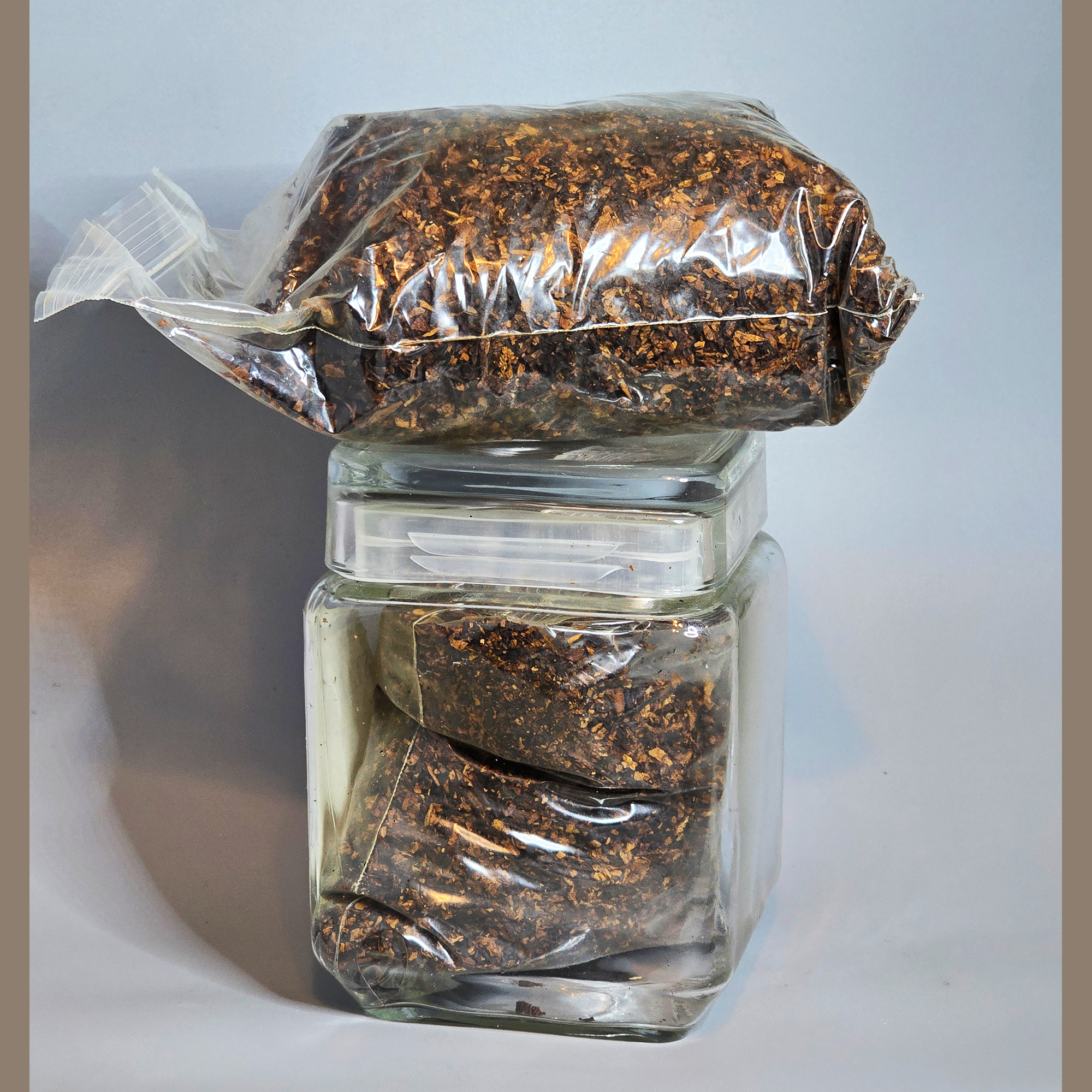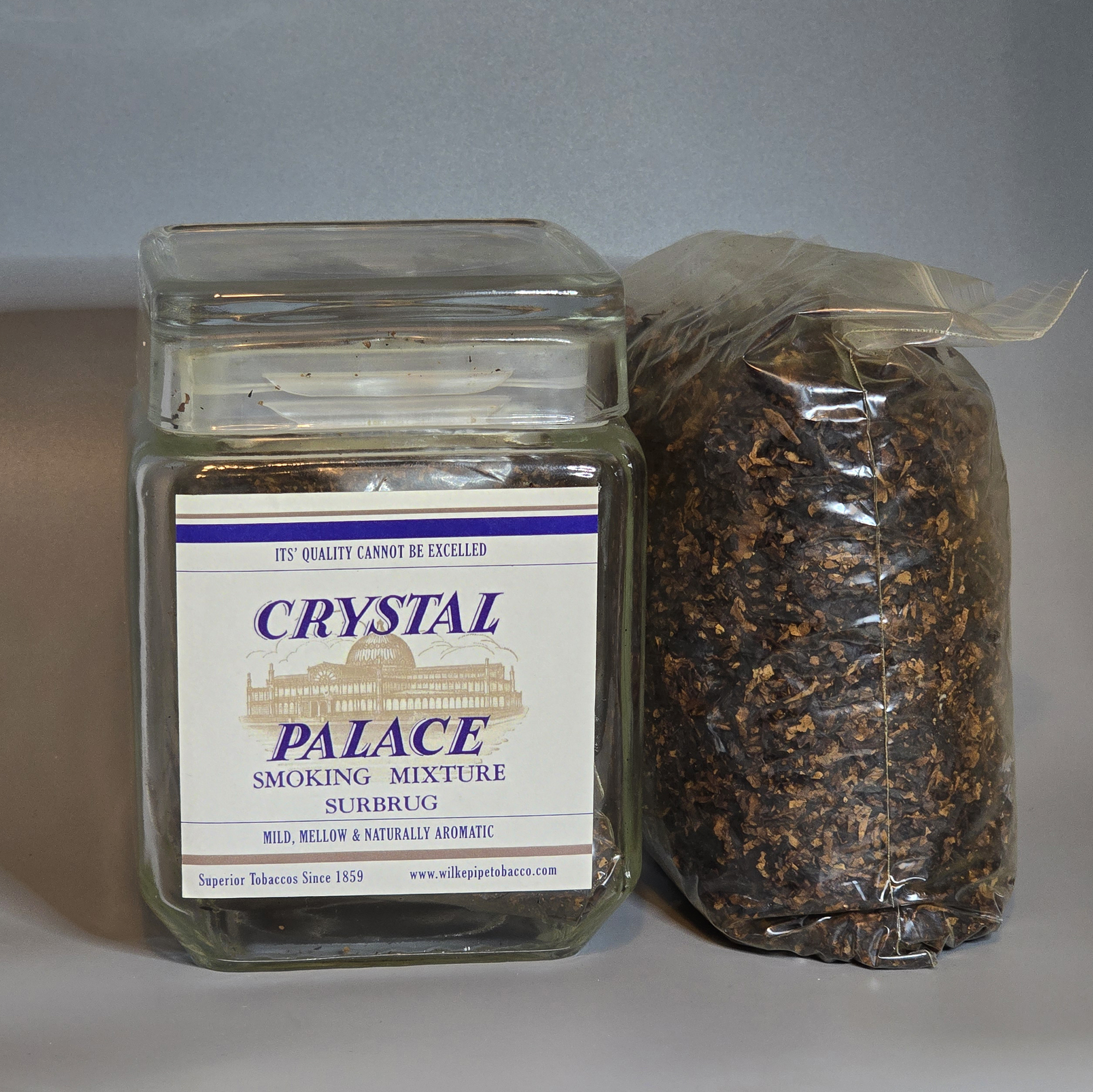 WILKE'S CRYSTAL PALACE SMOKING MIXTURE SURBRUG is a mild mellow and naturally aromatic blended since 1859. Virginia and latakia base with a touch of perique, black cavendish, and burley ribbon cut. This tobacco was blended by John Brandt. There were 2 jars, but one broke in shipping, leave the 16 oz bag and the full 16 oz glass jar intact for a total of 32 oz of prime tobacco. There is no date on the jar/bag.