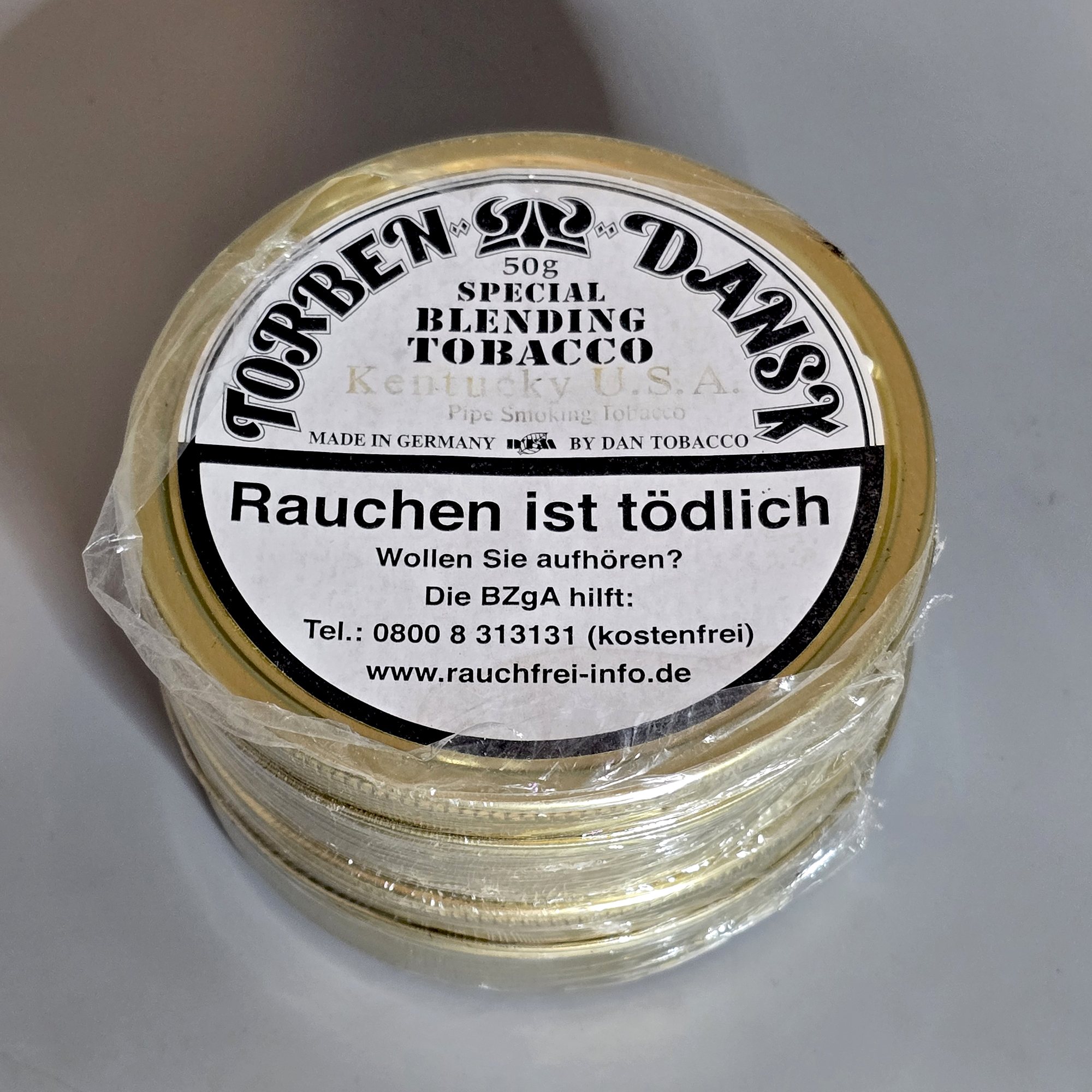 Torben Dansk Special Blending Tobacco Kentucky USA is a burley based pure American Kentucky. Extraordinary, unequalled, to use with a dropper. Blending tobacco, you can smoke it even straight, but it is extremely strong, but excellent. There are 2 sealed 50g tins still in shrink wrap. While I can't verify the date, I believe it's at least 3-4 years old.