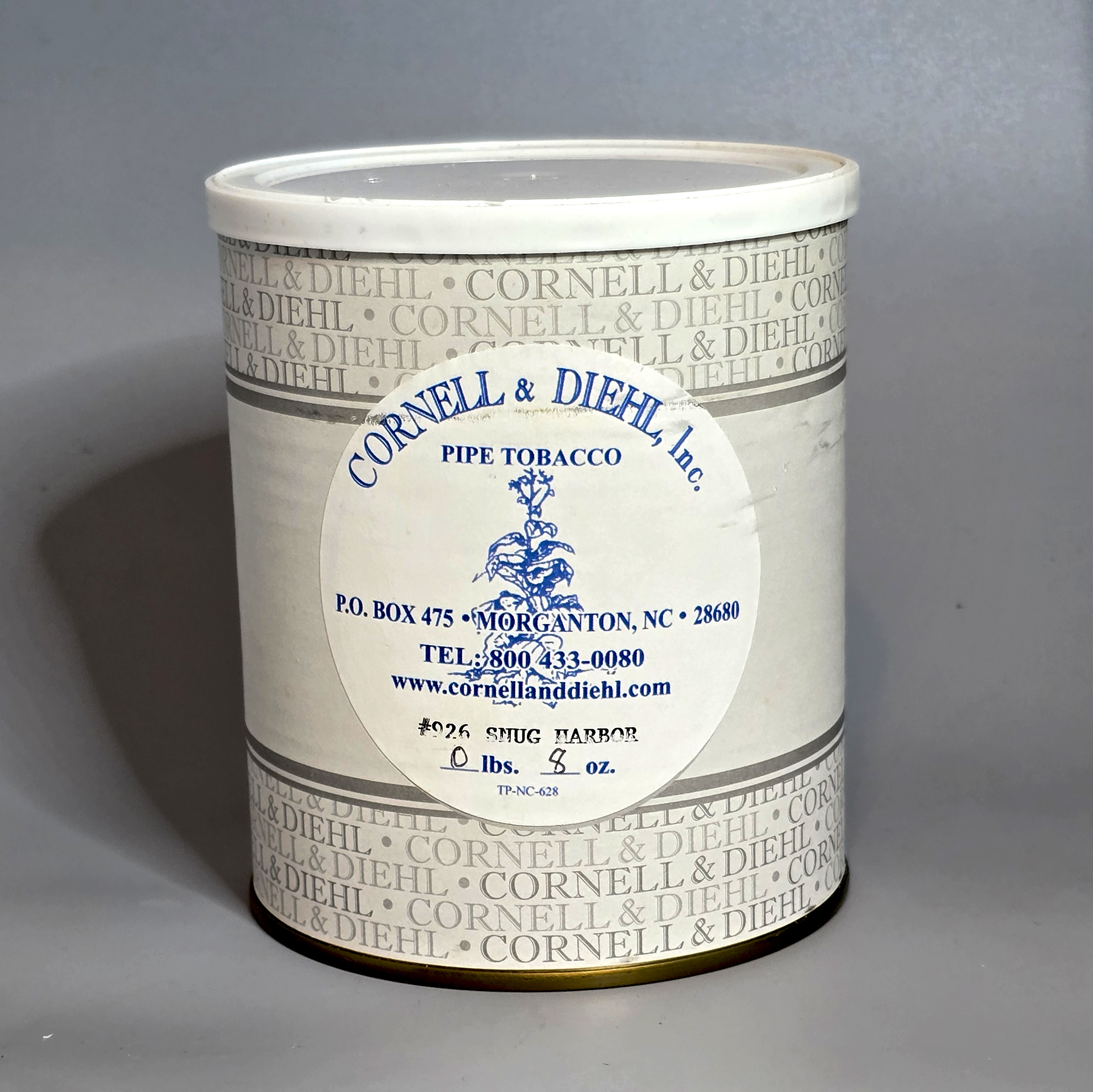 This is a sealed 8 oz tin of Cornell & Diehl's #926 Snug Harbor. It is a delicious blend of Burleys, Turkish, Latakia, and Perique with just a hint of flavoring to enhance the natural sweetness and room note.