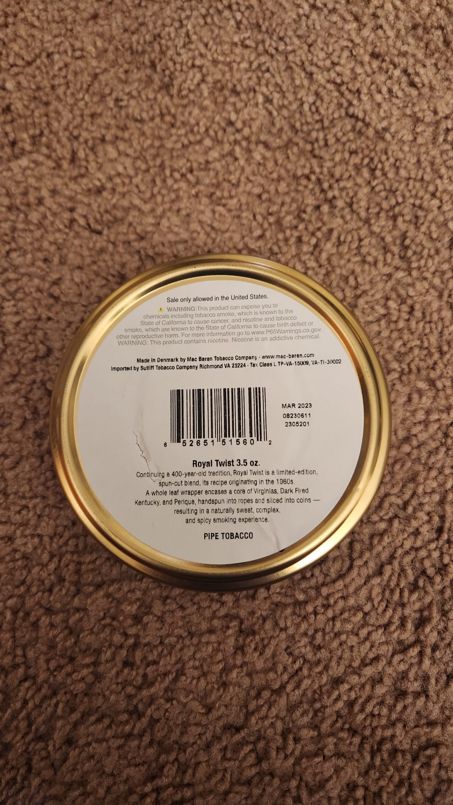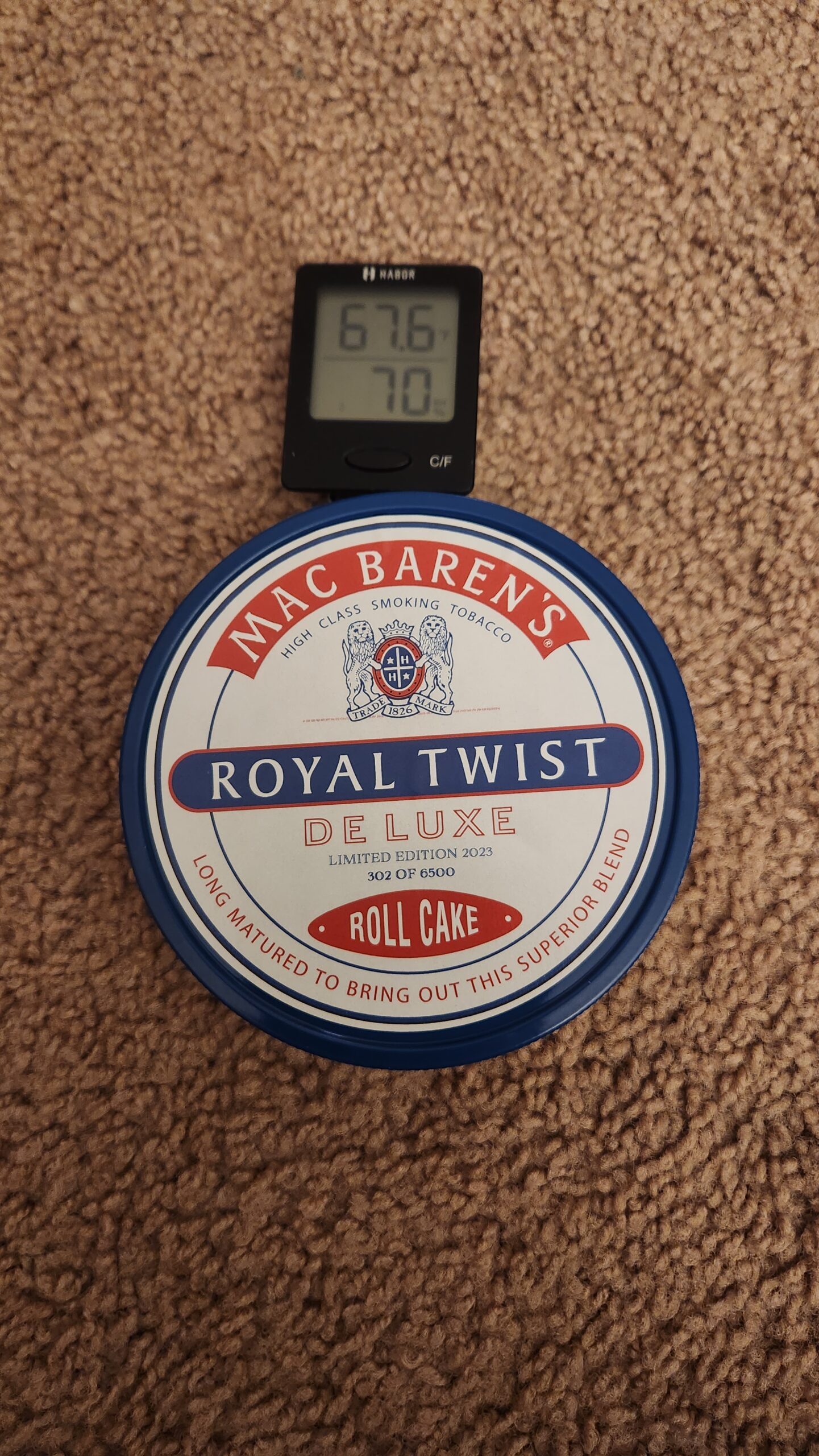 A seriously true gem of a tin! This is Mac Barens ROYAL TWIST DELUXE ROLL CAKE. Limited edition from 2023 and this particular tin is number 302 of 6500. It is a single tin of 3.5 oz..From my personal climate controlled cellar as you can see. ..this is A real and extremely rare treat to have in the cellar today.