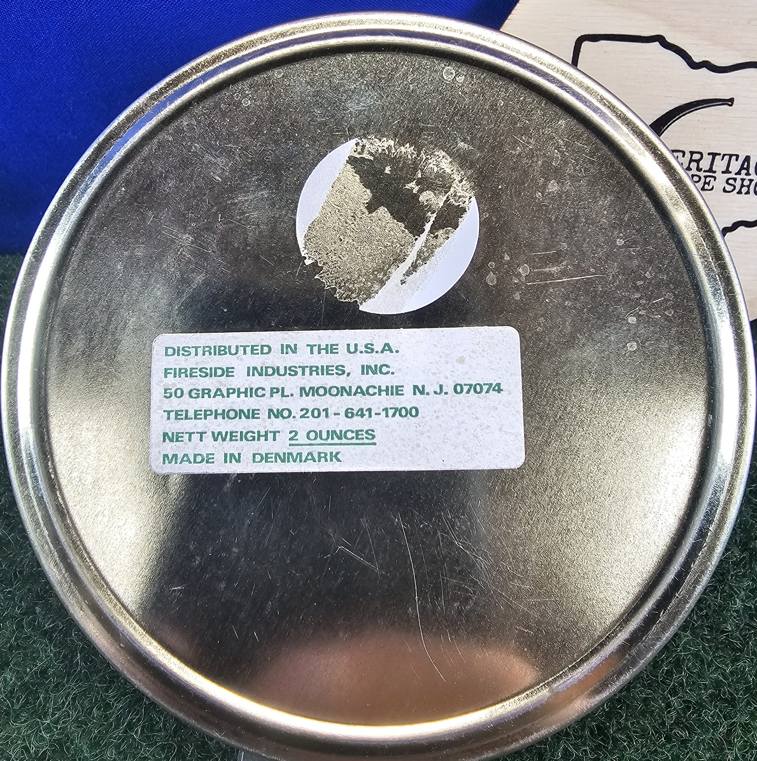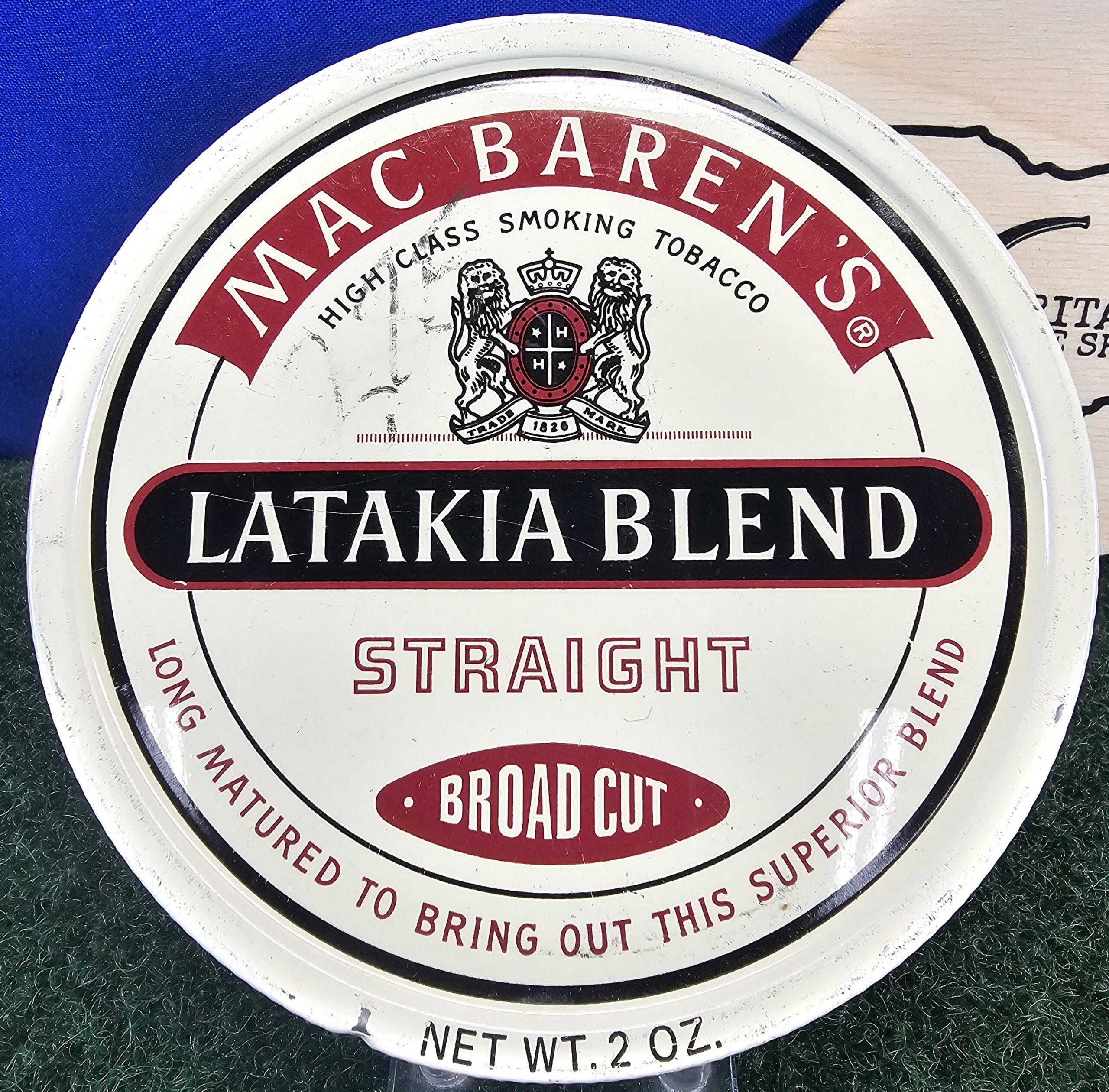 This is a sealed tin of MacBaren's Latakia Blend. Based on the lack of modern additions (UPC and warnings) and the wax pen indicating a price of $2.85, it is estimated as being from the 1970s.