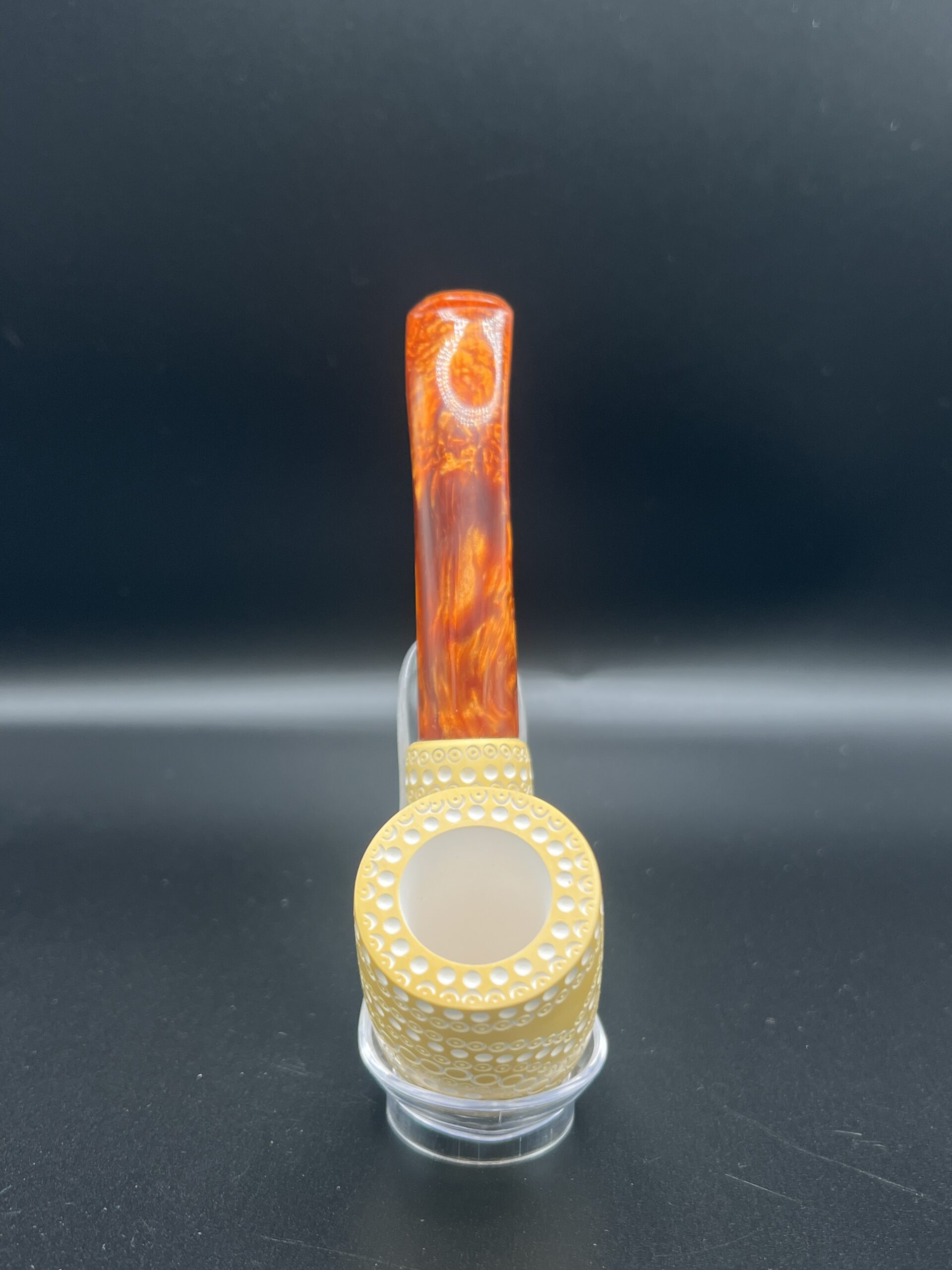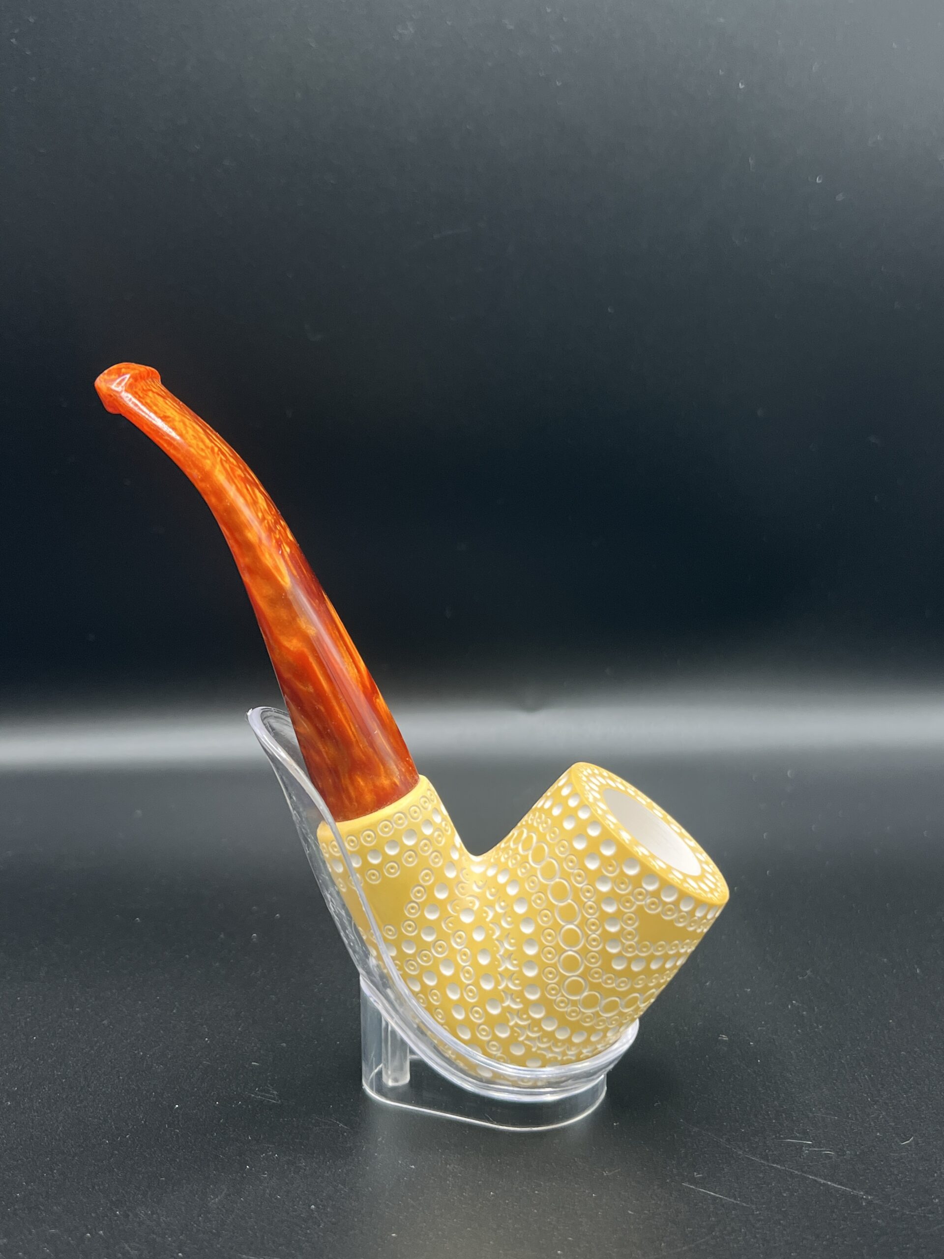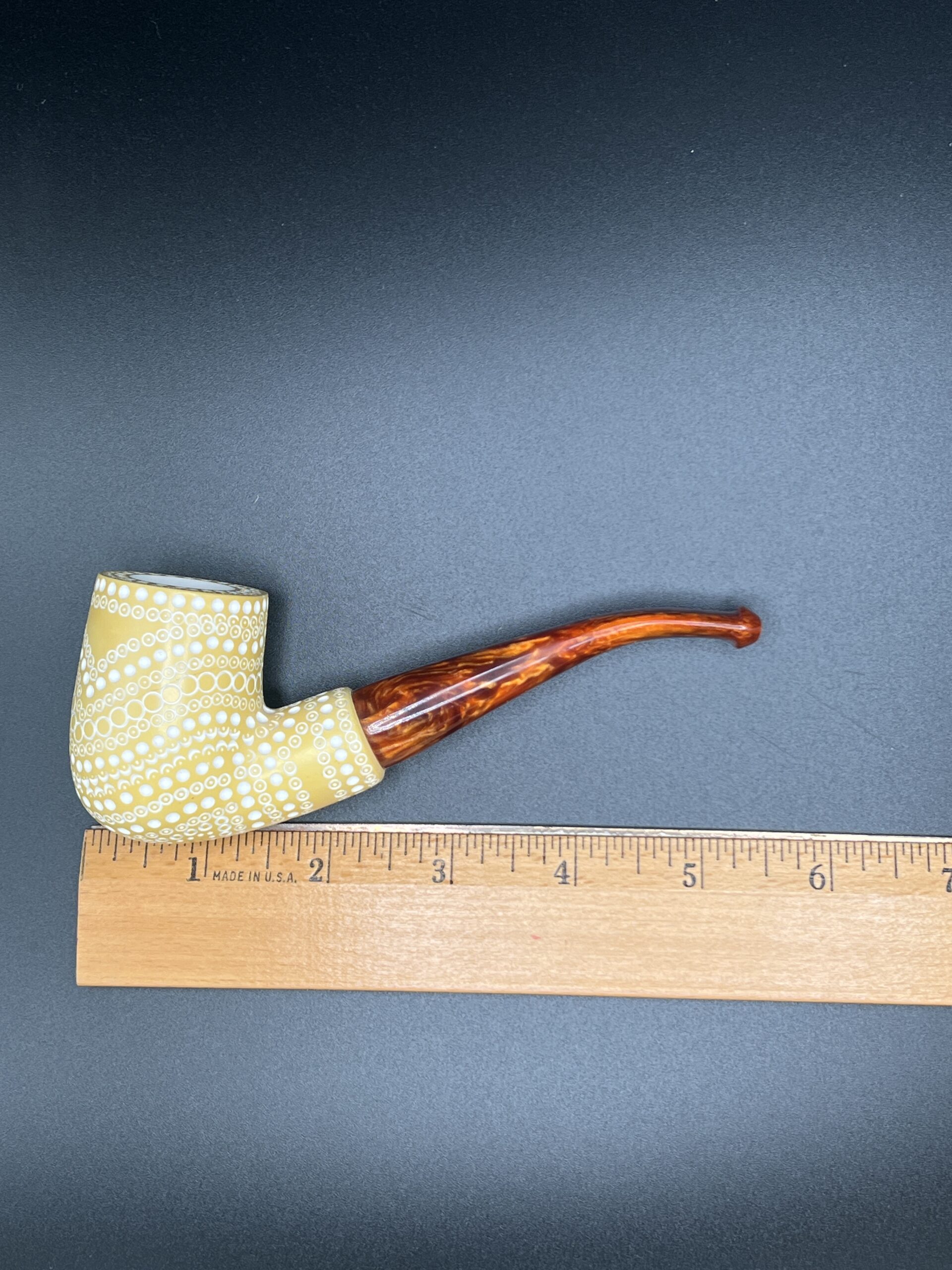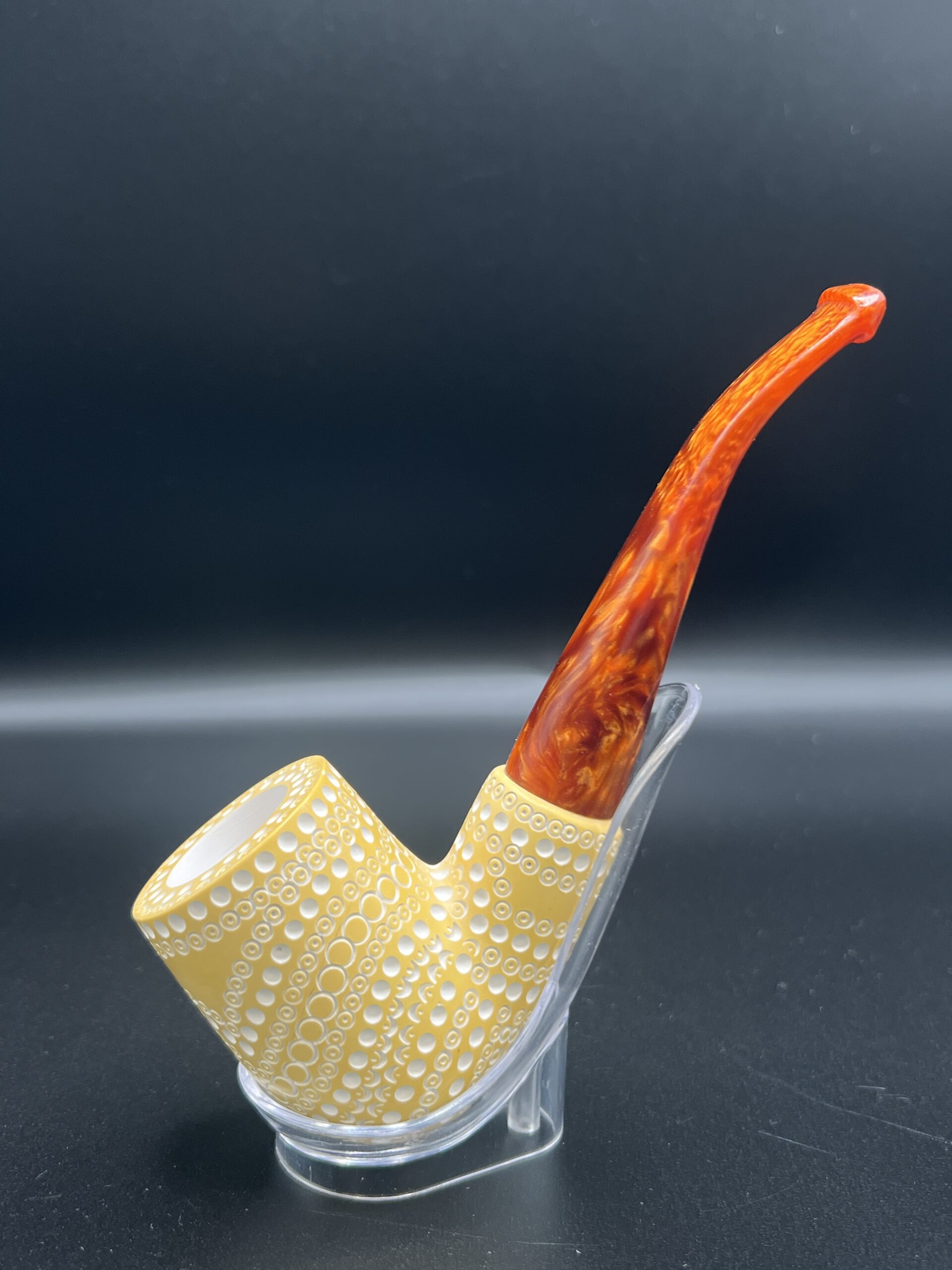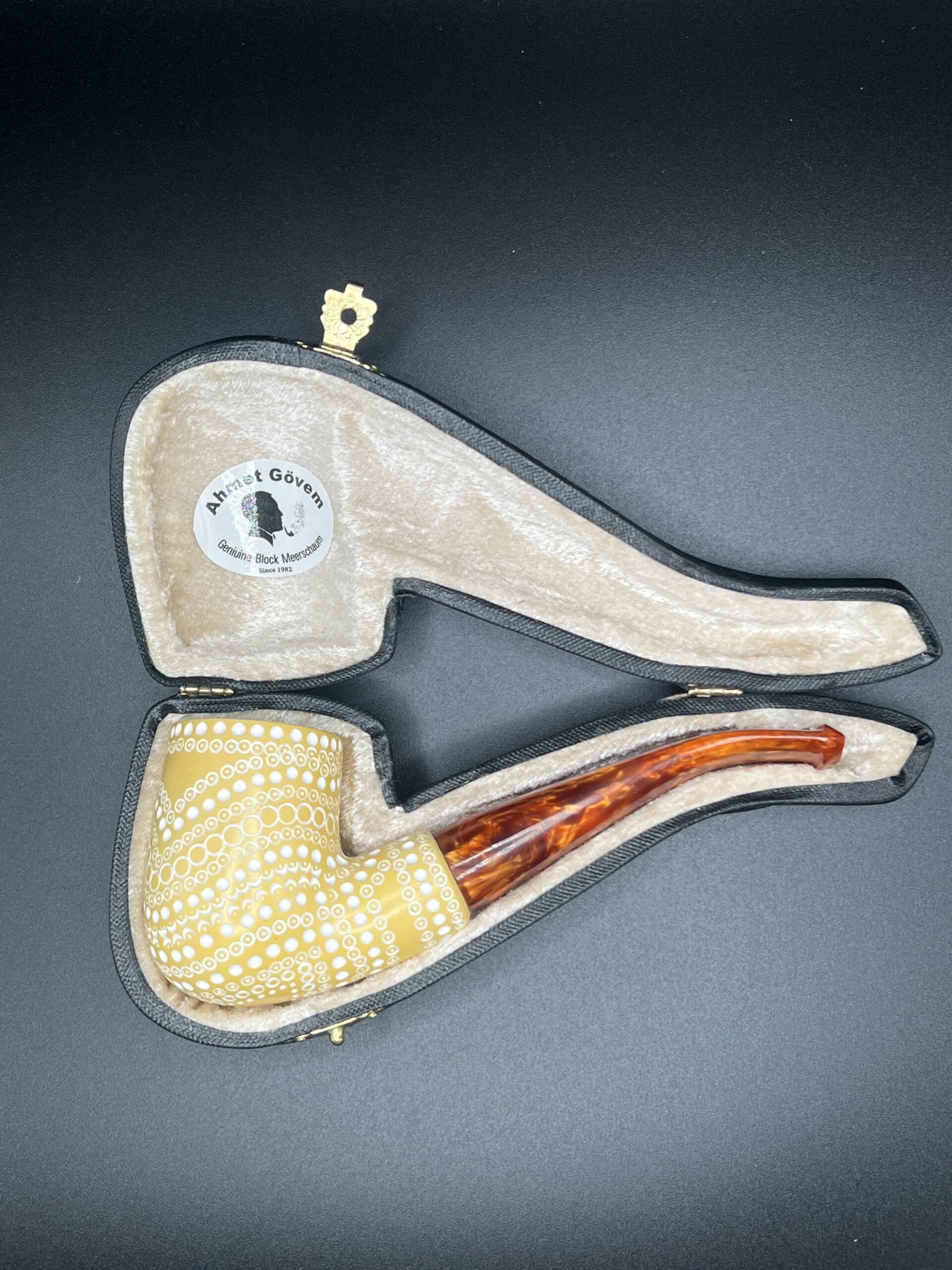Quarter bent billiard premium block meerschaum pipe with a stained lattice design and fitted case made by Ahmet Gövem.