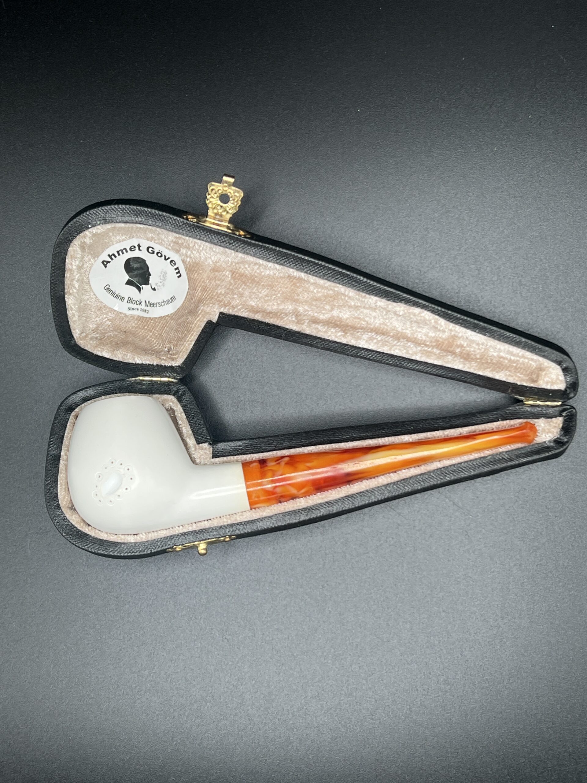 Straight apple premium block meerschaum pipe that is mostly smooth with a small circular design and fitted case made by Ahmet Gövem.