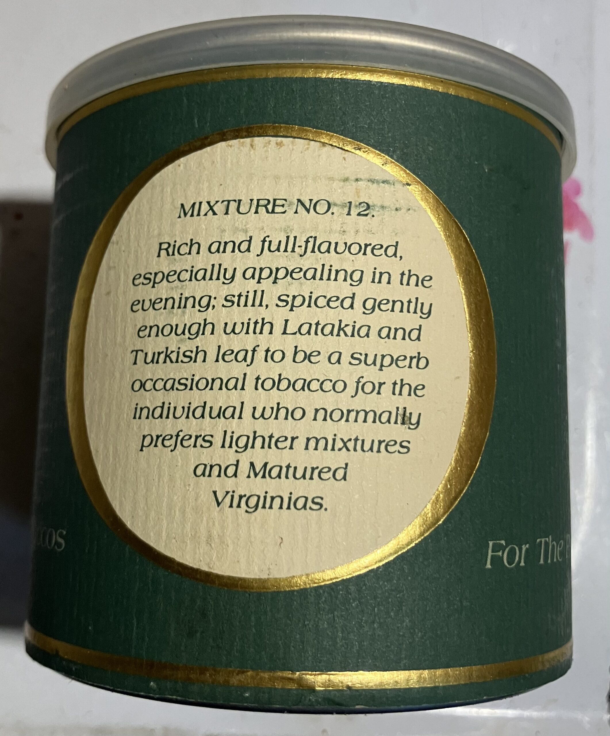 “Rich and full of flavor, especially appealing in the evening, still spiced gently enough with Latakia and Turkish leaf to be a superb occasional tobacco for the individual who normally prefers lighter mixtures and Matured Virginias.”