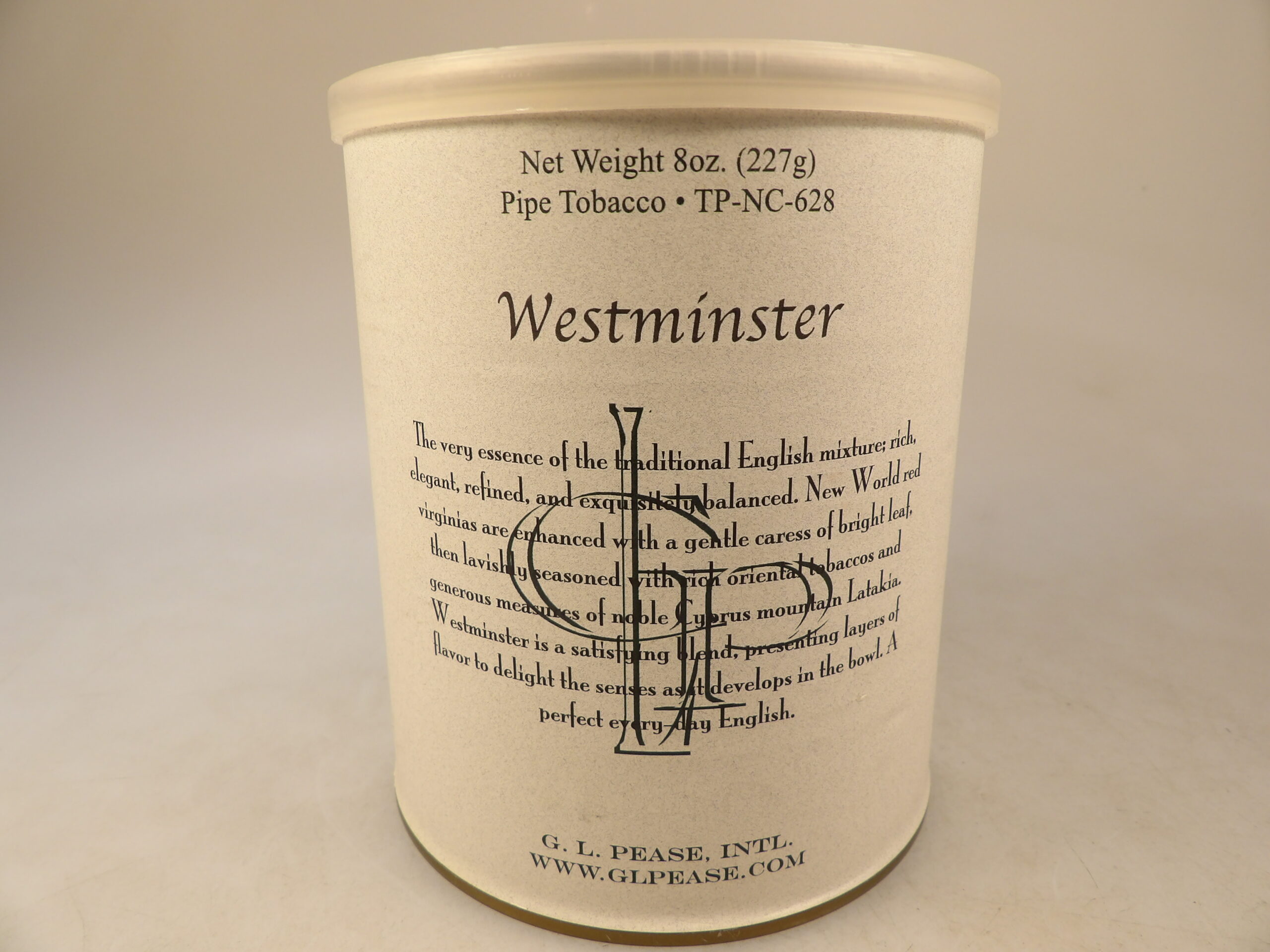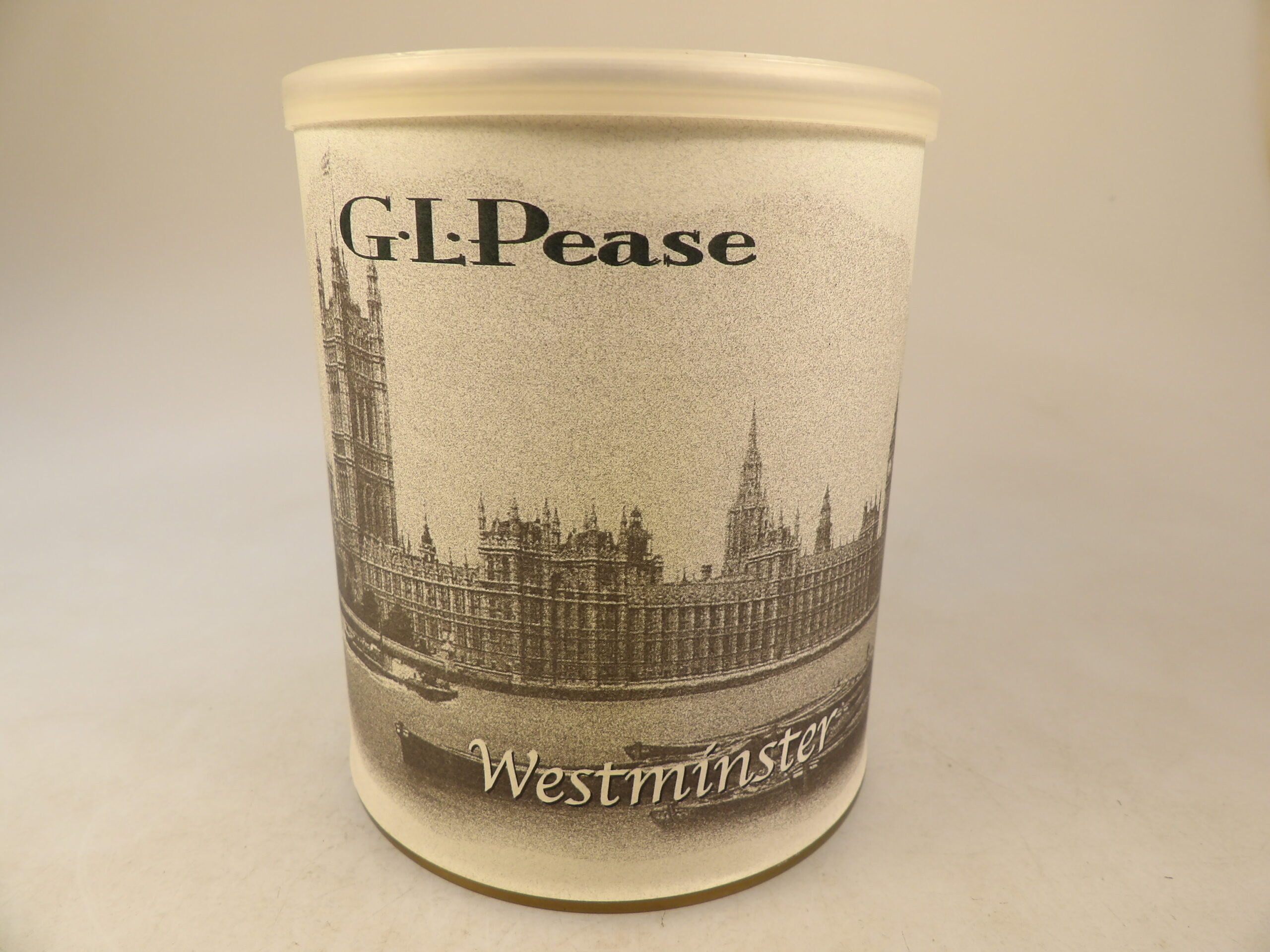 DESCRIPTION: Here is an auction for sale. It is a Vintage Collectible G.L. Pease Westminster 8 oz’s Sealed Pipe Tobacco Tin from 08/16/11. This tin is sealed and has never been opened. Westminster: The very essence of the traditional English mixture; rich, elegant, refined, and exquisitely balanced. New World red Virginias are enhanced with a gentle caress of bright leaf, then lavishly seasoned with rich oriental tobaccos and generous measures of noble Cyprus mountain latakia. Westminster is a satisfying blend, presenting layers of flavor to delight the senses and develop in the bowl. A perfect everyday English mixture. Full bodied, 2011.