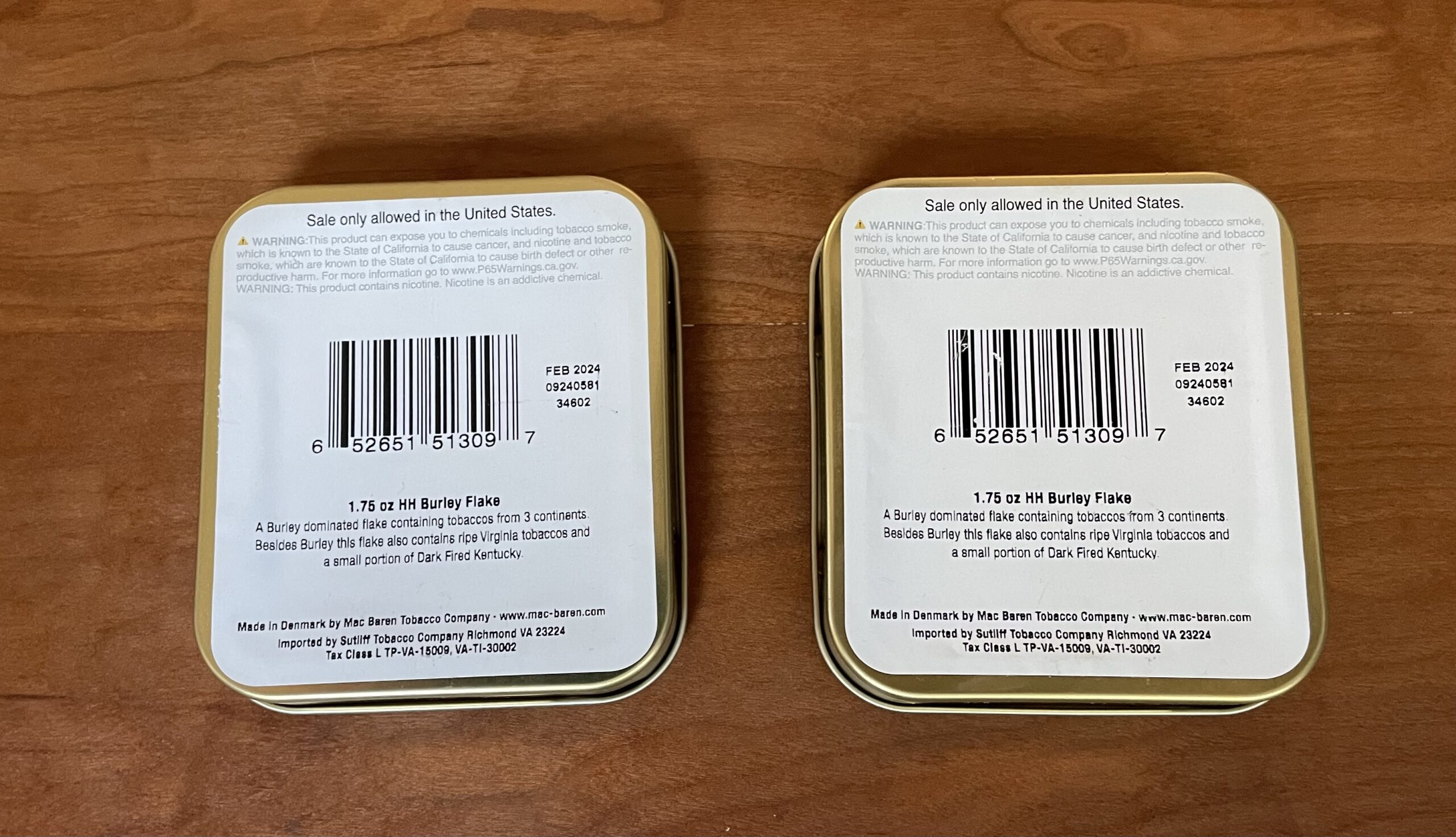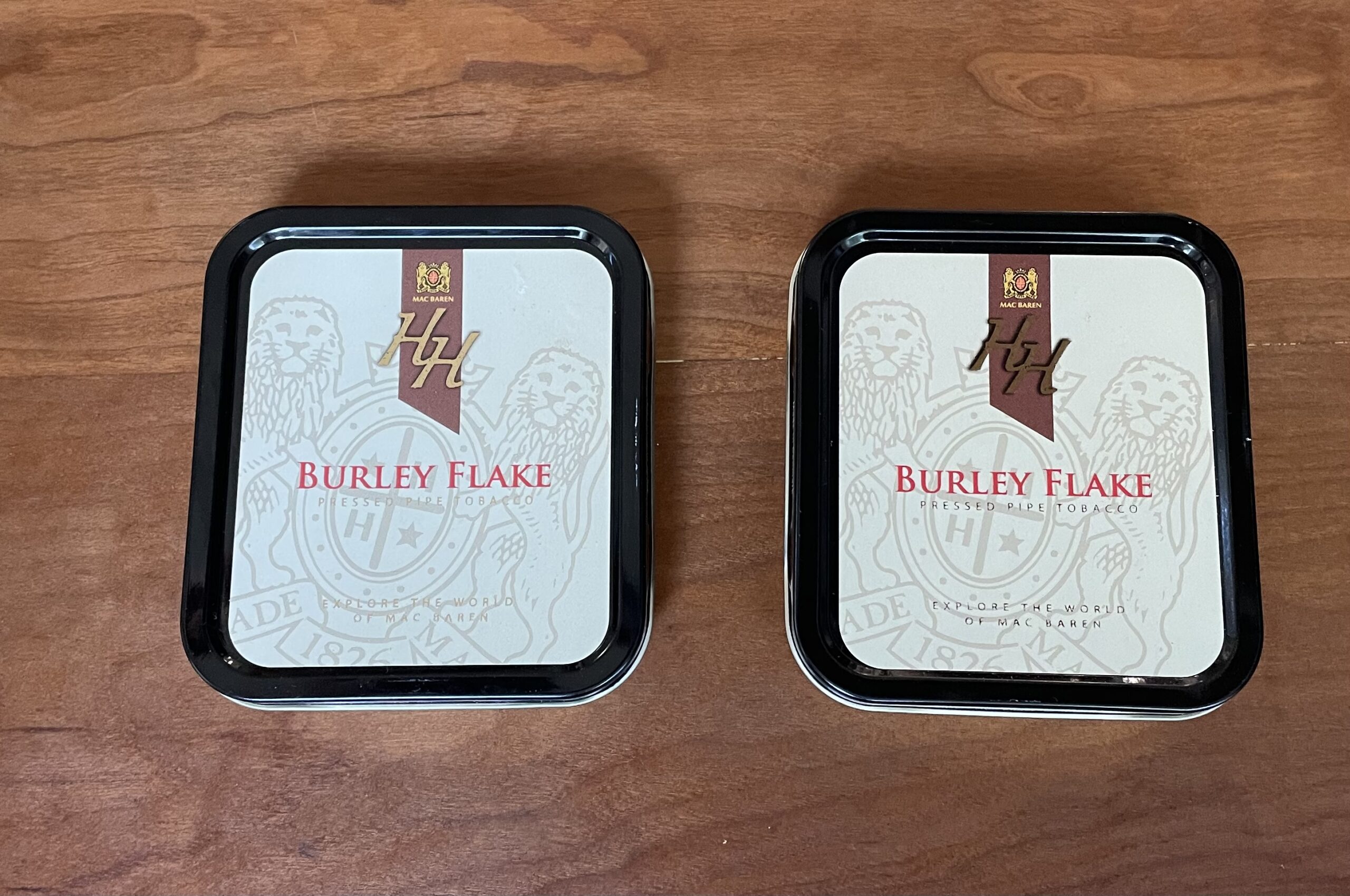 Two sealed 1.75oz tins of Mac Baren HH Burley Flake from Feb. of 24’