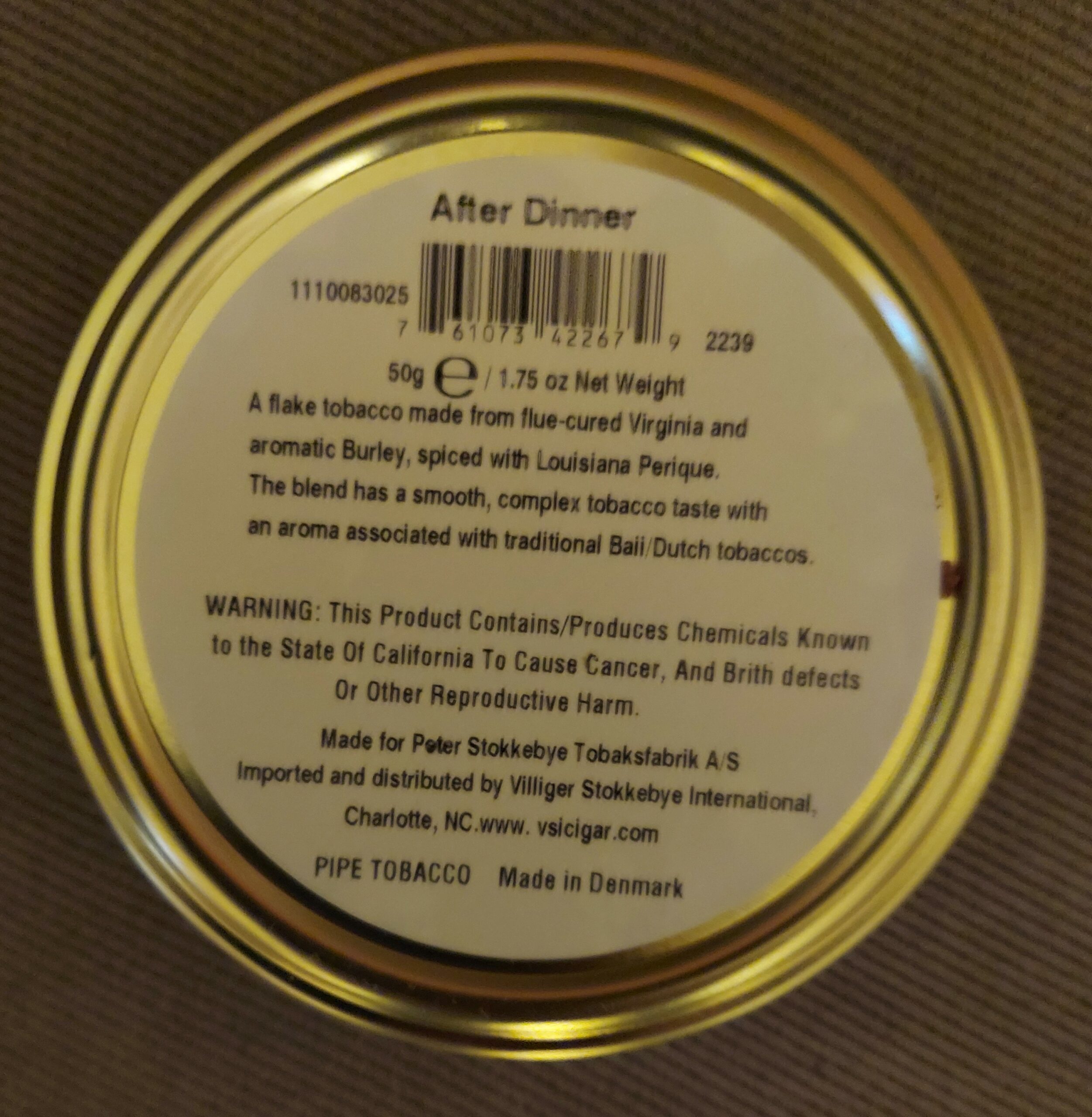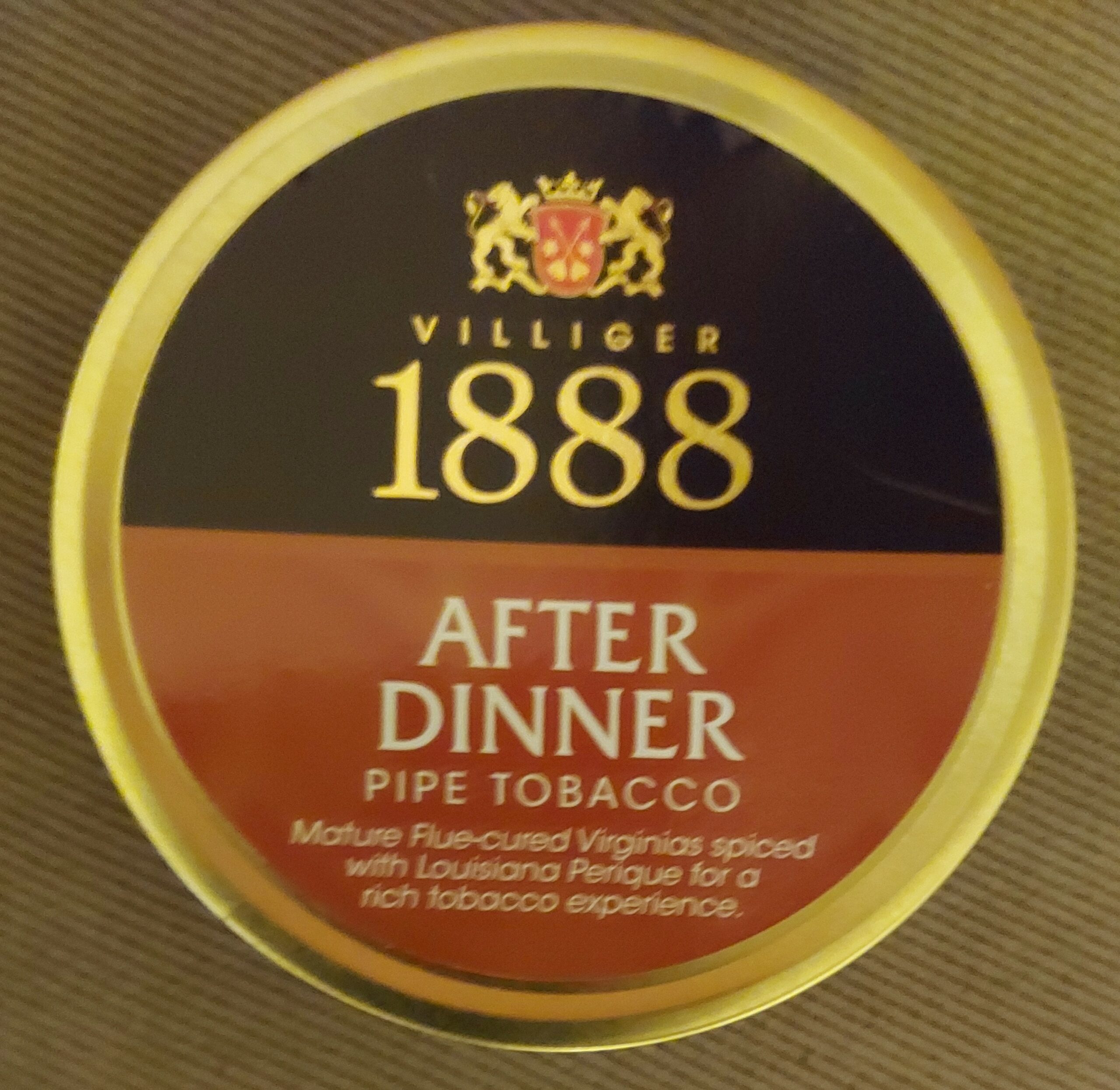 50g tin of Peter Stokkebye Villiger 1888 After Dinner. Wonderful well aged VaPer. No longer available. Using Peter Stokkebye date coding indicates it was tinned in 2011. I purchased it in May 2012.