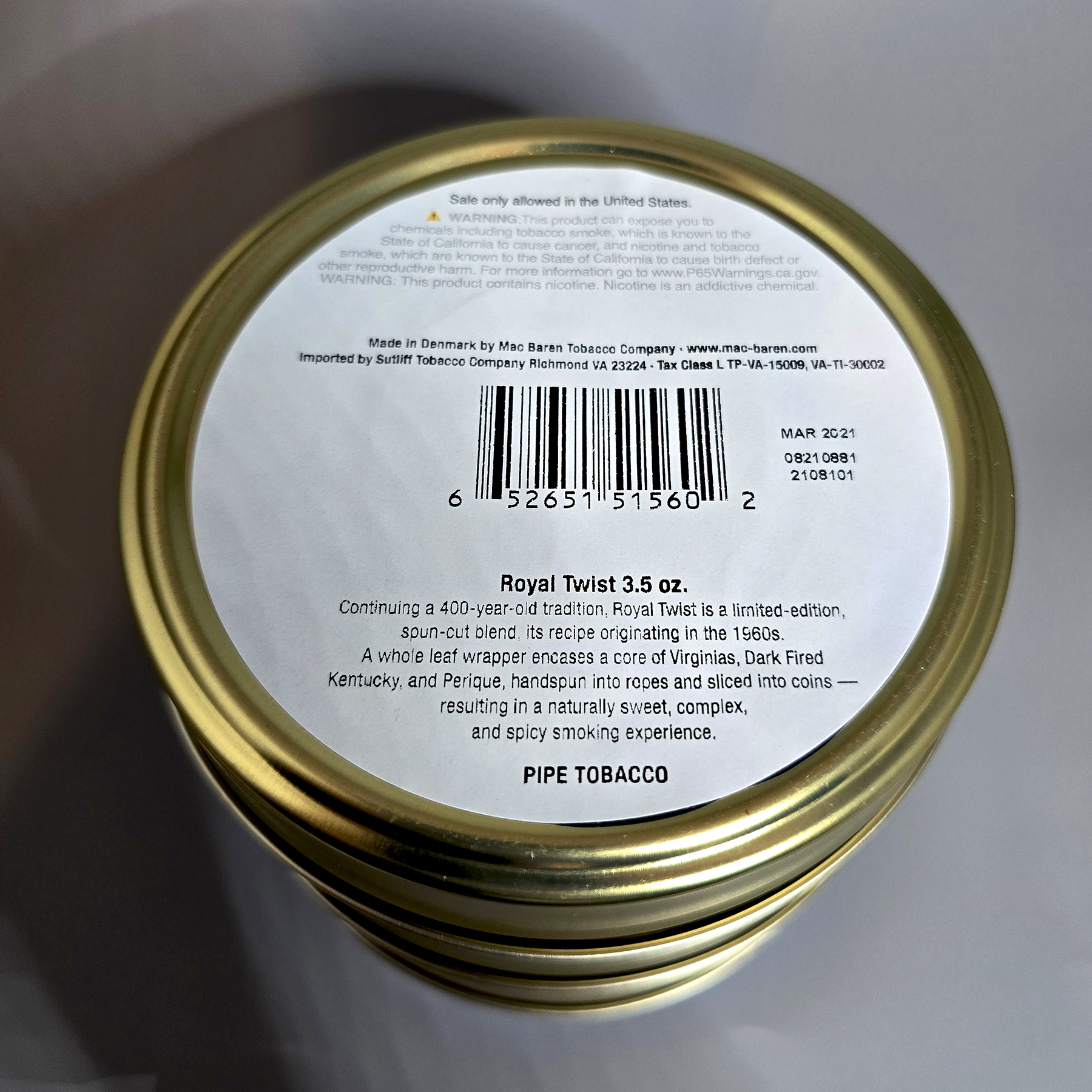 Mac Baren's Royal Twist de Luxe Roll Cakes joins the ranks of many of the Mac Baren favorites that are no more. Only 7500 of these limited edition 3.5 oz/100 g tins were made. These 2021 tins are numbered: