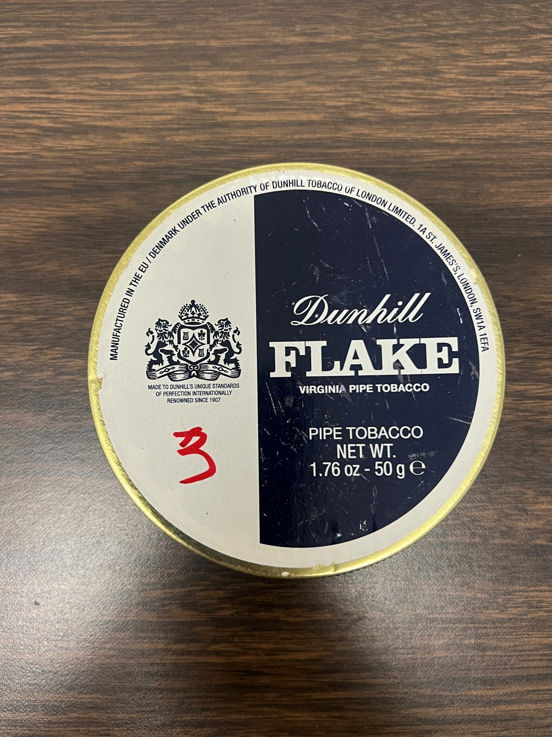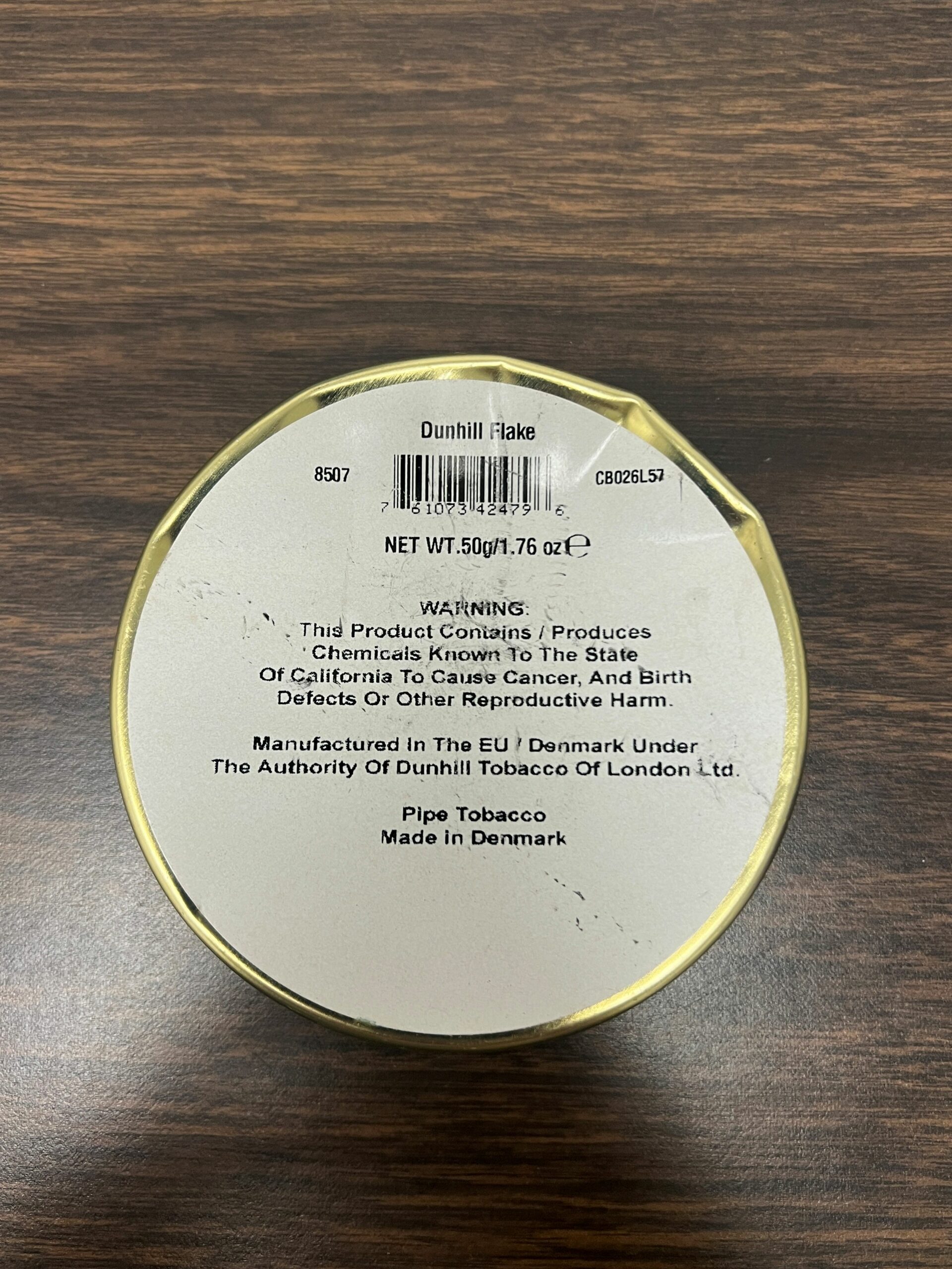 50g sealed tin of Dunhill's Flake Virginia pipe tobacco with minor cosmetic damage and denting on the back of the tin.