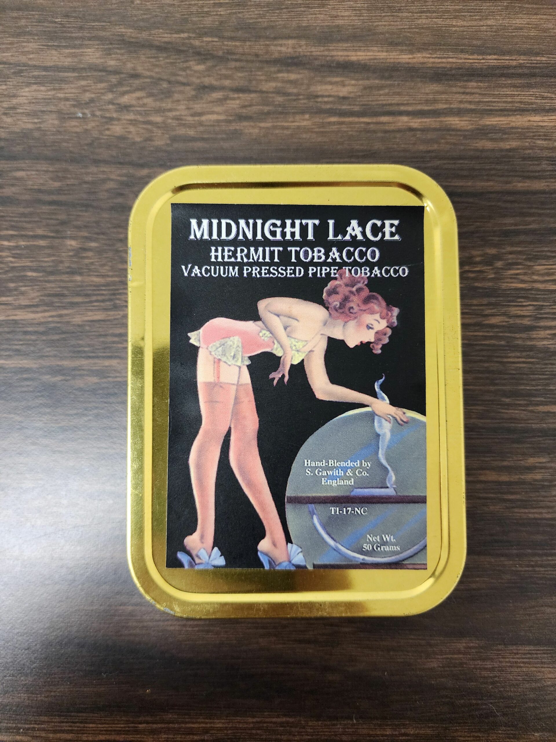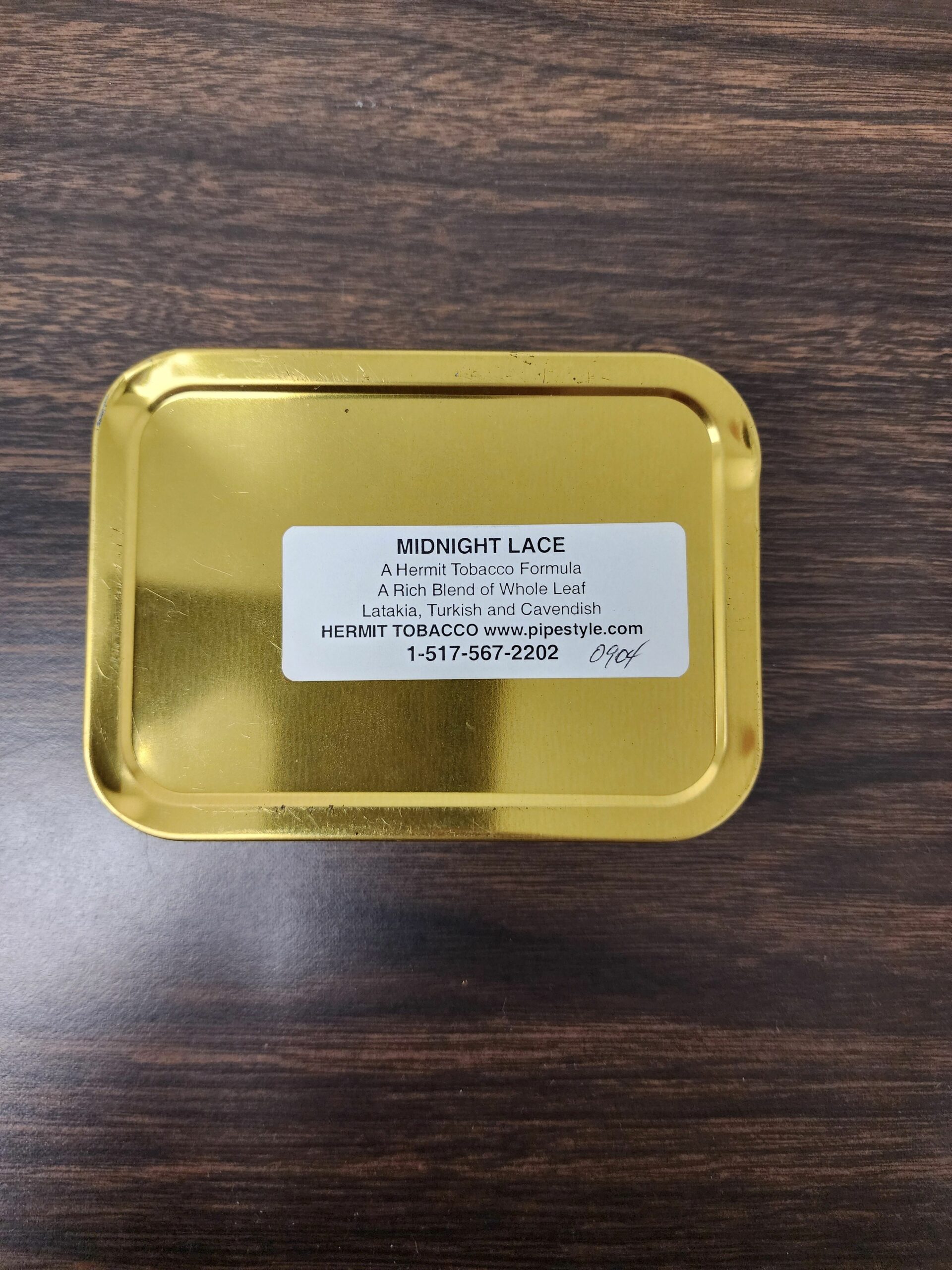 50g sealed square tin of Hermit's Midnight Lace pipe tobacco from 2004.