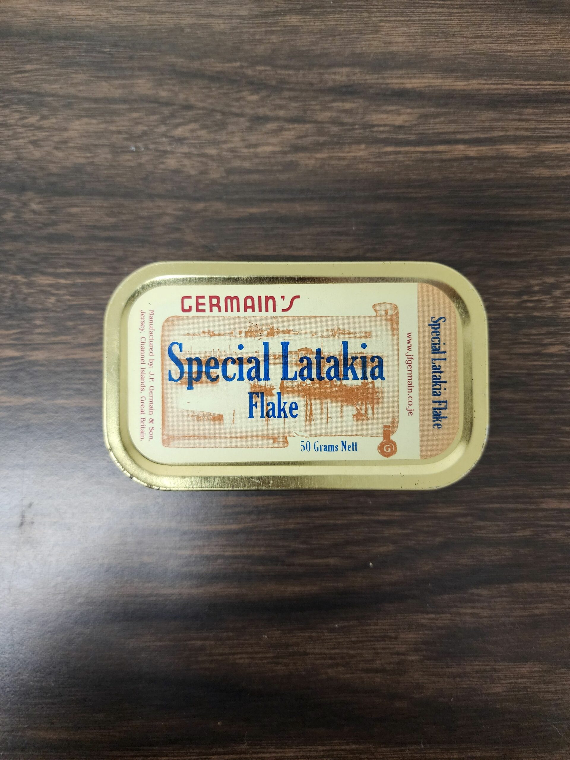 50g sealed square tin of Germain's Special Latakia Flake pipe tobacco.