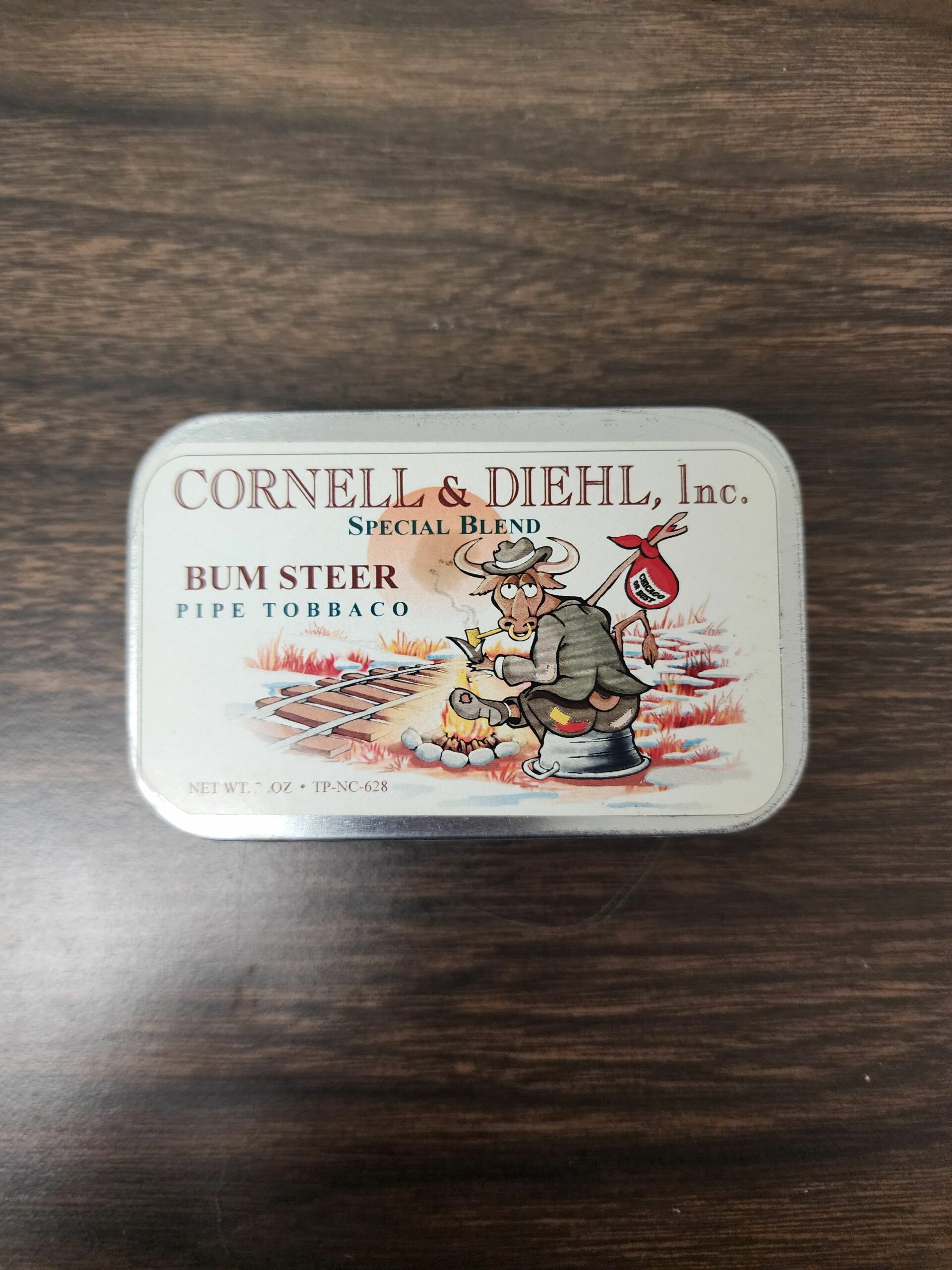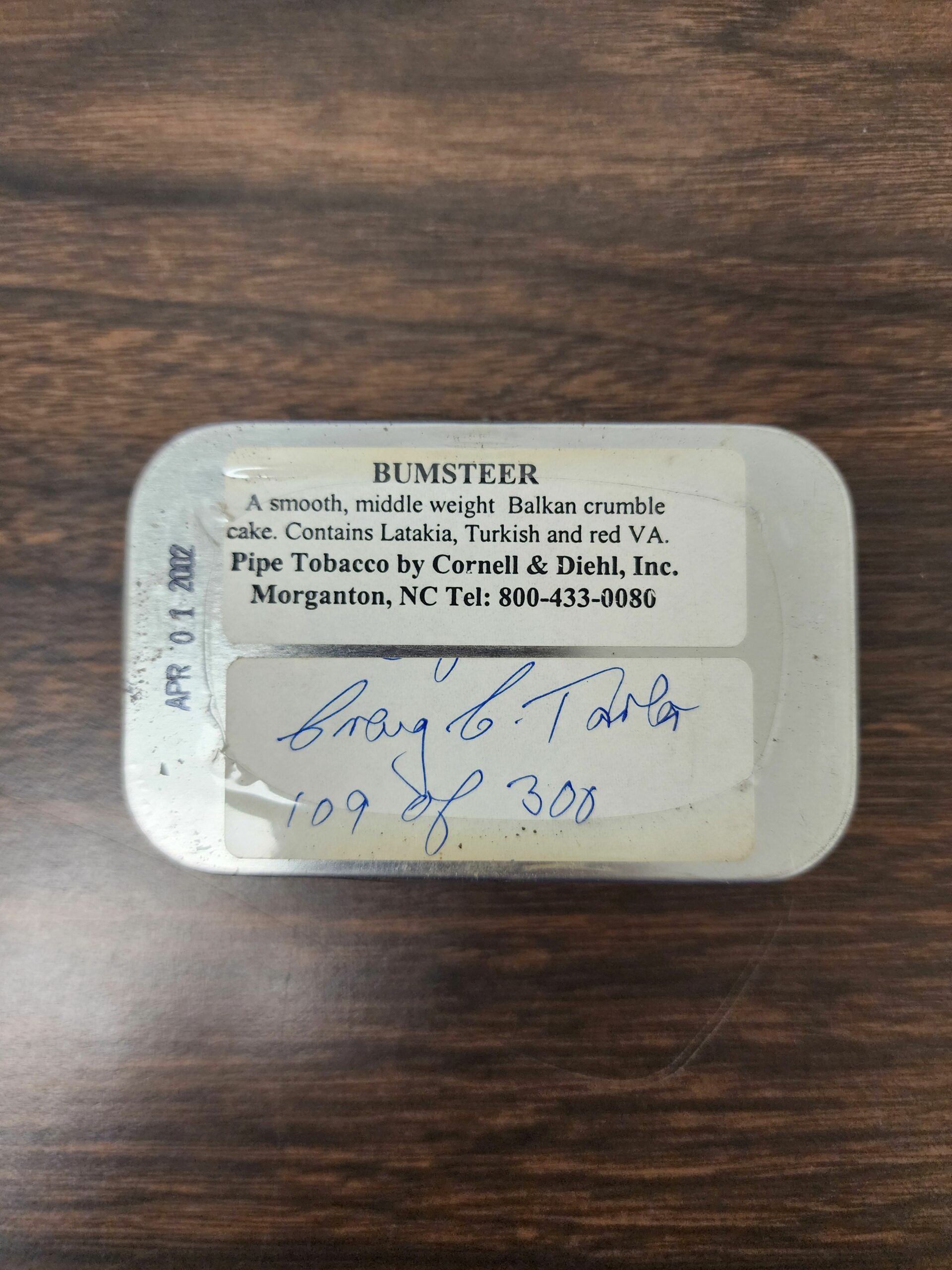 50g sealed square tin of Cornell & Diehl's Bum Steer special edition pipe tobacco from 2002 signed by Craig Tarler. 109/300 tins produced.