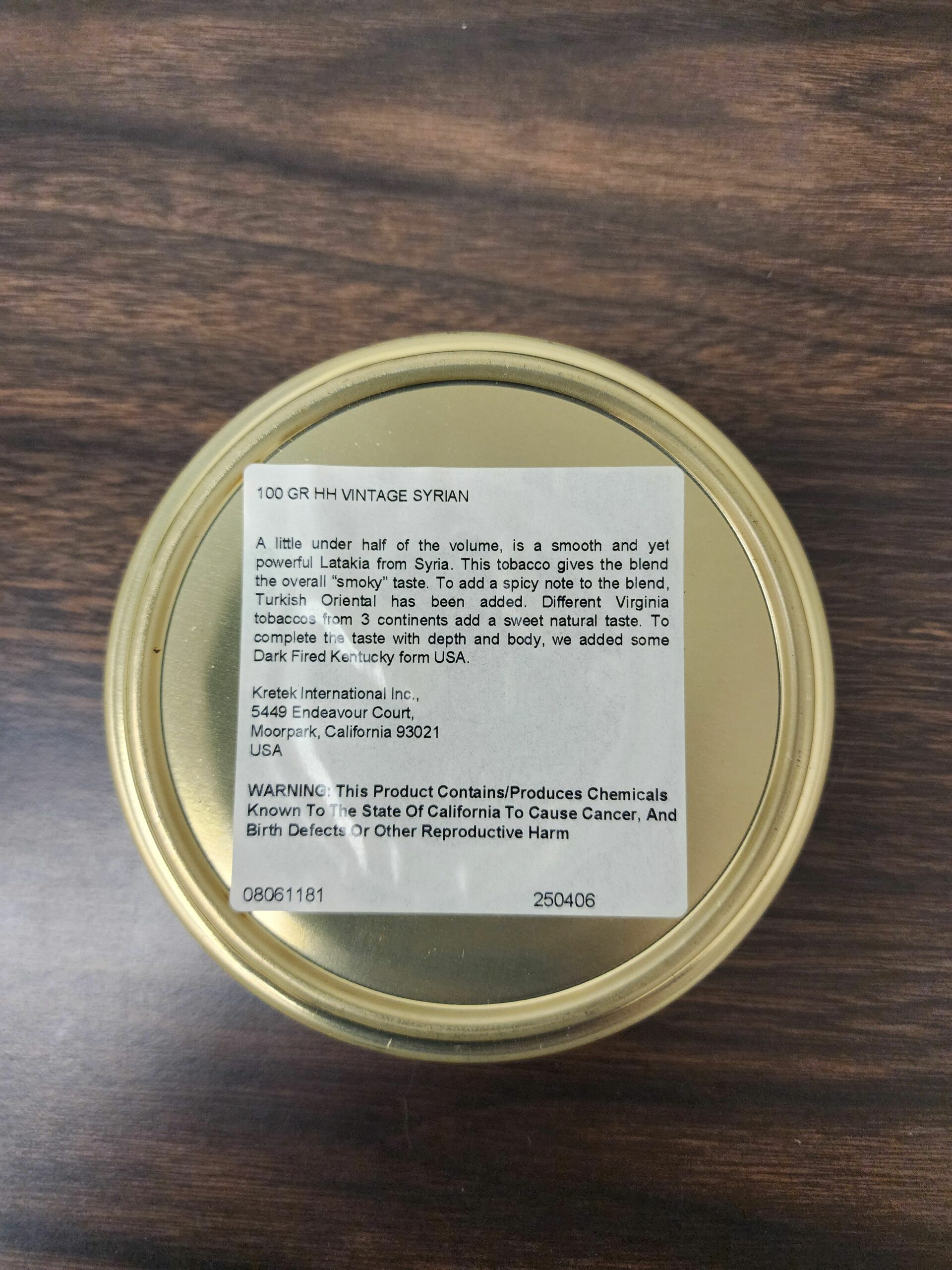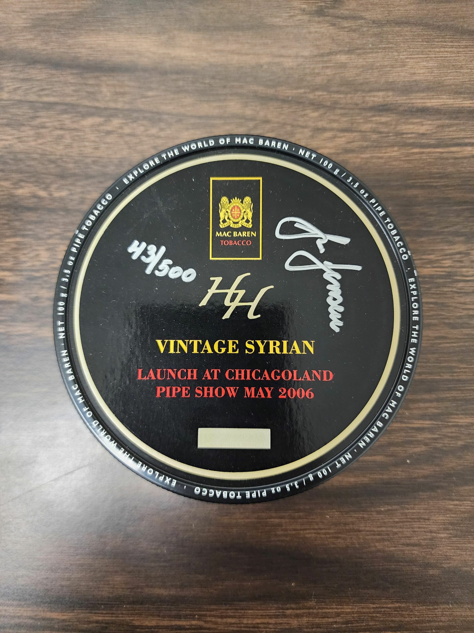 100g sealed tin of Mac Baren's Vintage Syrian pipe tobacco signed by Per Jensen. Launched at the 2006 Chicago pipe show, 43/500 tins produced.