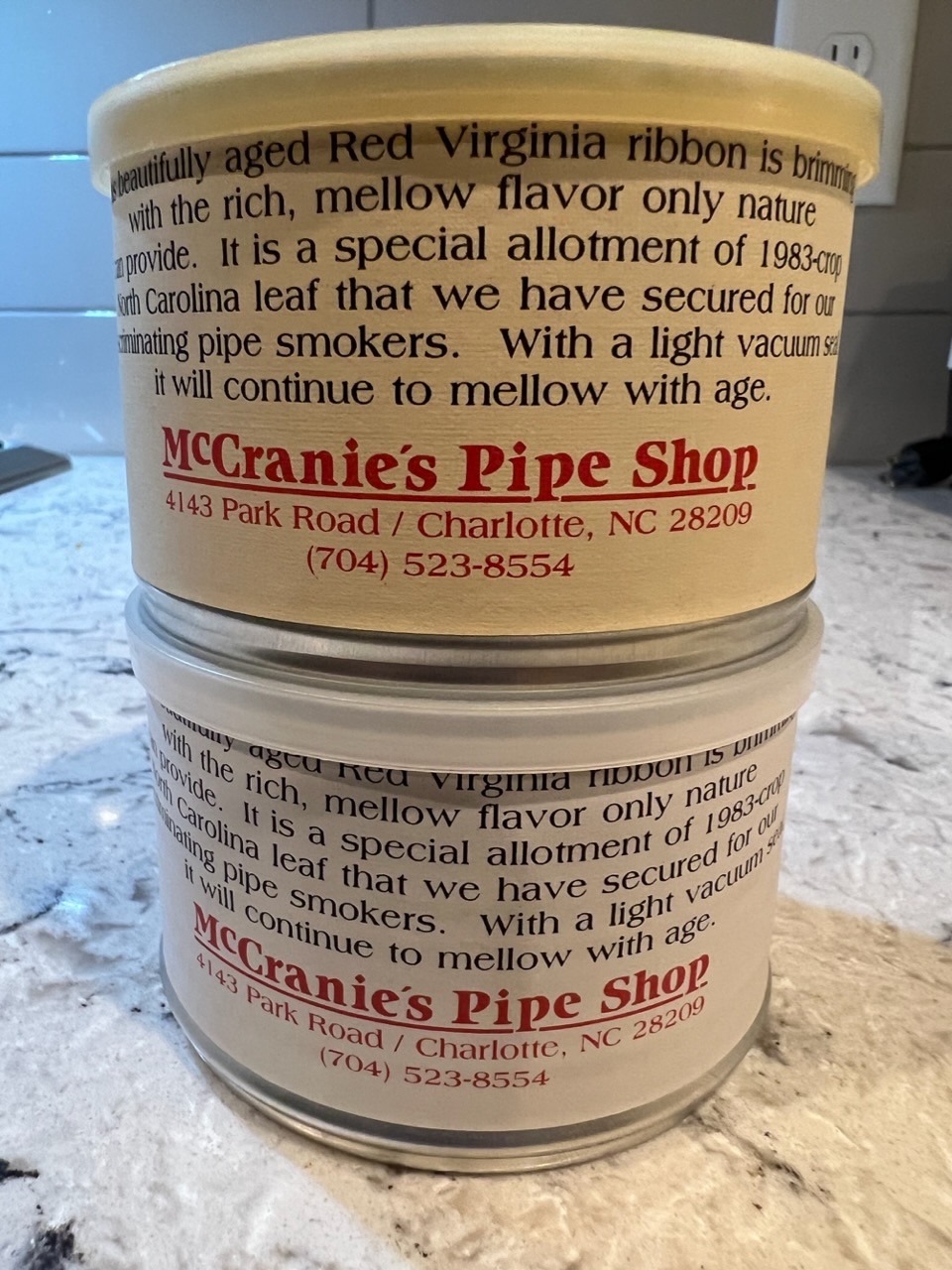 Includes two (2) 1983 McCranie’s Red Ribbon Virginia 50g Tins.