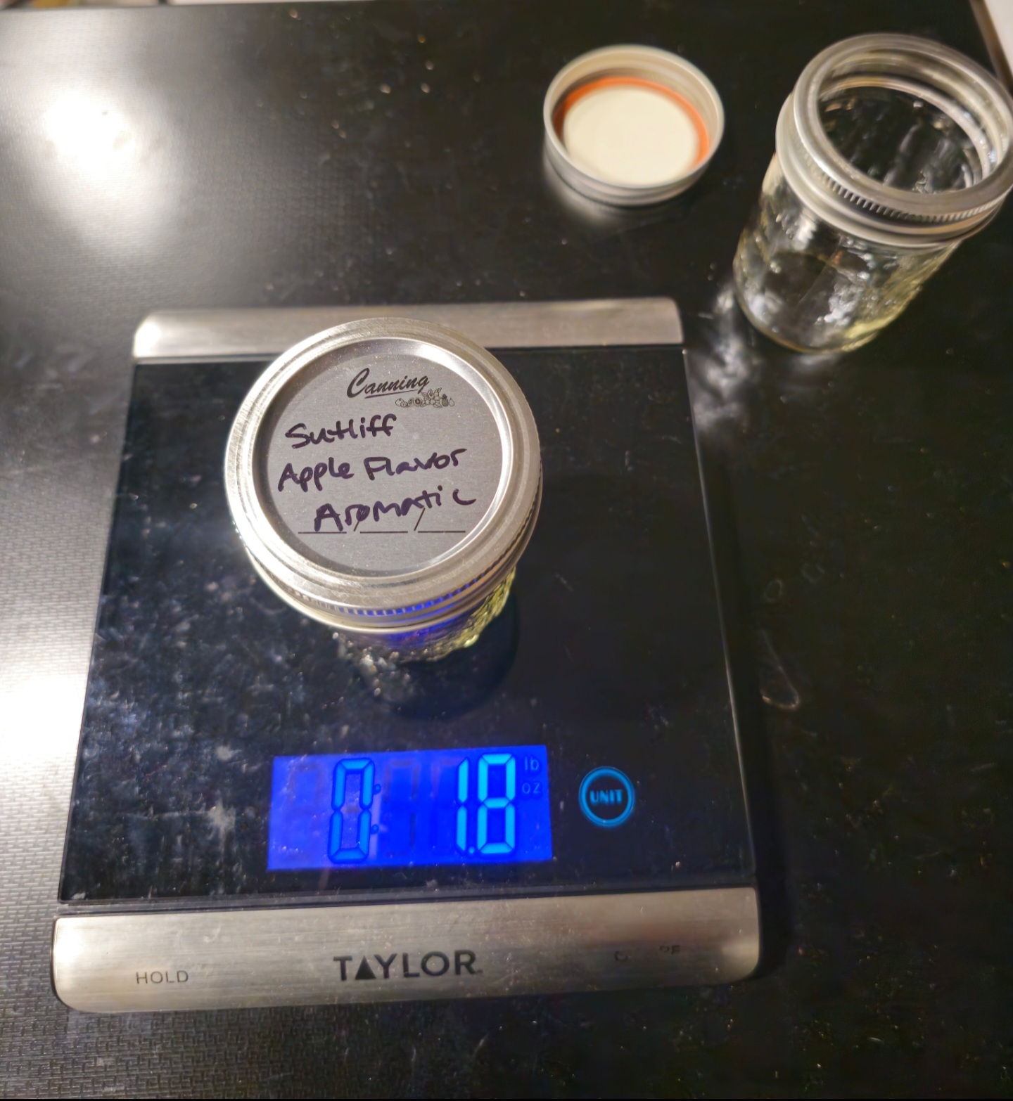 Weight of tobacco is shown on the scale in picture. The scale was set to zero with the weight of the jar and lid accounted for, so the shown weight is just the tobacco in the jar.
