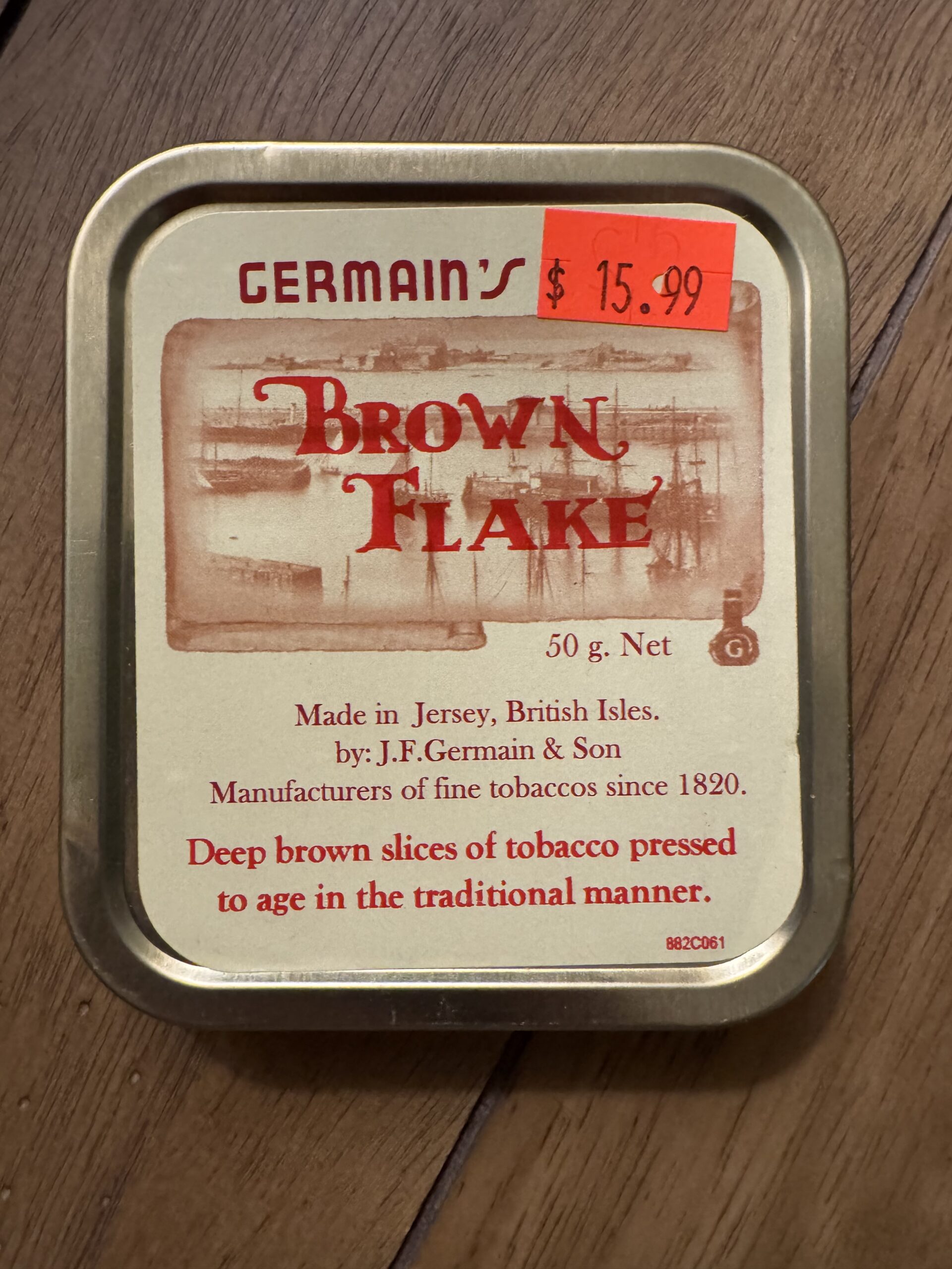 One sealed tin of Germain’s Brown Flake from approximately 2015. 10 years of age and ready to smoke! I didn’t date this tin but it was in with my other 2015 tins so I’m sure the date code will pan out to be in the time frame.