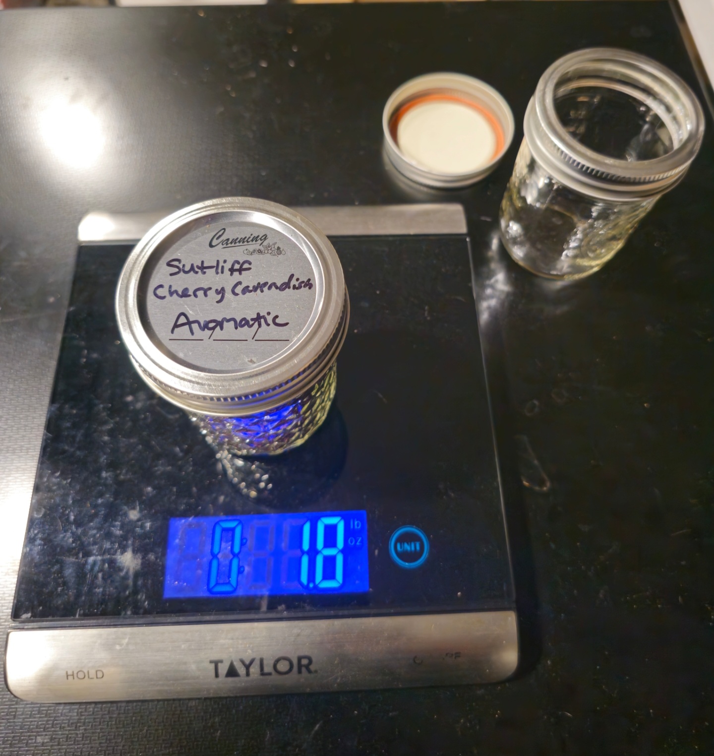 Weight of tobacco (in ounces) is shown on the scale in picture. The scale was set to zero with the weight of the jar and lid accounted for, so the shown weight is just the tobacco in the jar.