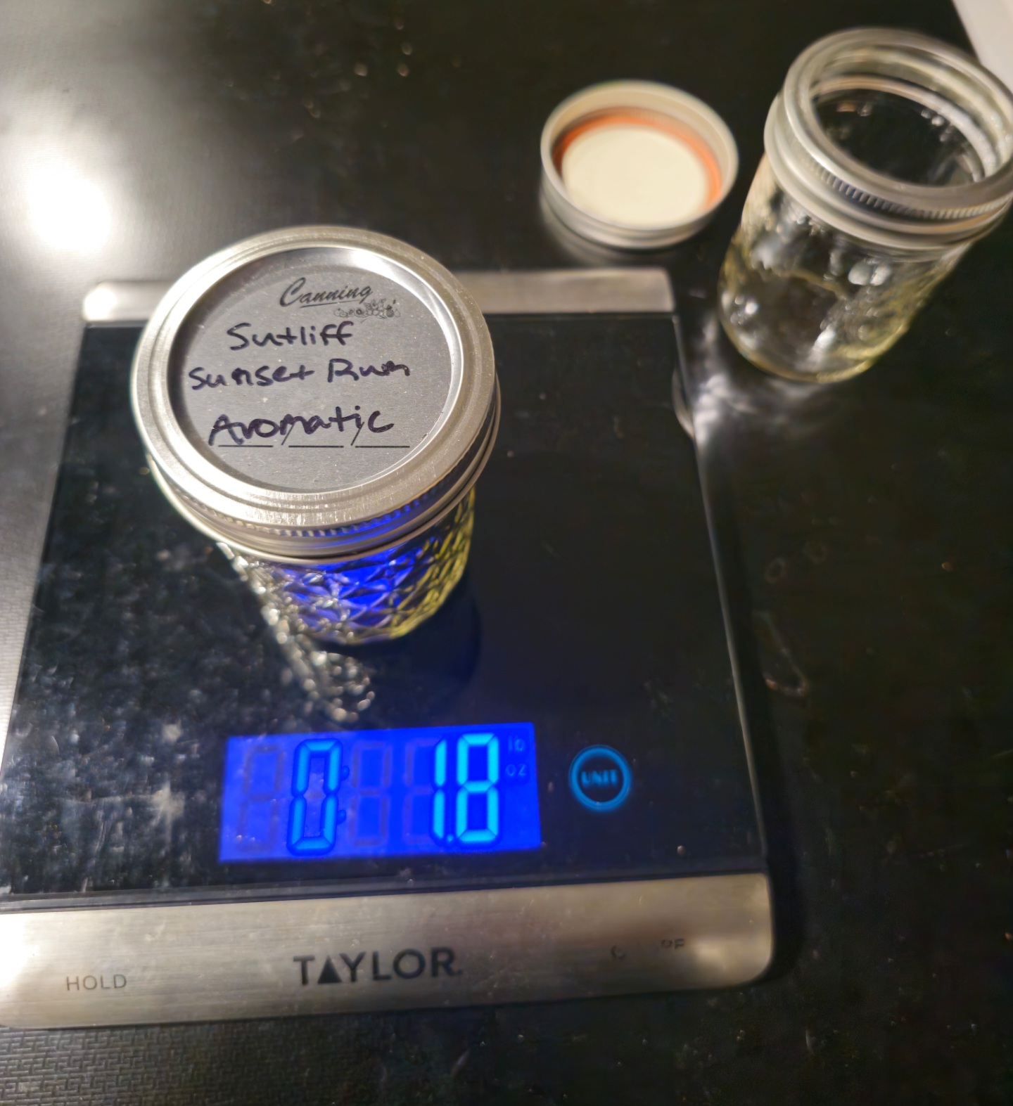 Weight of tobacco (in ounces) is shown on the scale in picture. The scale was set to zero with the weight of the jar and lid accounted for, so the shown weight is just the tobacco in the jar.