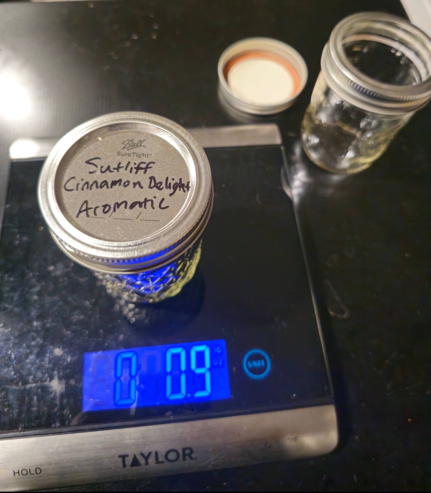 Weight of tobacco (in ounces) is shown on the scale in picture. The scale was set to zero with the weight of the jar and lid accounted for, so the shown weight is just the tobacco in the jar.