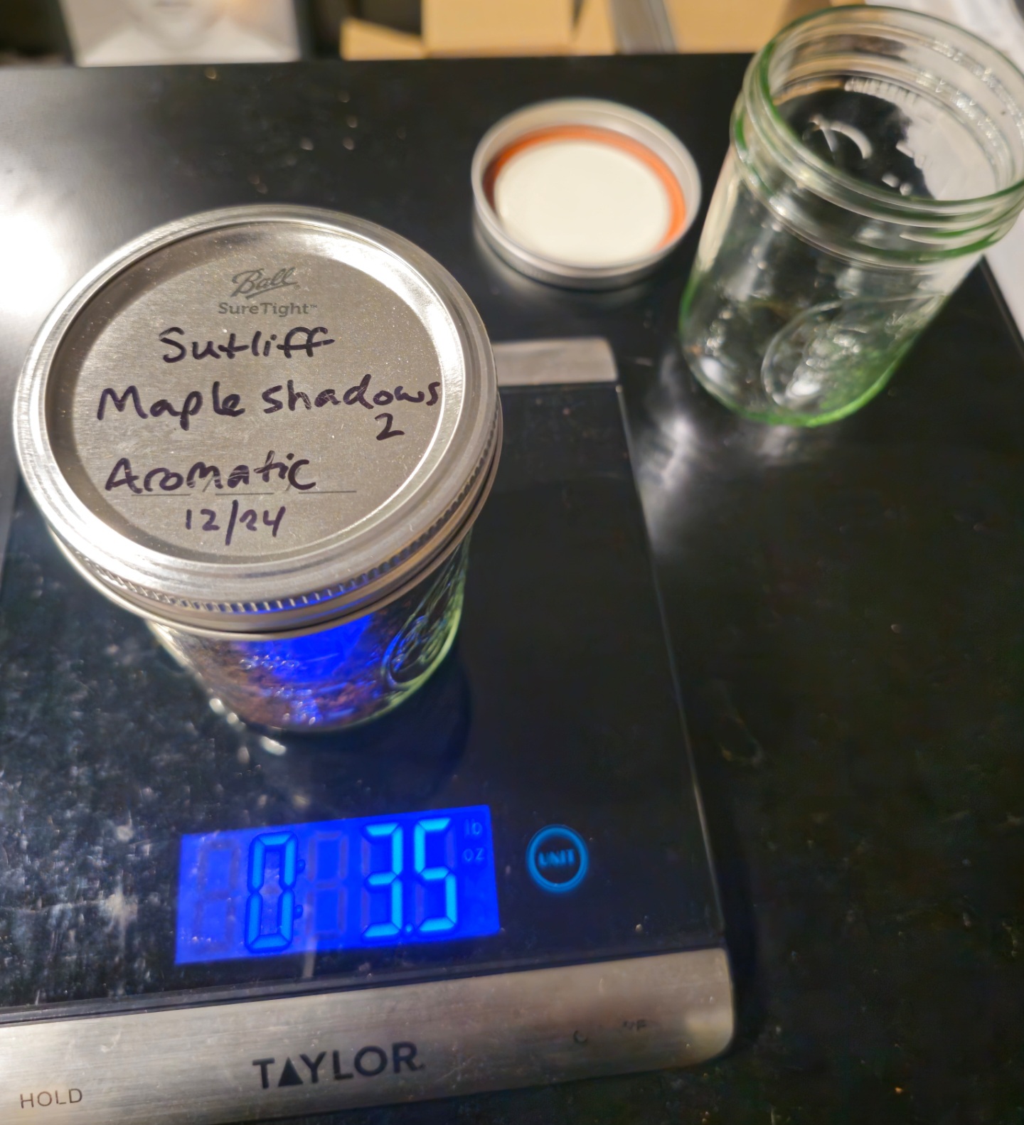 Weight of tobacco (in ounces) is shown on the scale in picture. The scale was set to zero with the weight of the jar and lid accounted for, so the shown weight is just the tobacco in the jar.