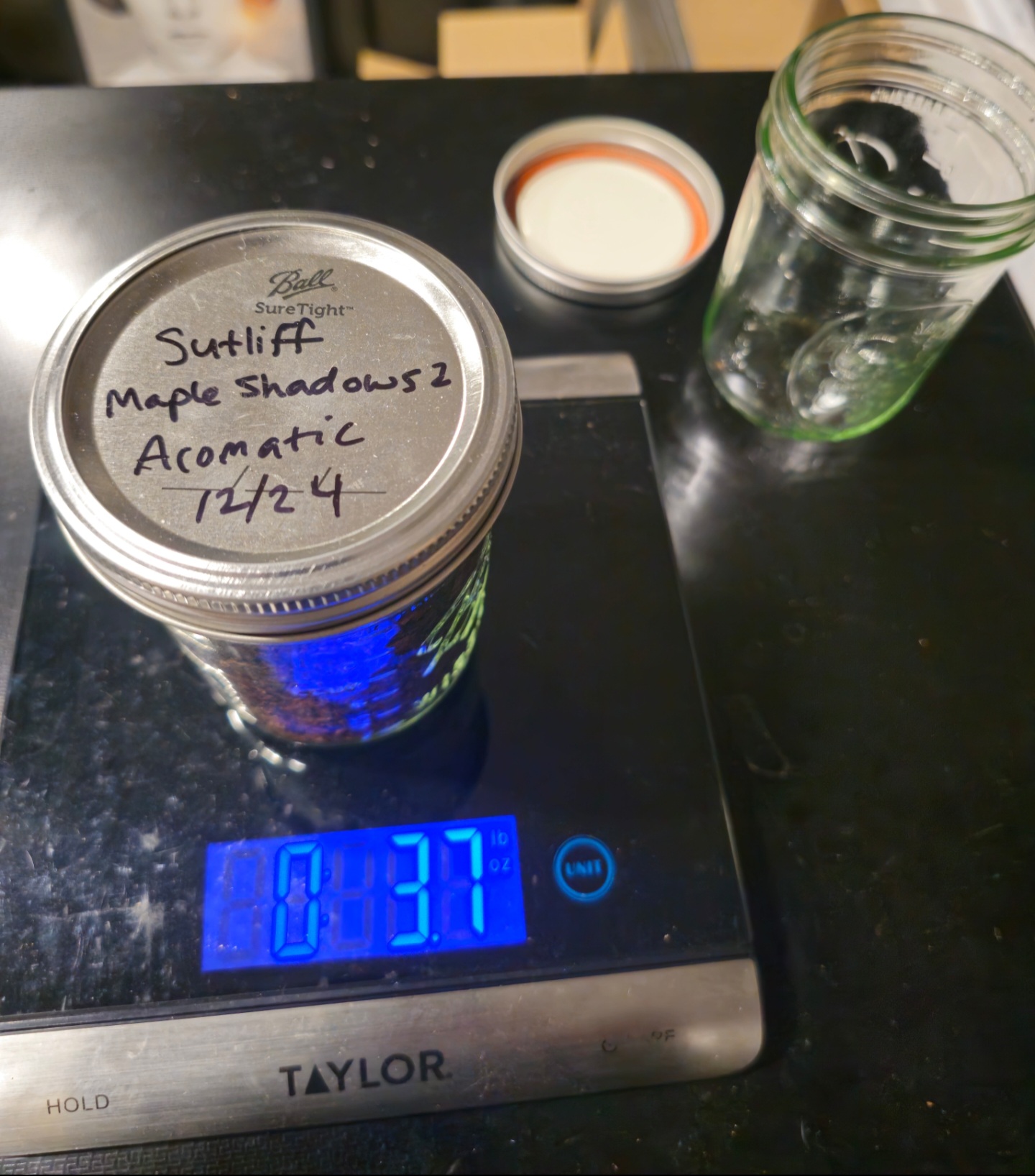 Weight of tobacco (in ounces) is shown on the scale in picture. The scale was set to zero with the weight of the jar and lid accounted for, so the shown weight is just the tobacco in the jar.
