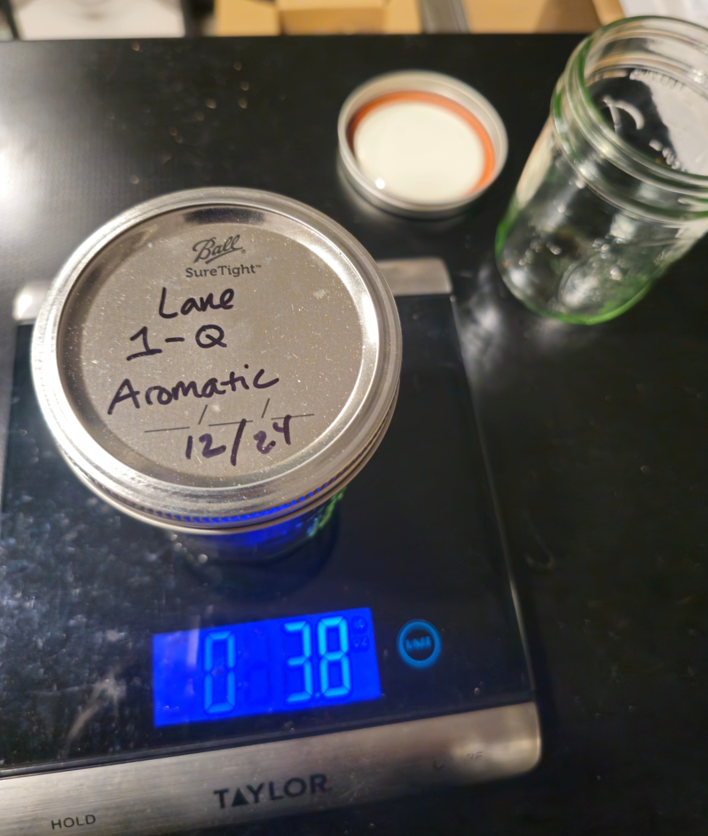 Weight of tobacco (in ounces) is shown on the scale in picture. The scale was set to zero with the weight of the jar and lid accounted for, so the shown weight is just the tobacco in the jar.