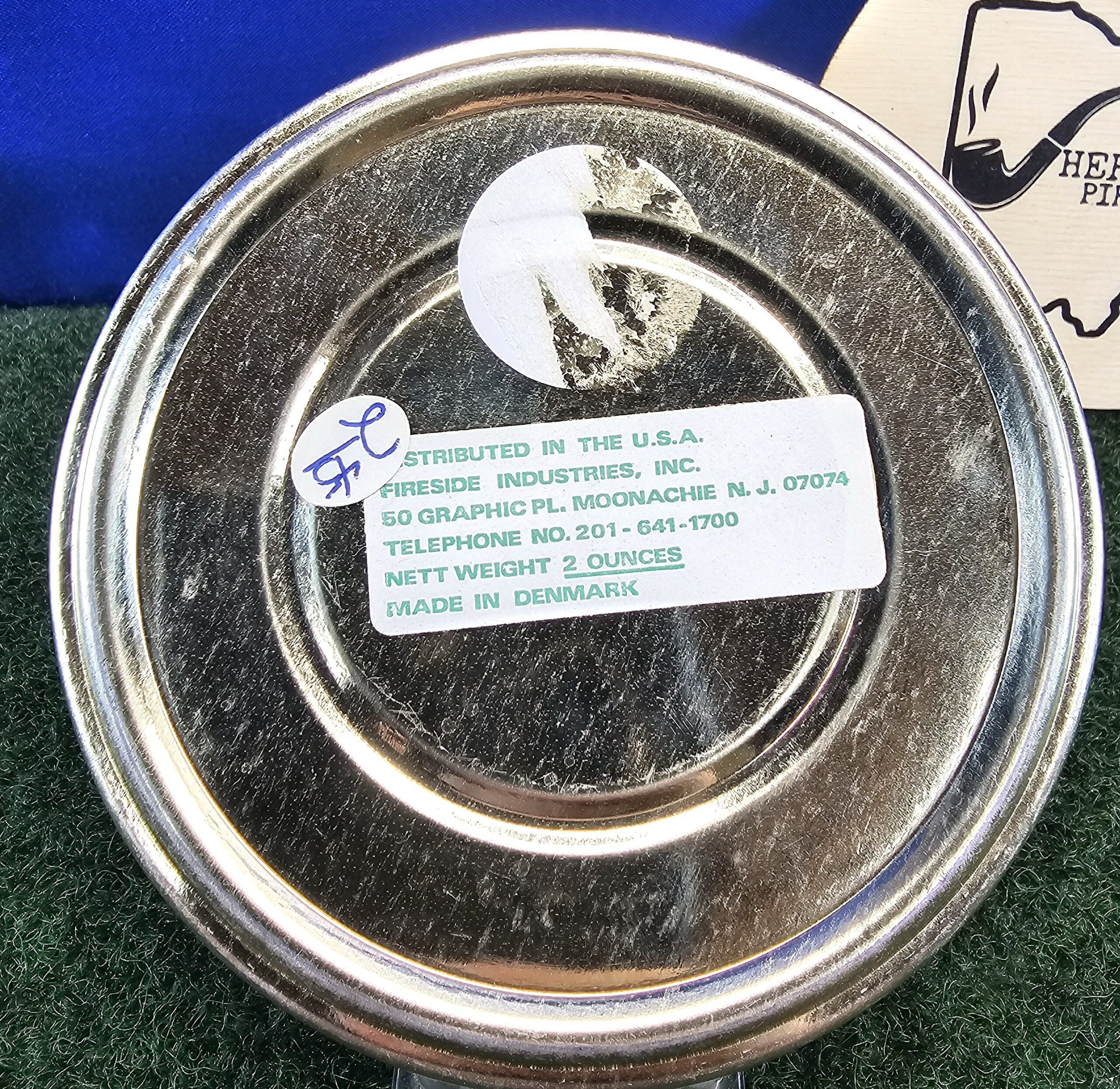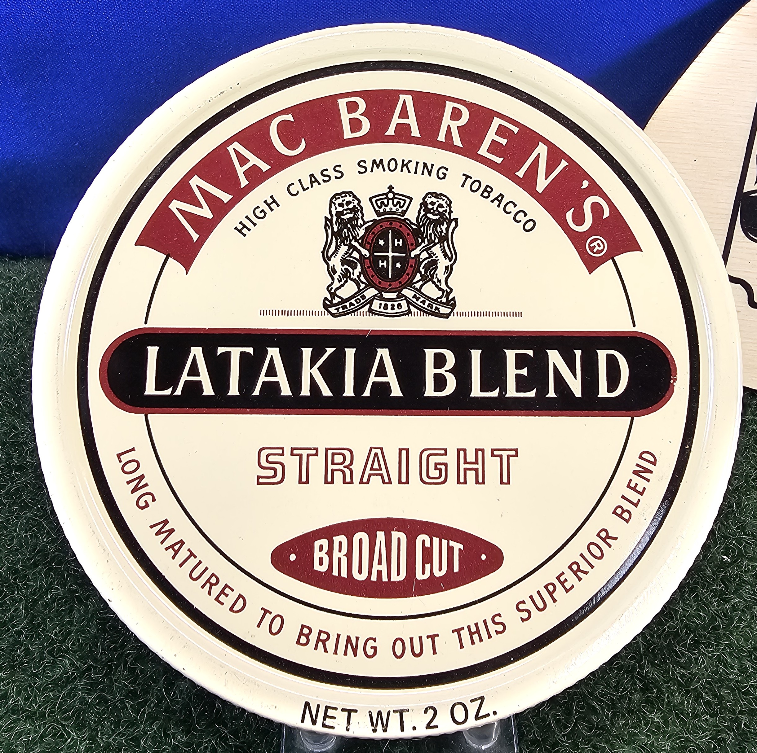 This is a sealed tin of MacBaren's Latakia Blend. Based on the lack of modern additions (UPC and warnings) and the wax pen indicating a price of $2.45, it is estimated as being from the 1970s.