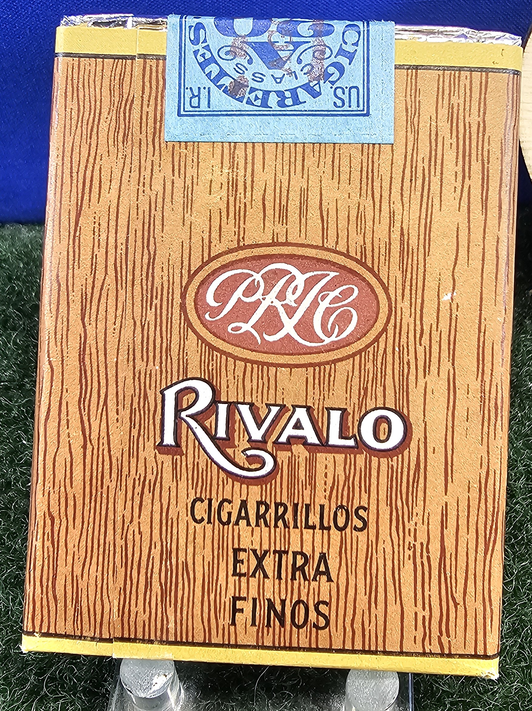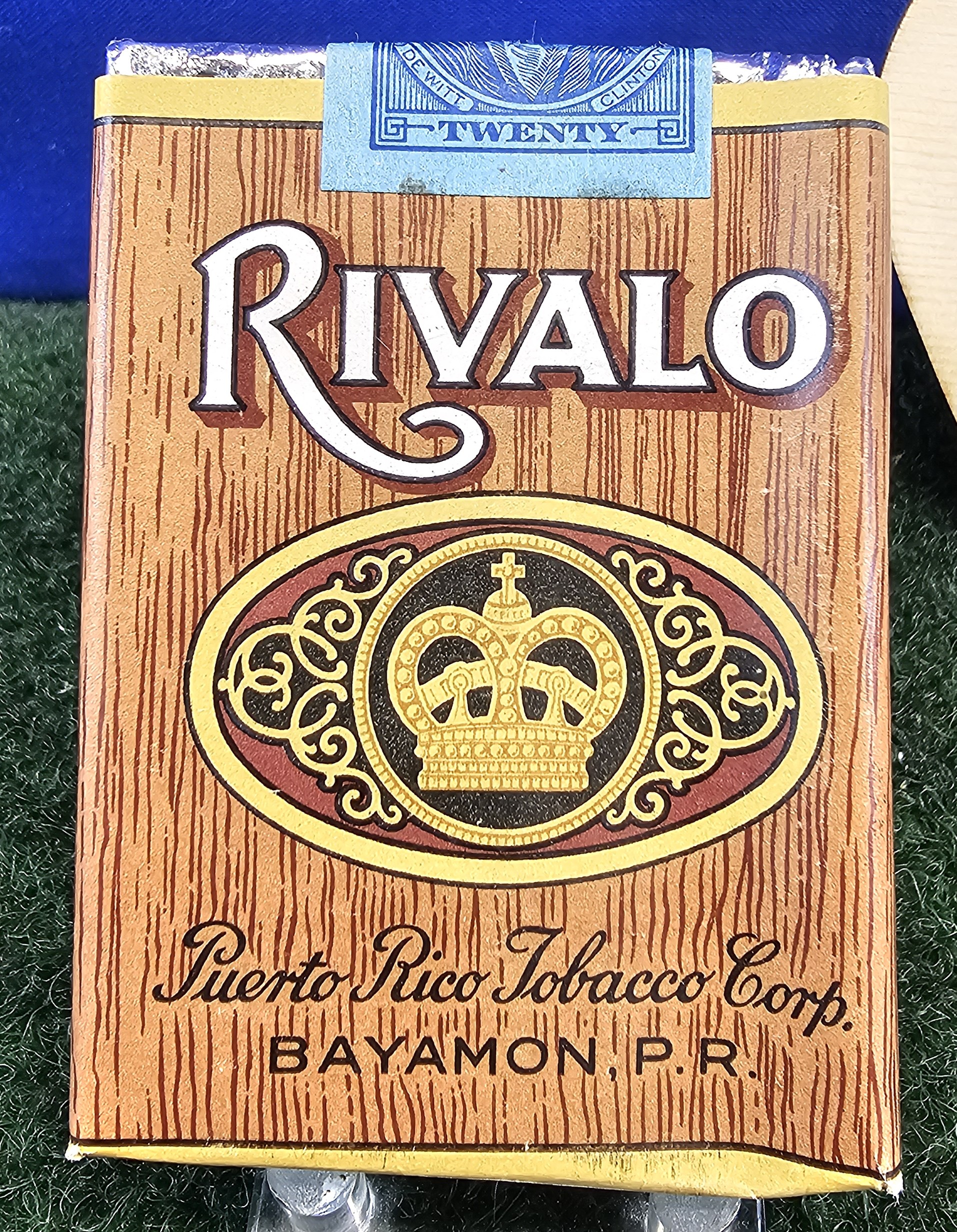 Rivalo cigarettes were made in Puerto Rico. This pack is sealed with the tax stamp present, and was produced in the 1940s.