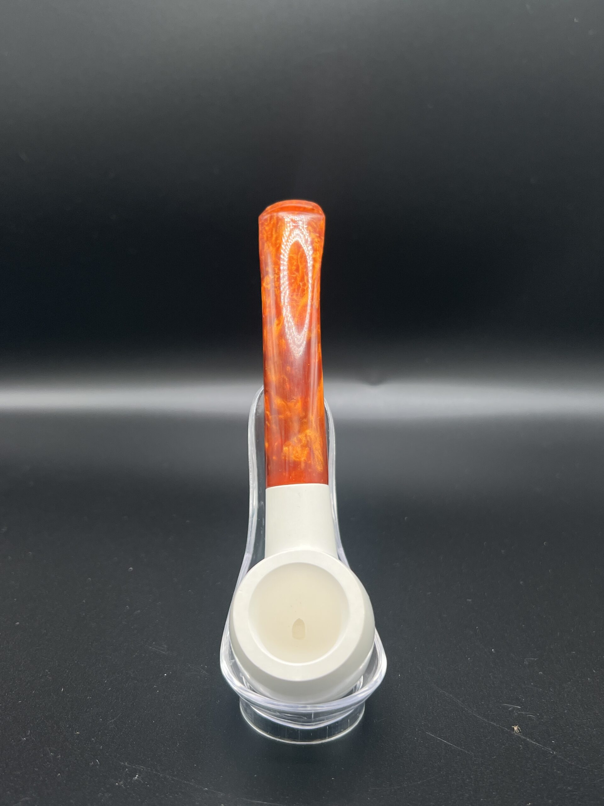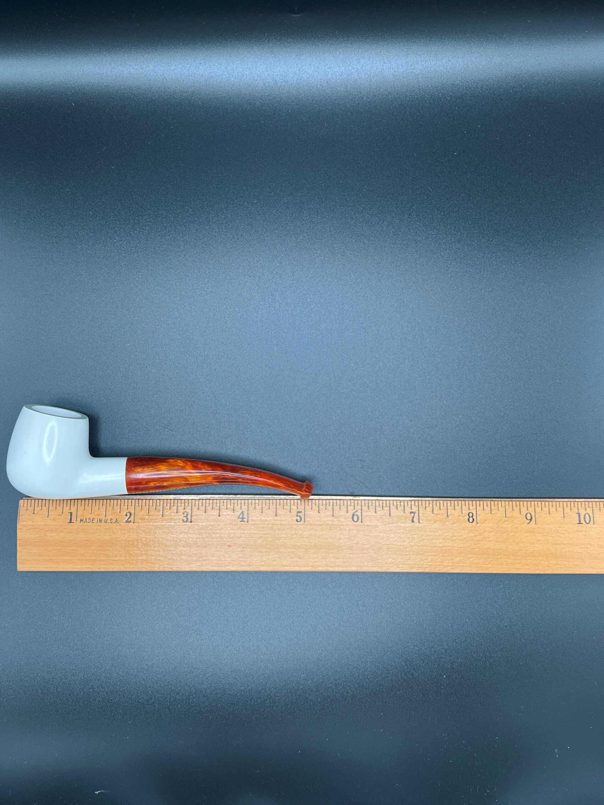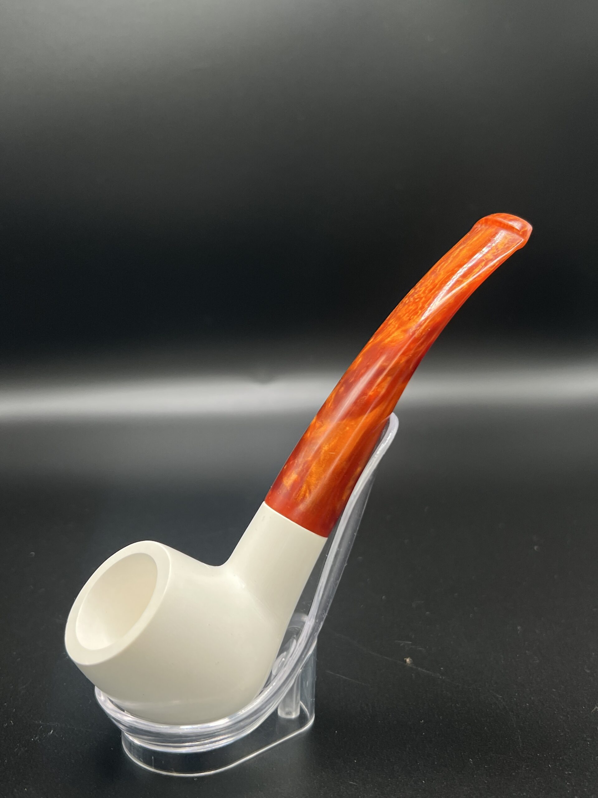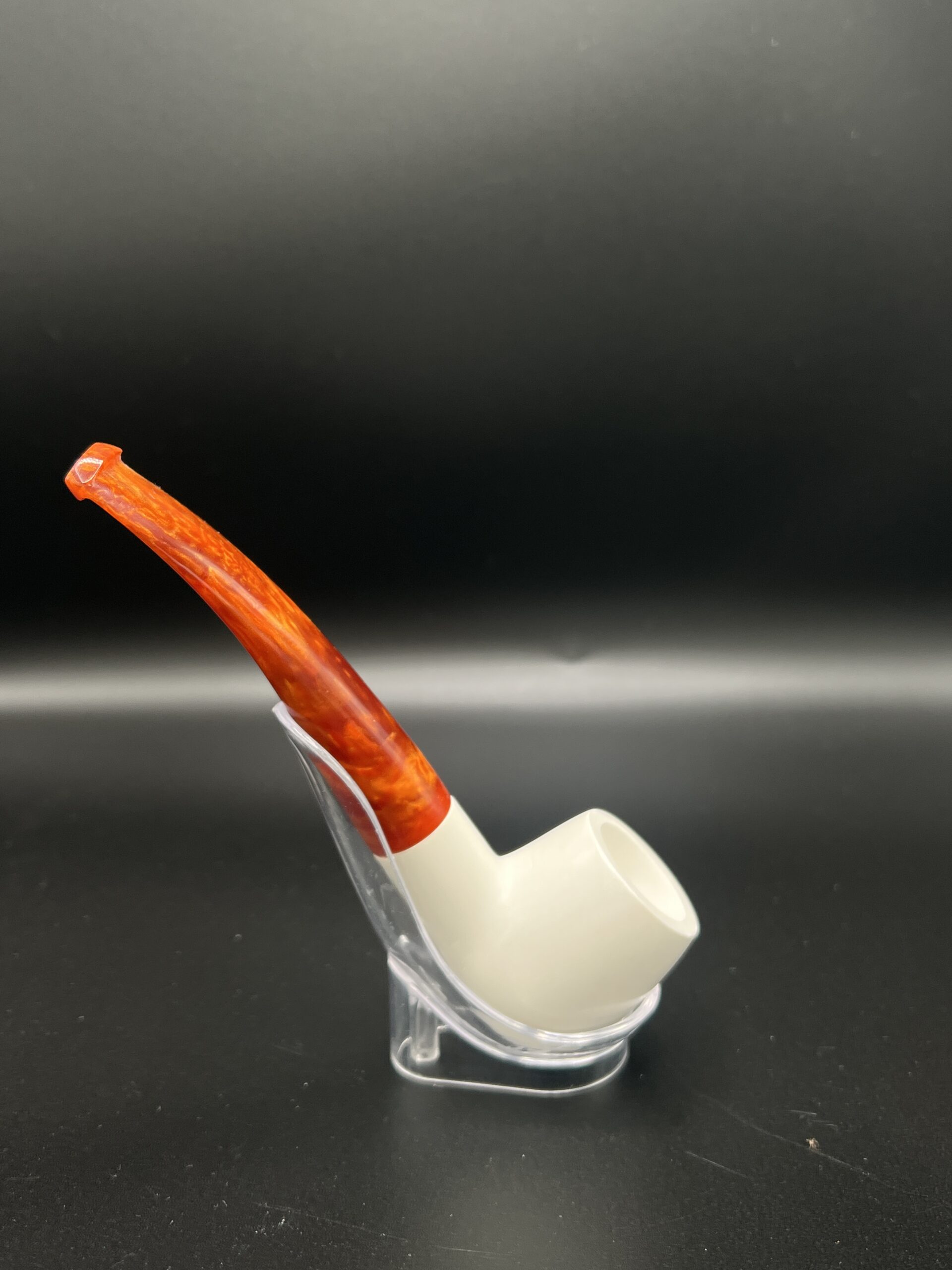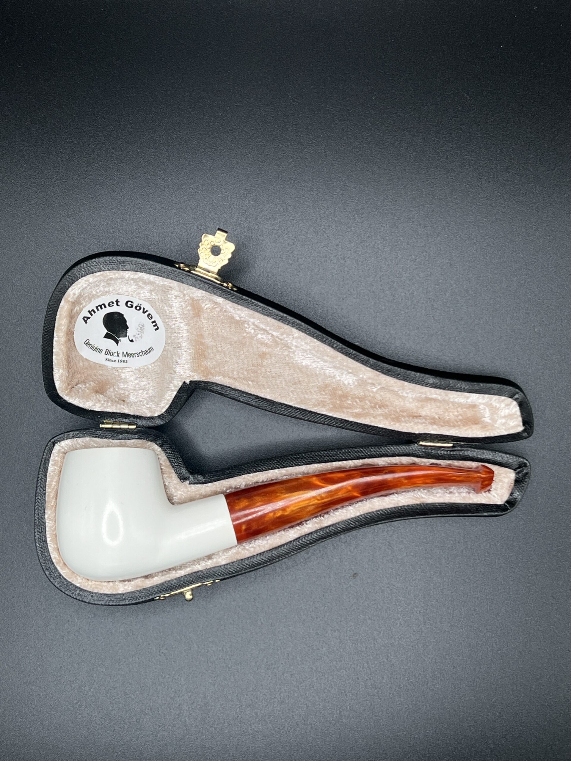 Quarter bent billiard premium block meerschaum pipe with a marbled stem and fitted case made by Ahmet Gövem.