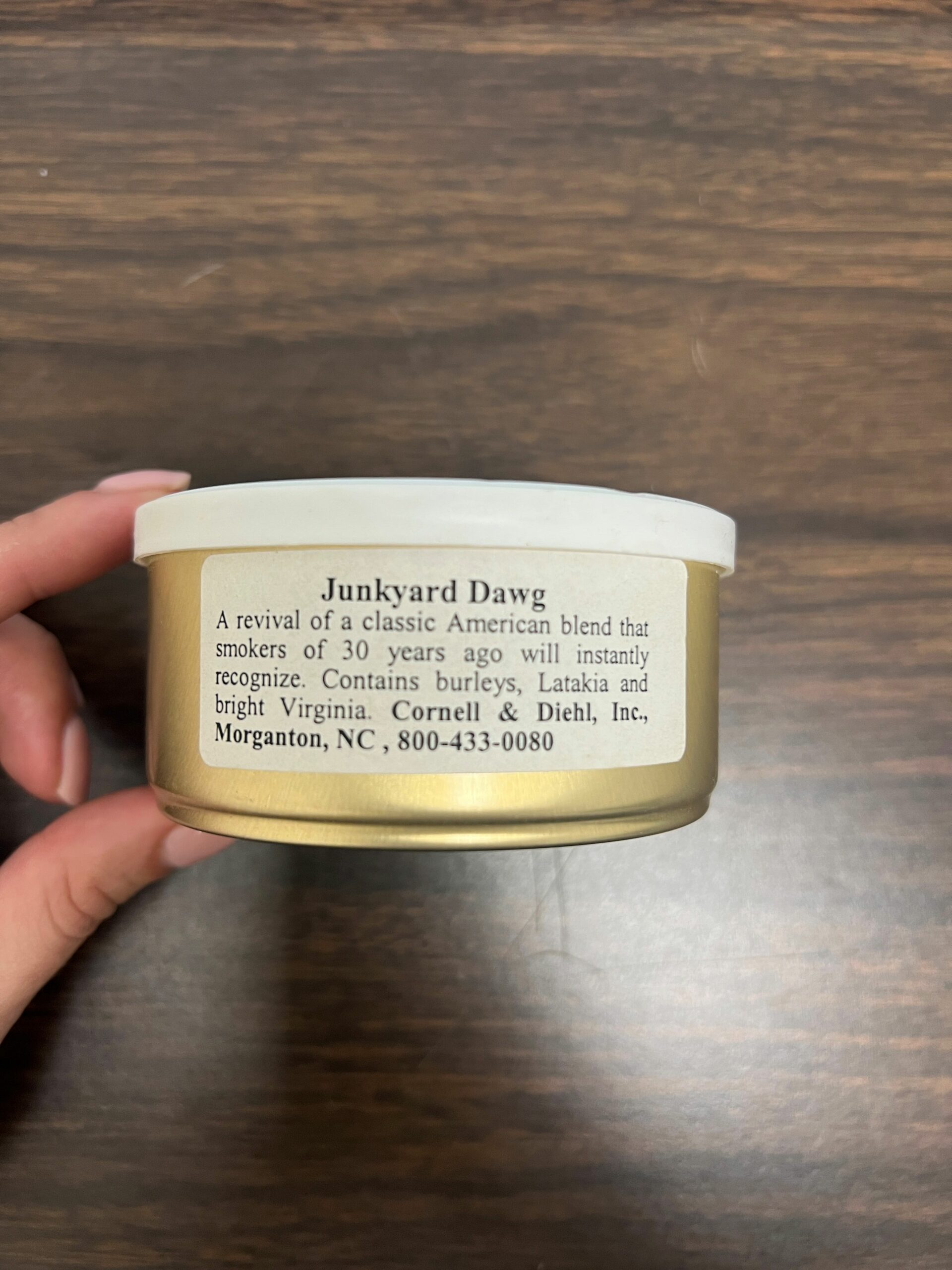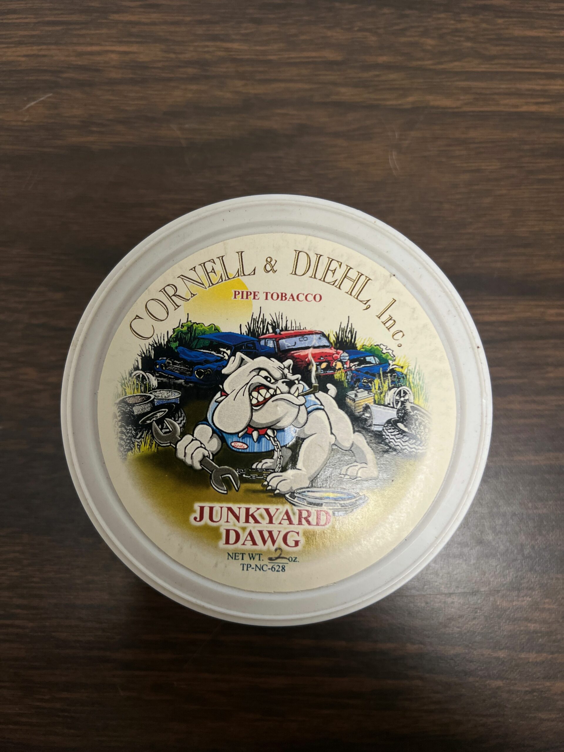 2oz sealed tin of Cornell & Diehl's Junkyard Dawg pipe tobacco from 2003.