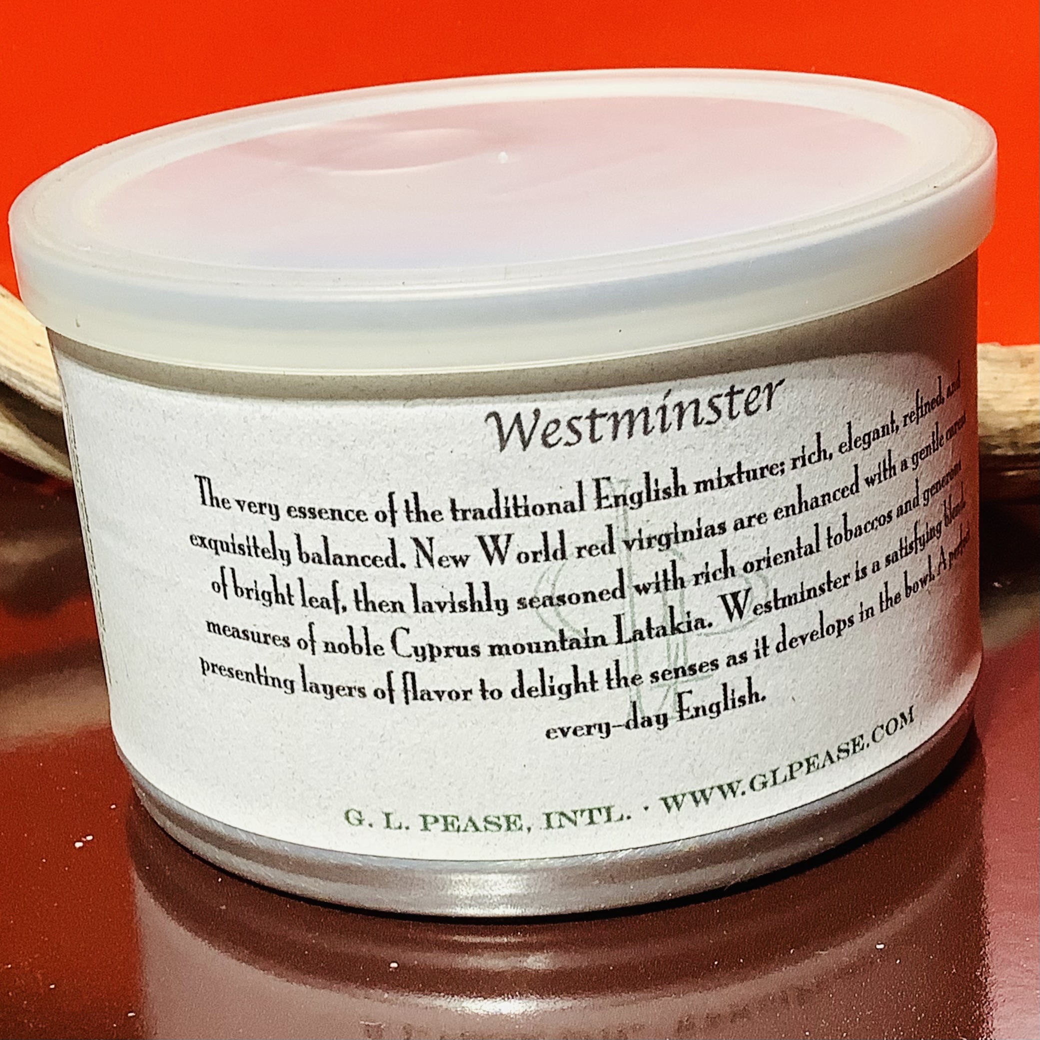The very essence of the traditional English mixture; rich, elegant, refined, and exquisitely balanced. New World red Virginias are enhanced with a gentle caress of bright leaf, then lavishly seasoned with rich oriental tobaccos and generous measures of noble Cyprus mountain latakia. Westminster is a satisfying blend, presenting layers of flavor to delight the senses and develop in the bowl. A perfect everyday English mixture.