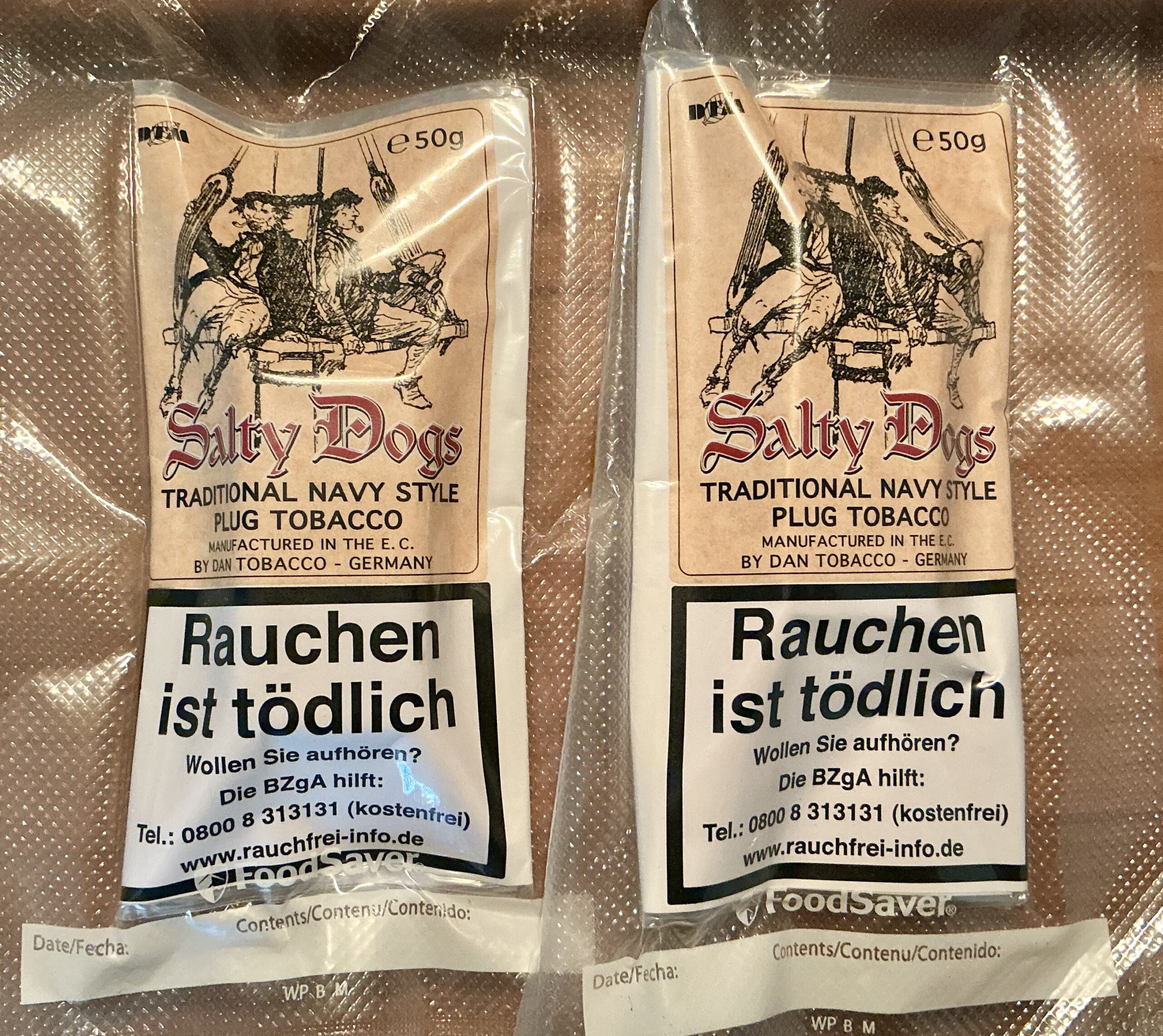 In long gone times, when imposing sail ships crossed the Seven Seas, English sailors were popularly called "Salty Dogs". They always took care to have a pocket sized block of sweet Virginia tobacco with them, which they would take a slice off to then rub out and smoke in their cutty pipes. In heavy weather, they would opt to just bite off a corner to enjoy as a stimulating piece of chewing tobacco. Selected sweet Virginias with a small pinch of perique, classically enhanced with Caribbean rum, are matured over a long time in the press. The result is a dark brown, full and pleasant pipe tobacco in traditional style offering you a comfortably cool and smooth smoking experience. Unlike ordinary flakes, it was not cut into slices, but packaged as a solid piece of real plug tobacco. Enjoy it in pipes with smaller bowls. (translated from Dan Tobacco's website)