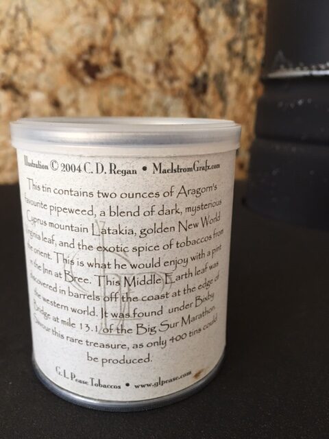 "Aragorn's favorite pipeweed, a blend of dark, mysterious Cyprus mountain Latakia, golden New World Virginia leaf, and the exotic spice of tobaccos from the Orient."