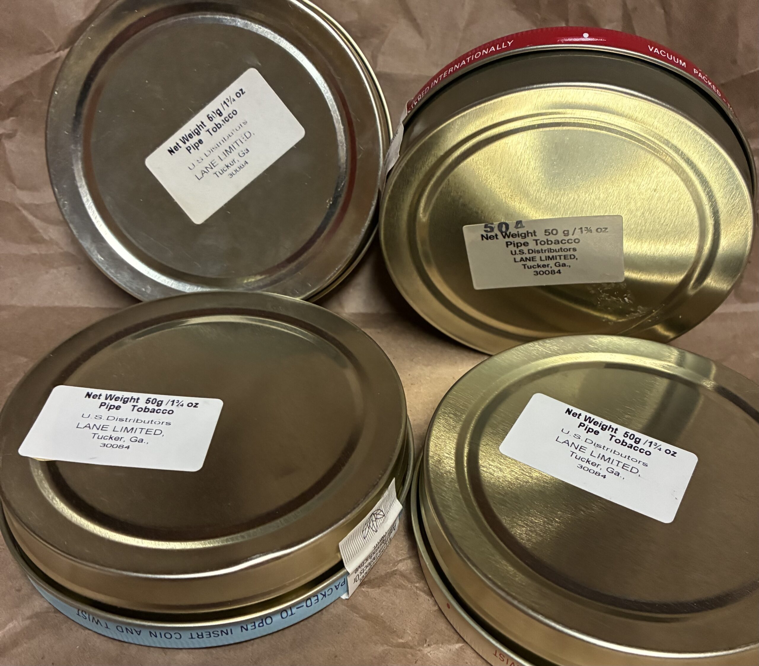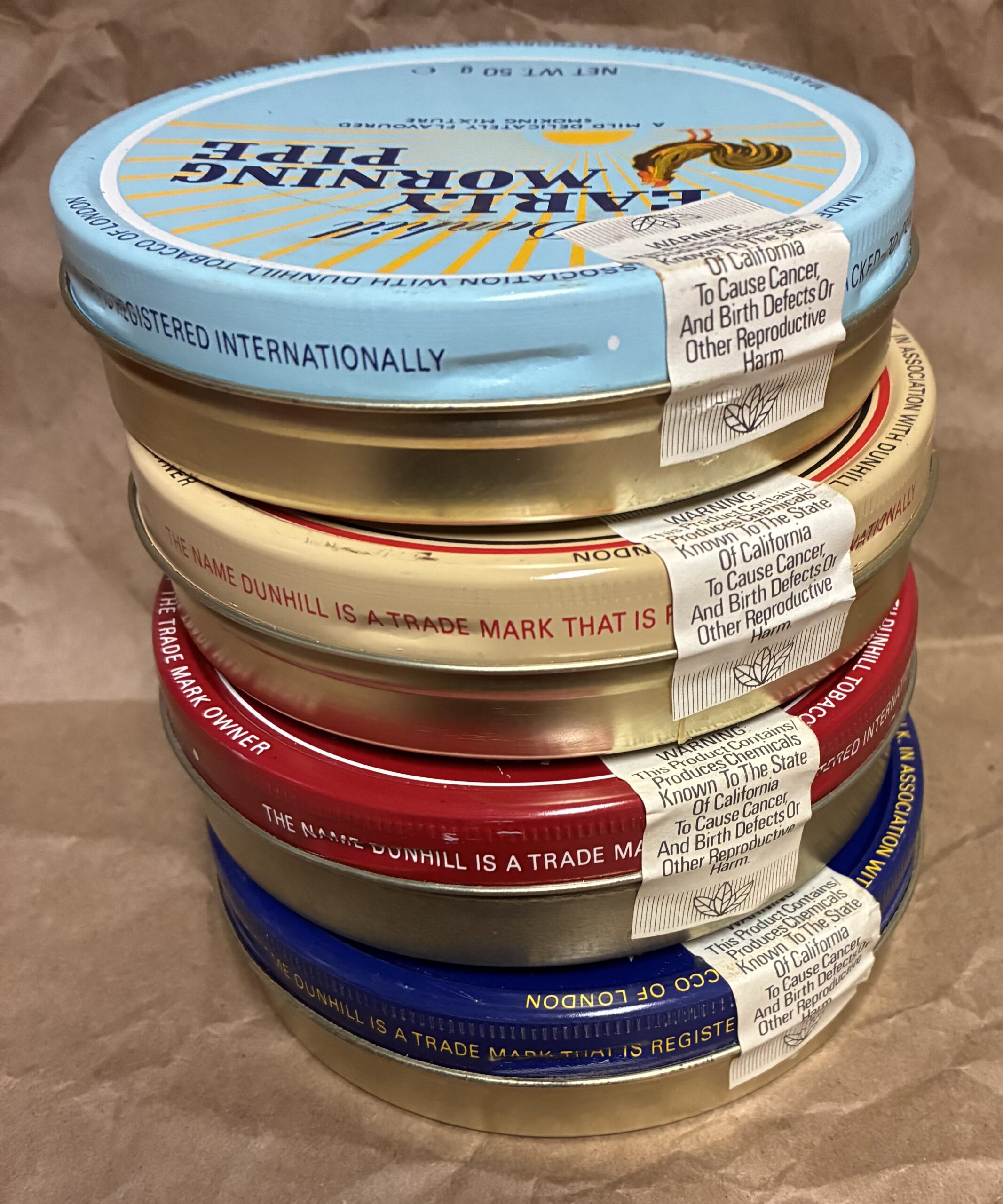 This auction is for all 4 tins of Dunhill: My Mixture 965, Early Morning Pipe, Nightcap, London Mixture. All painted lid tins from Lane Limited era. Sealed and kept indoors.