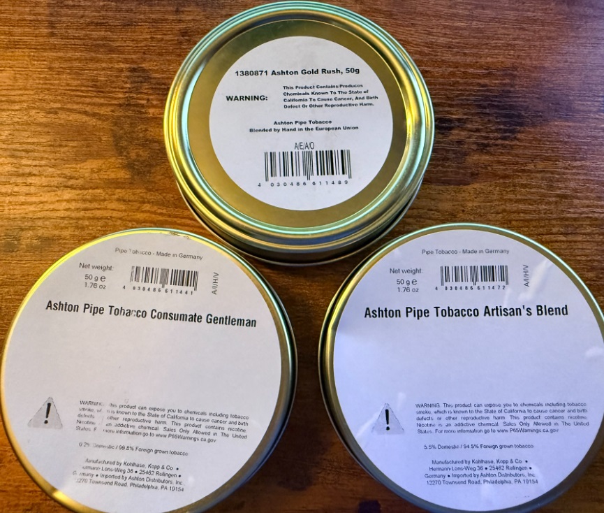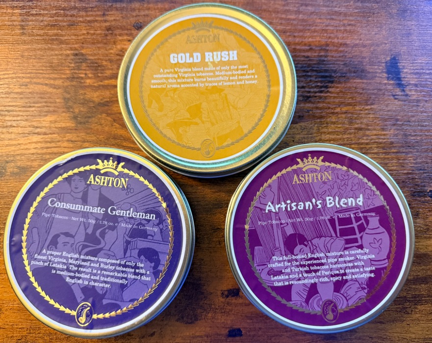 Three unopened tines of Ashton Tobacco: Consummate Gentleman ( 2022 ), Artisan Blend ( 2022 ), & Gold Rush ( 2014 )