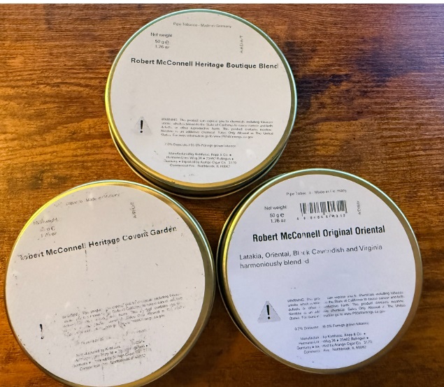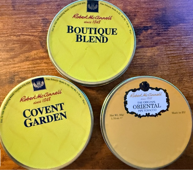 Three unopened tines of Robert McConnell Tobacco from 2022: Boutique Blend, Covent Garden & Original Oriental