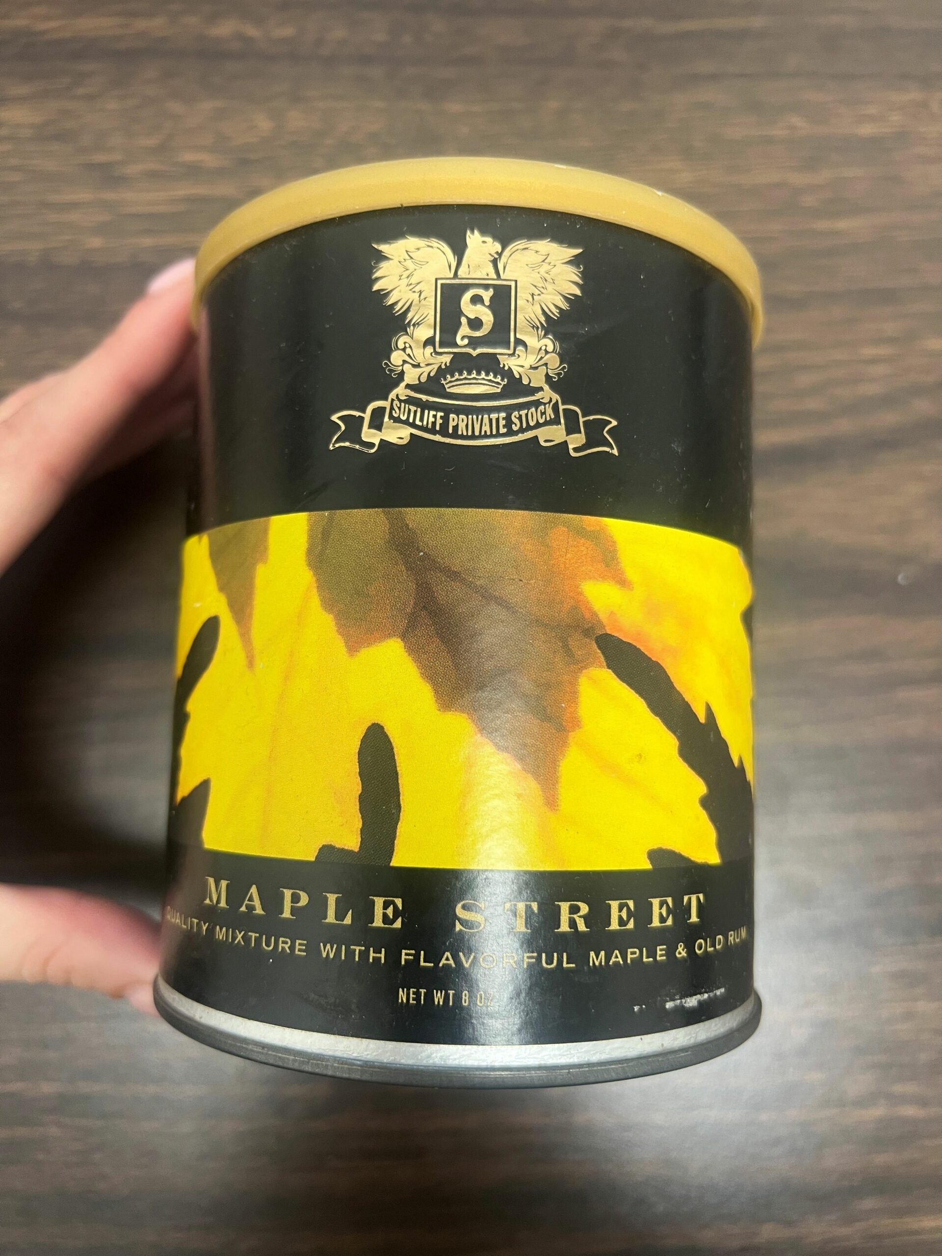 8oz sealed tin of Sutliff's Private Stock Maple Street pipe tobacco.