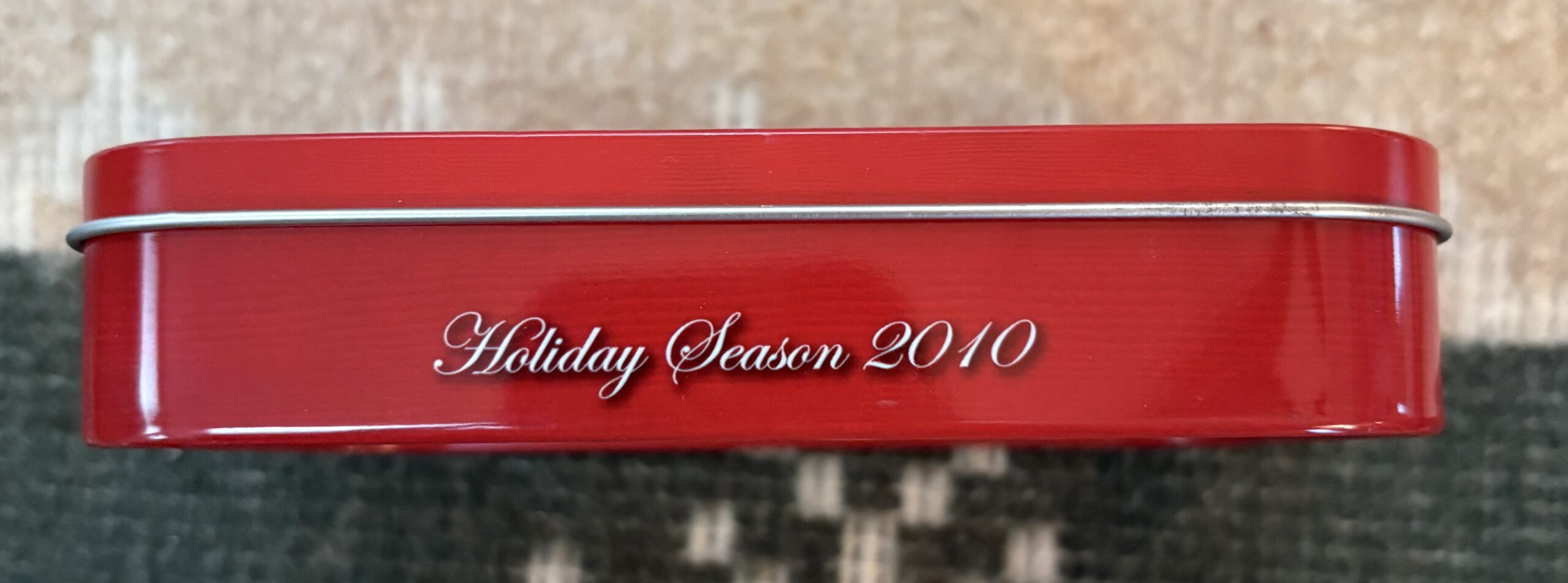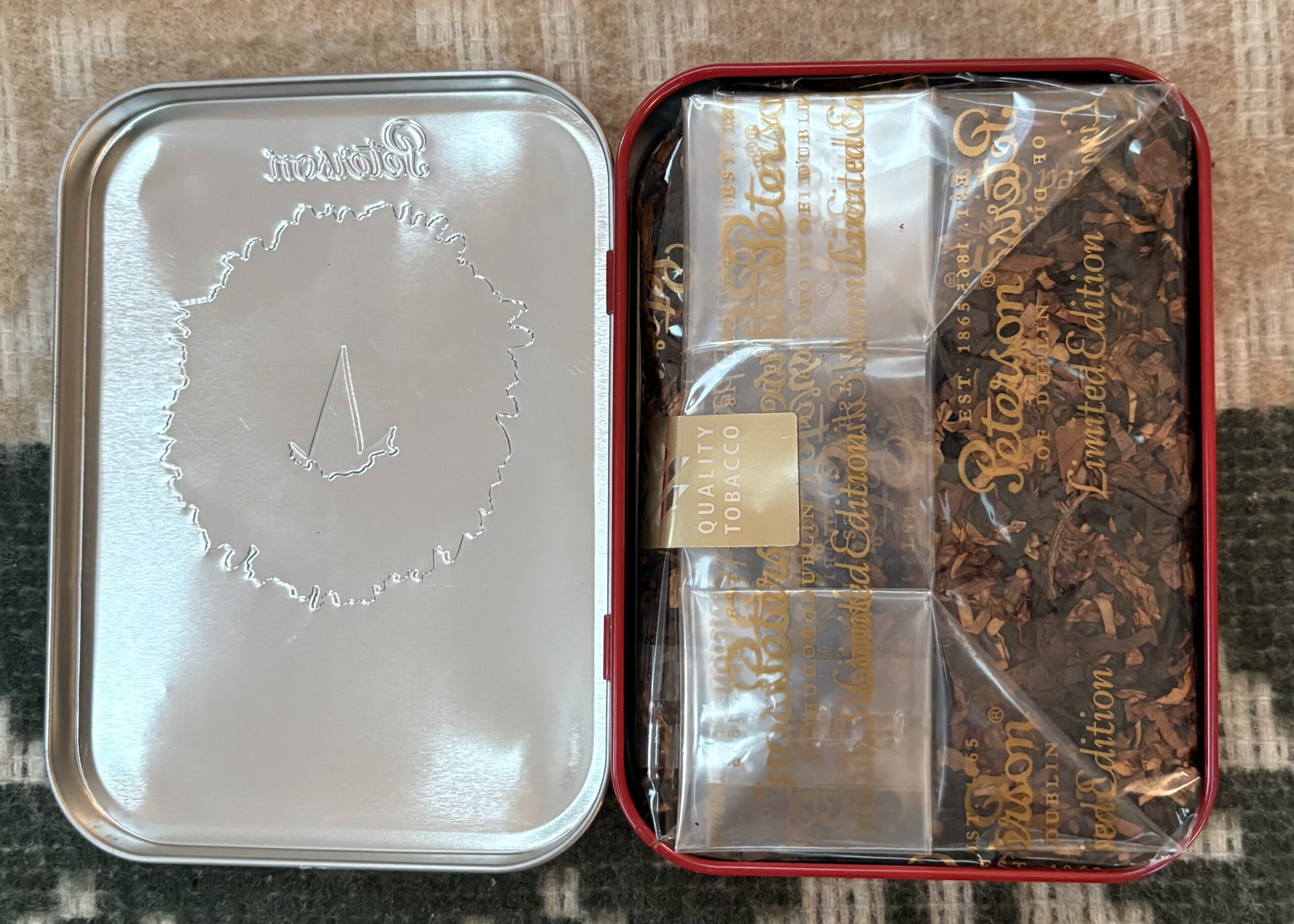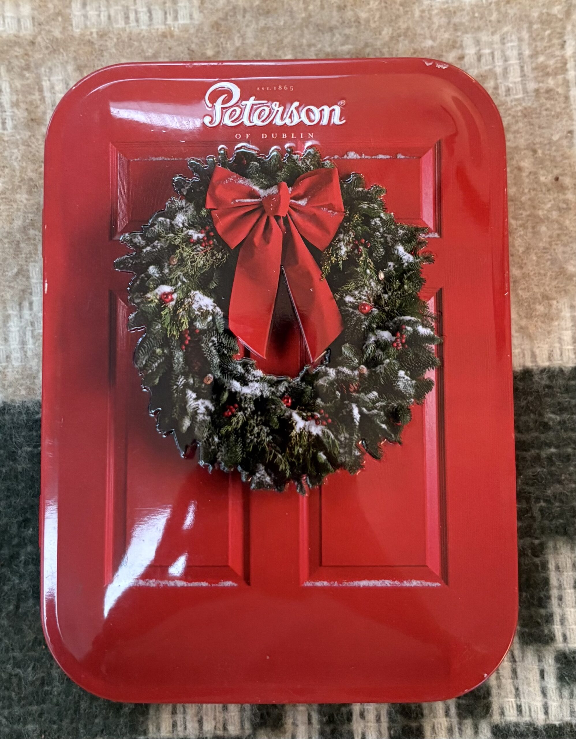 Out of production Peterson 2010 Christmas blend in factory Tin. 100g quantity. Note the bag still has the factory seal sticker. We cannot attest to the tobacco as it is an aromatic. The tin is highly collectable.