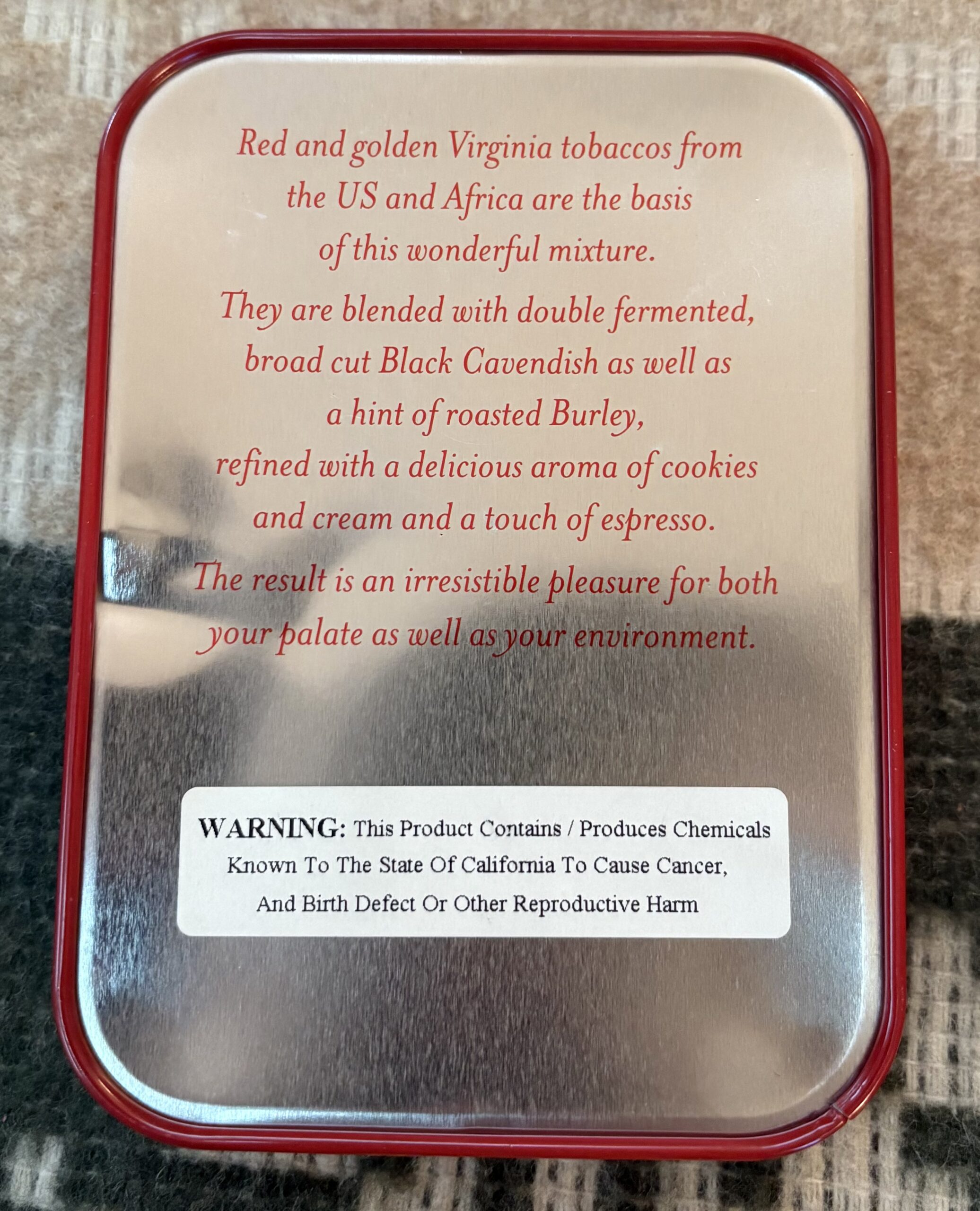 Red and Golden Virginia tobaccos from the US and Africa are the basis of this wonderful mixture. They are blended with double fermented, broad cut Black Cavendish as well as a hint of roasted Burley, refined with a delicious aroma of cookies and cream and a touch of espresso. The result is an irresistible pleasure for both your palate as well as your environment.
