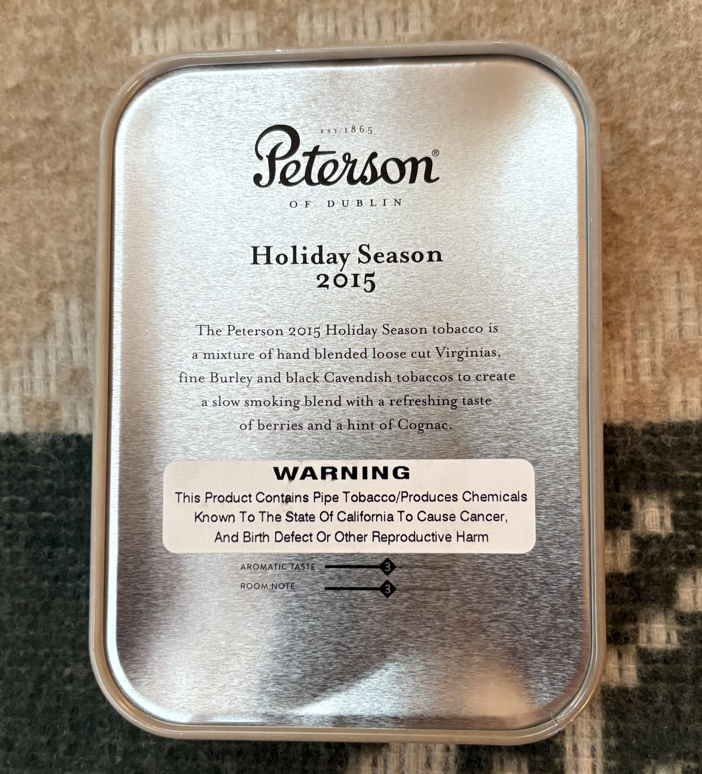 Peterson's 2015 Holiday Season is a smoking mixture of hand-blended Virginias, Burley, and black Cavendish topped with a refreshing combination of berry and cognac
